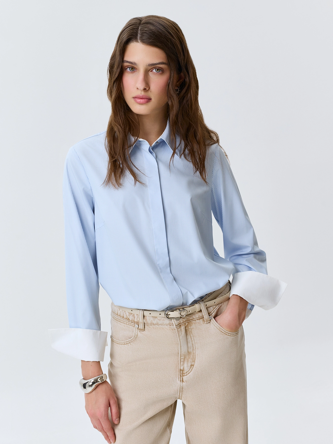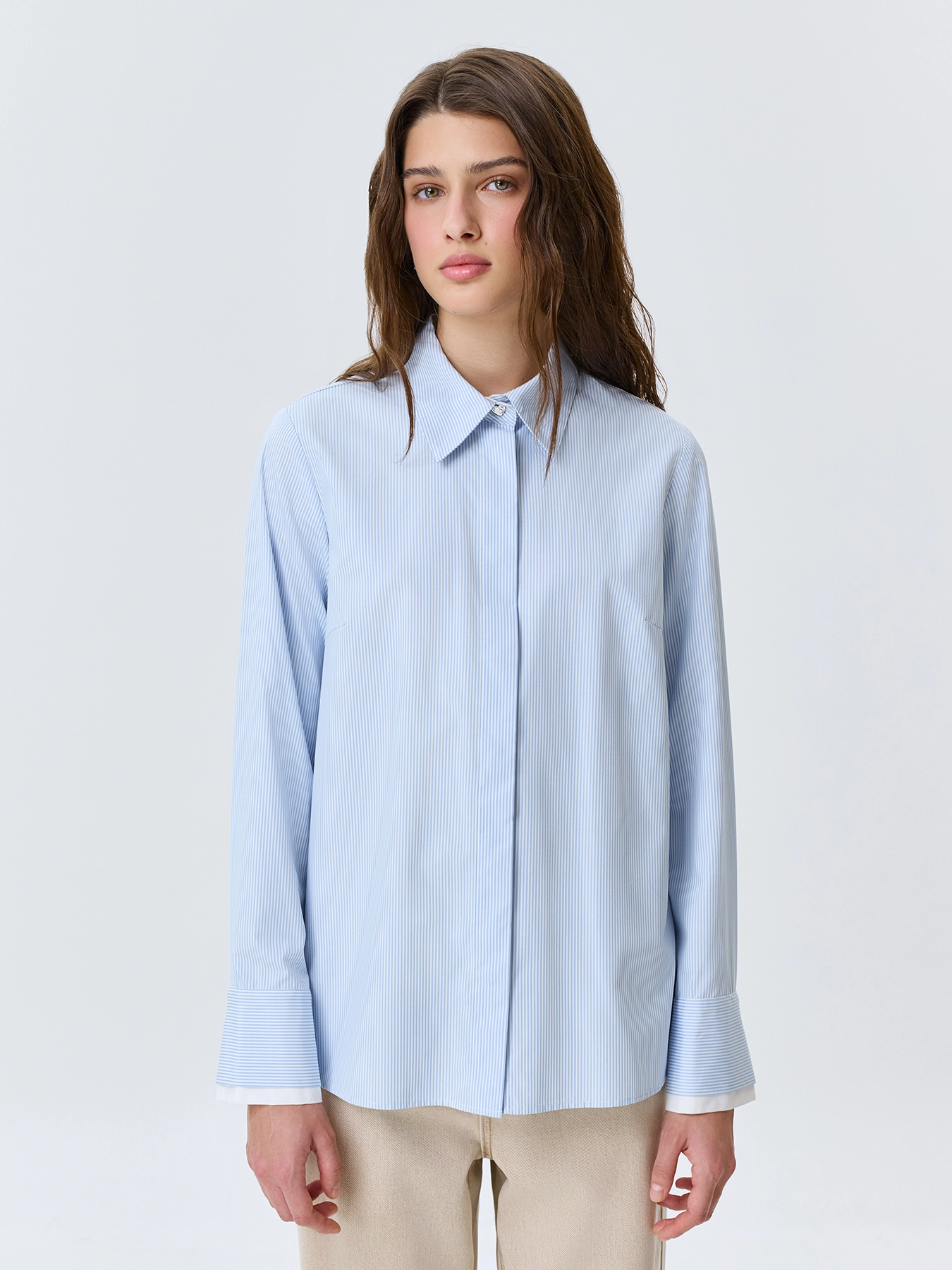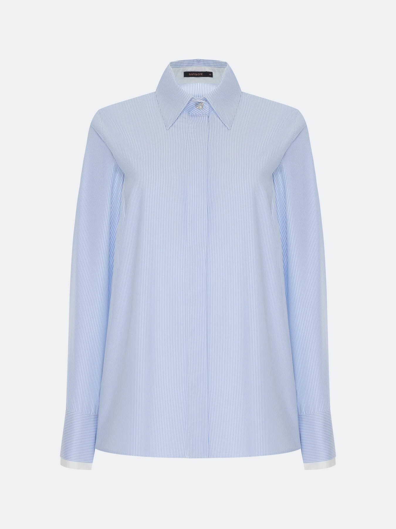 Базовая блузка из смесового бамбукового волокна. Прямой силуэт. Отложной воротник с контрастной подкладкой. Застежка на пуговицы. Длинные втачные рукава с контрастными манжетами по низу. Дополнена вытачками на груди для лучшей посадки.
