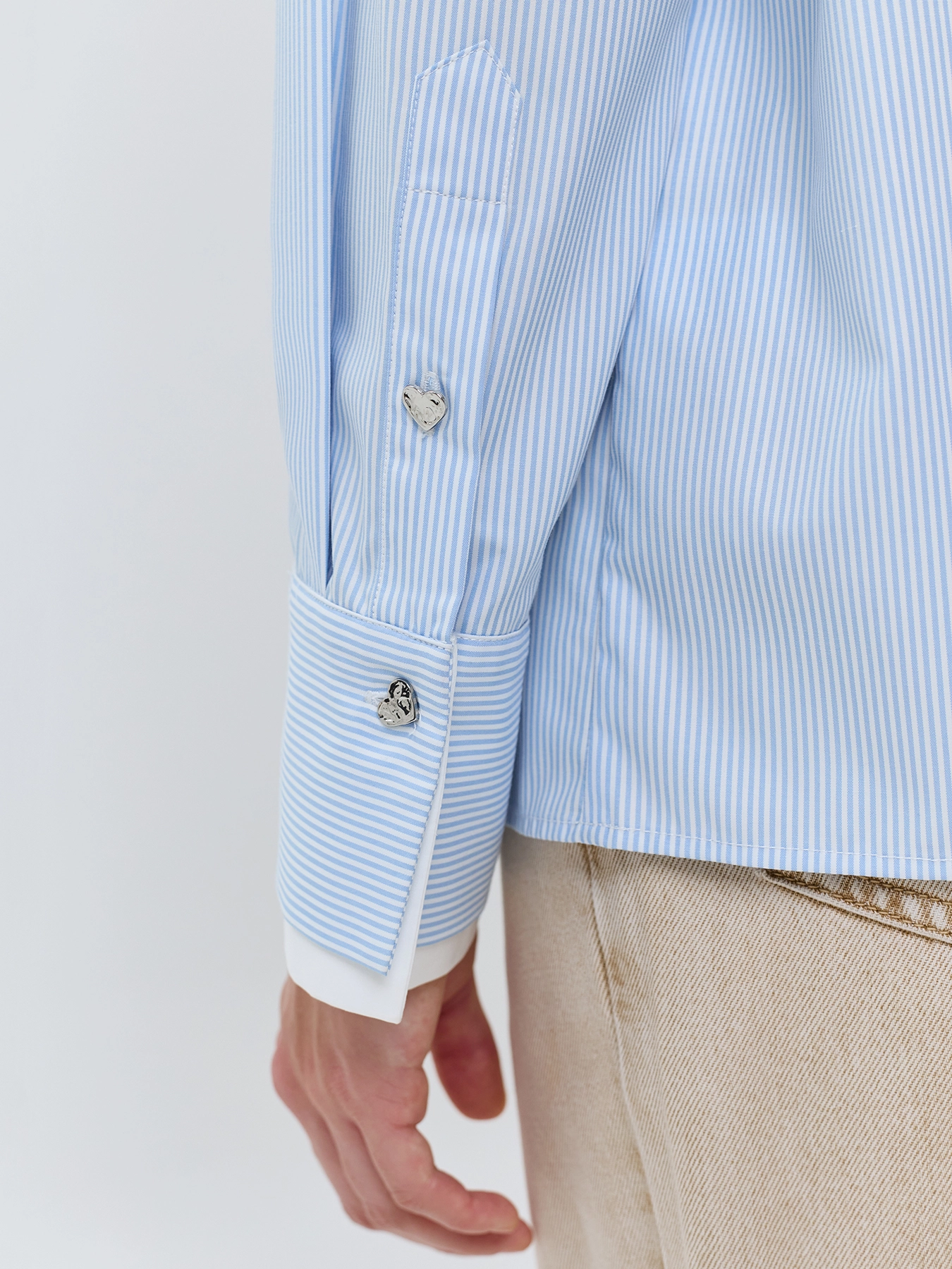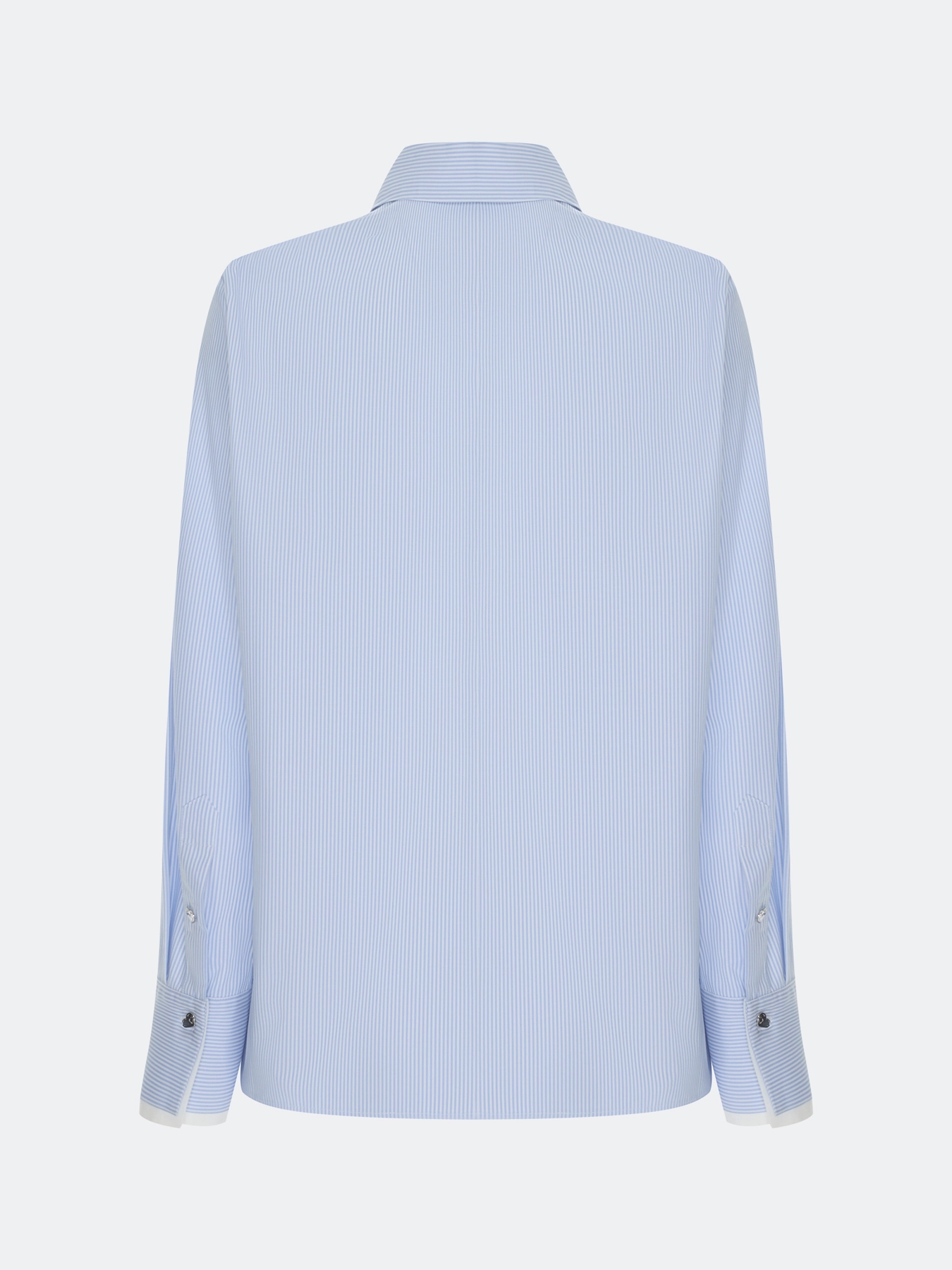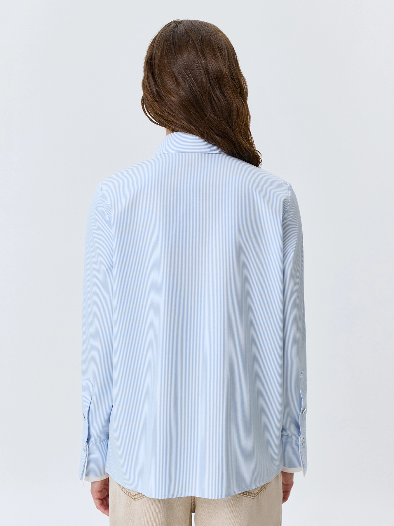 Базовая блузка из смесового бамбукового волокна. Прямой силуэт. Отложной воротник с контрастной подкладкой. Застежка на пуговицы. Длинные втачные рукава с контрастными манжетами по низу. Дополнена вытачками на груди для лучшей посадки.