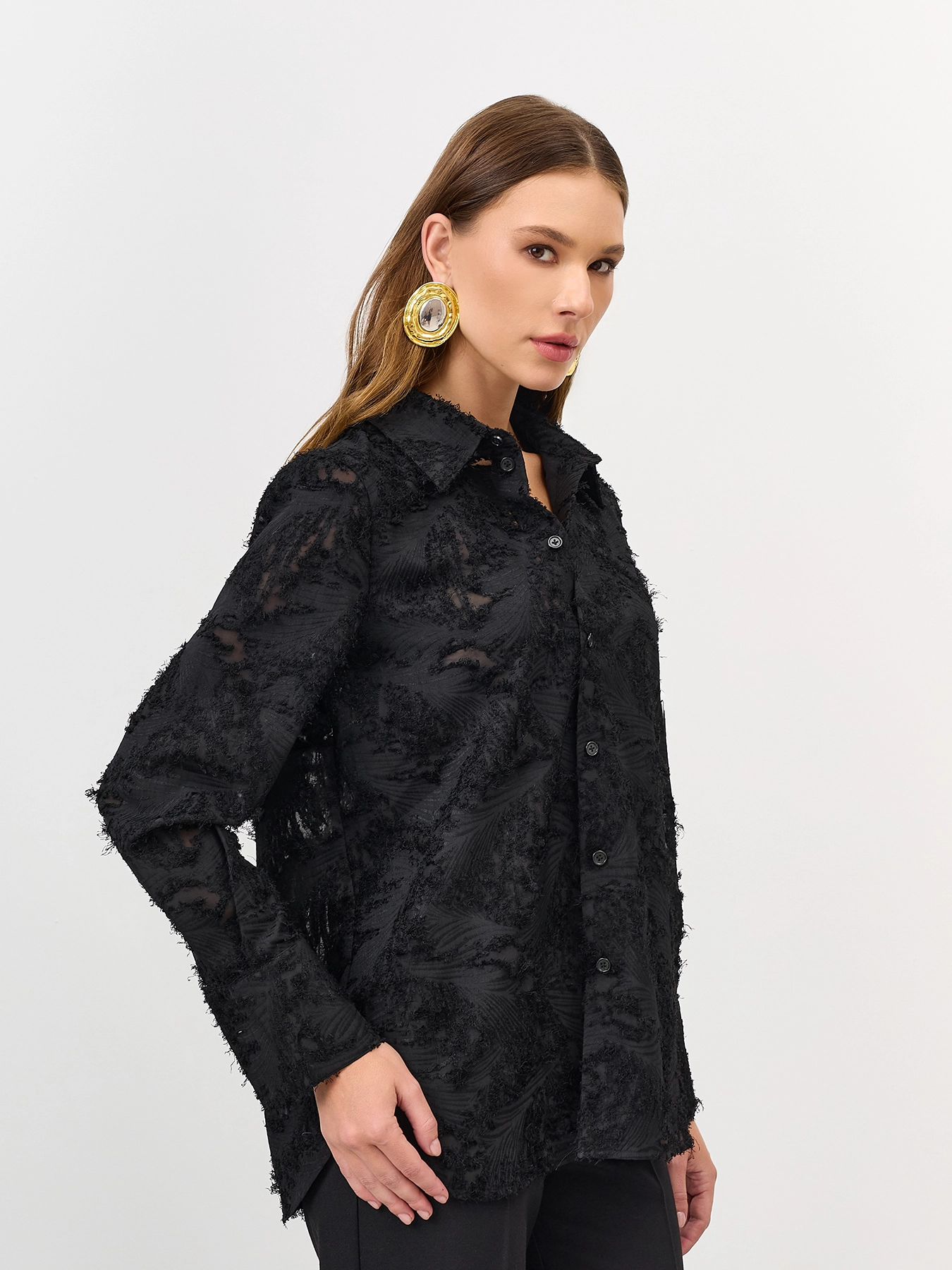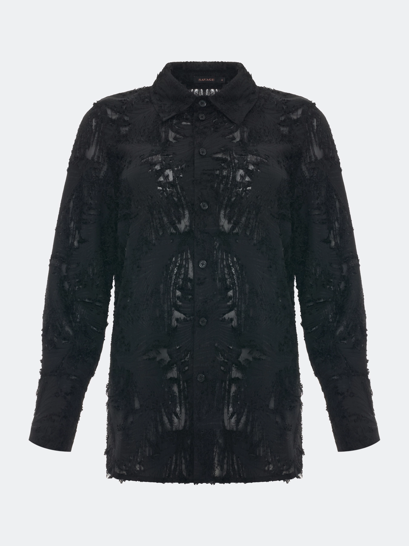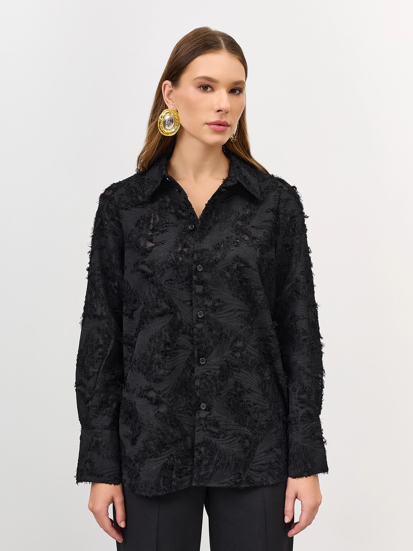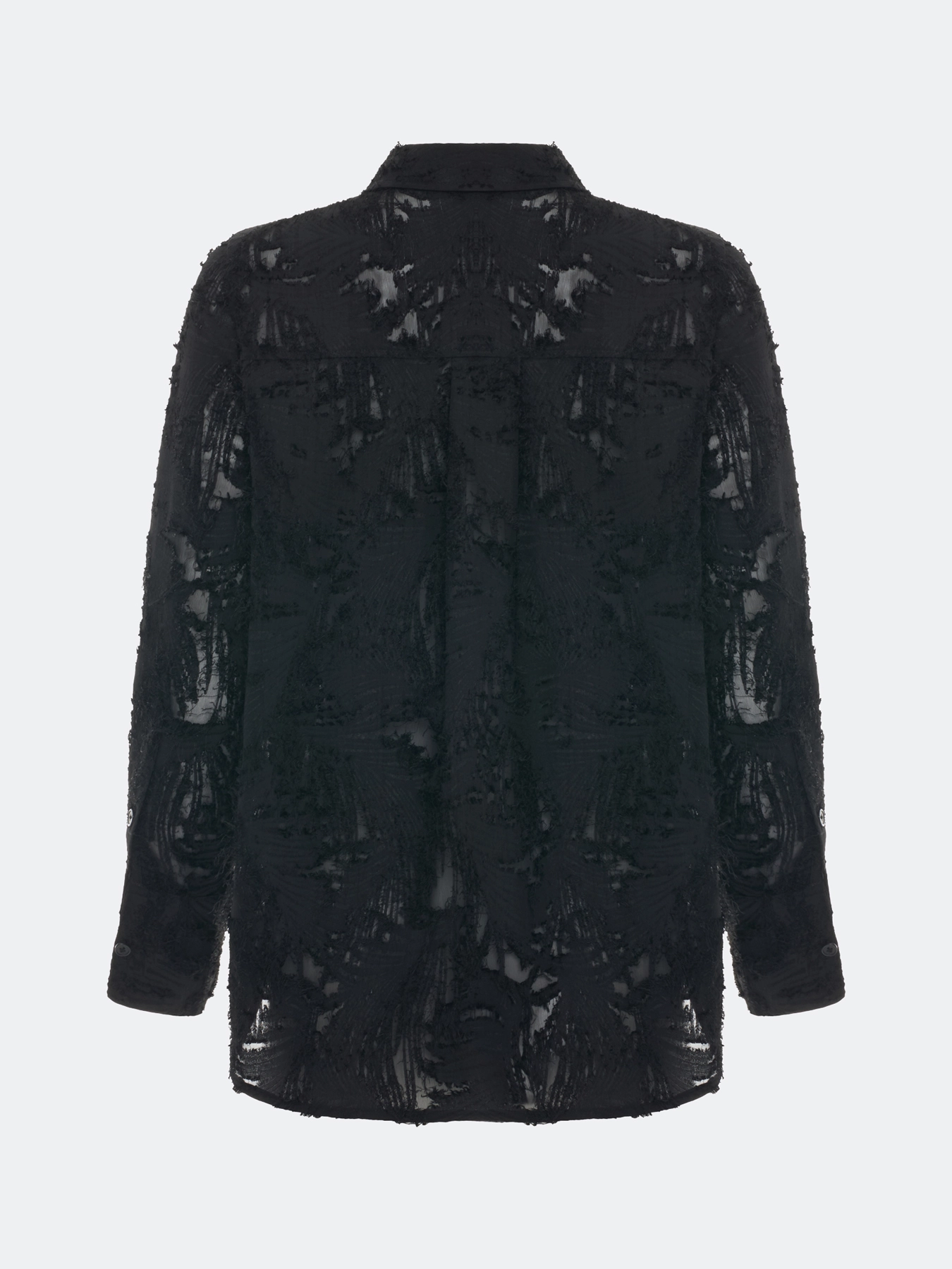 Блузка из фактурной ткани с ажурными вставками. Свободный силуэт. Отложной воротник. Застежка на пуговицы. Широкие манжеты по низу рукавов.