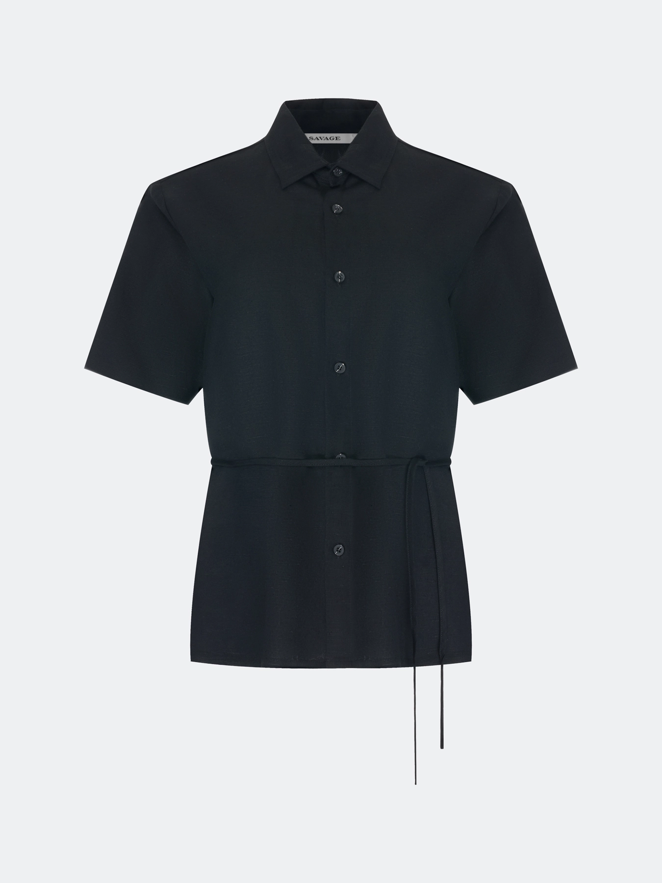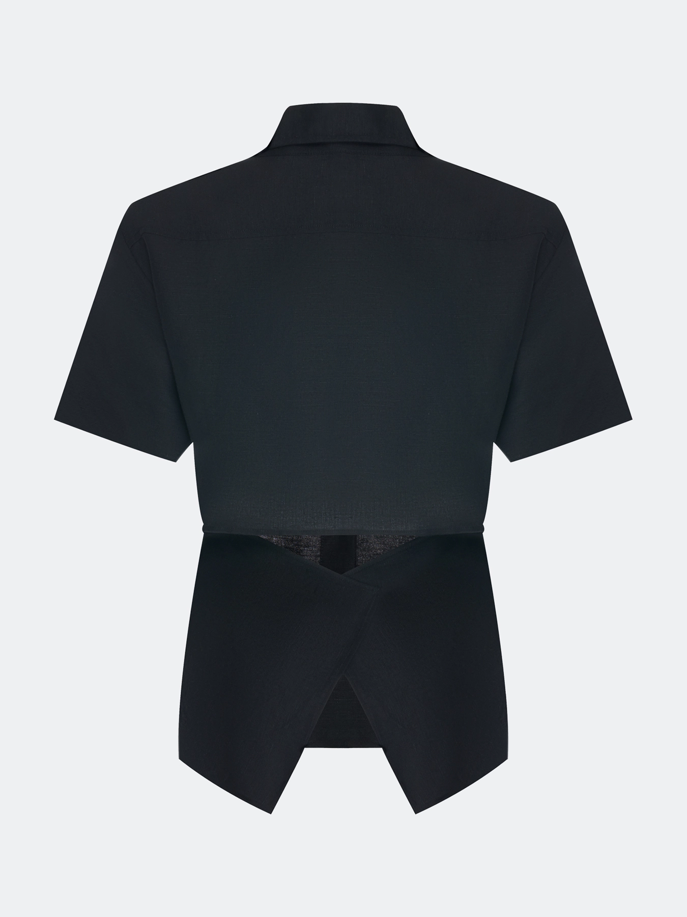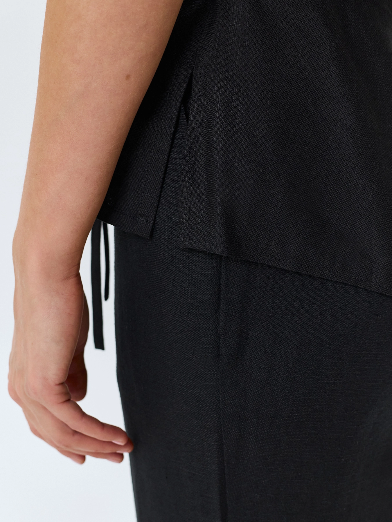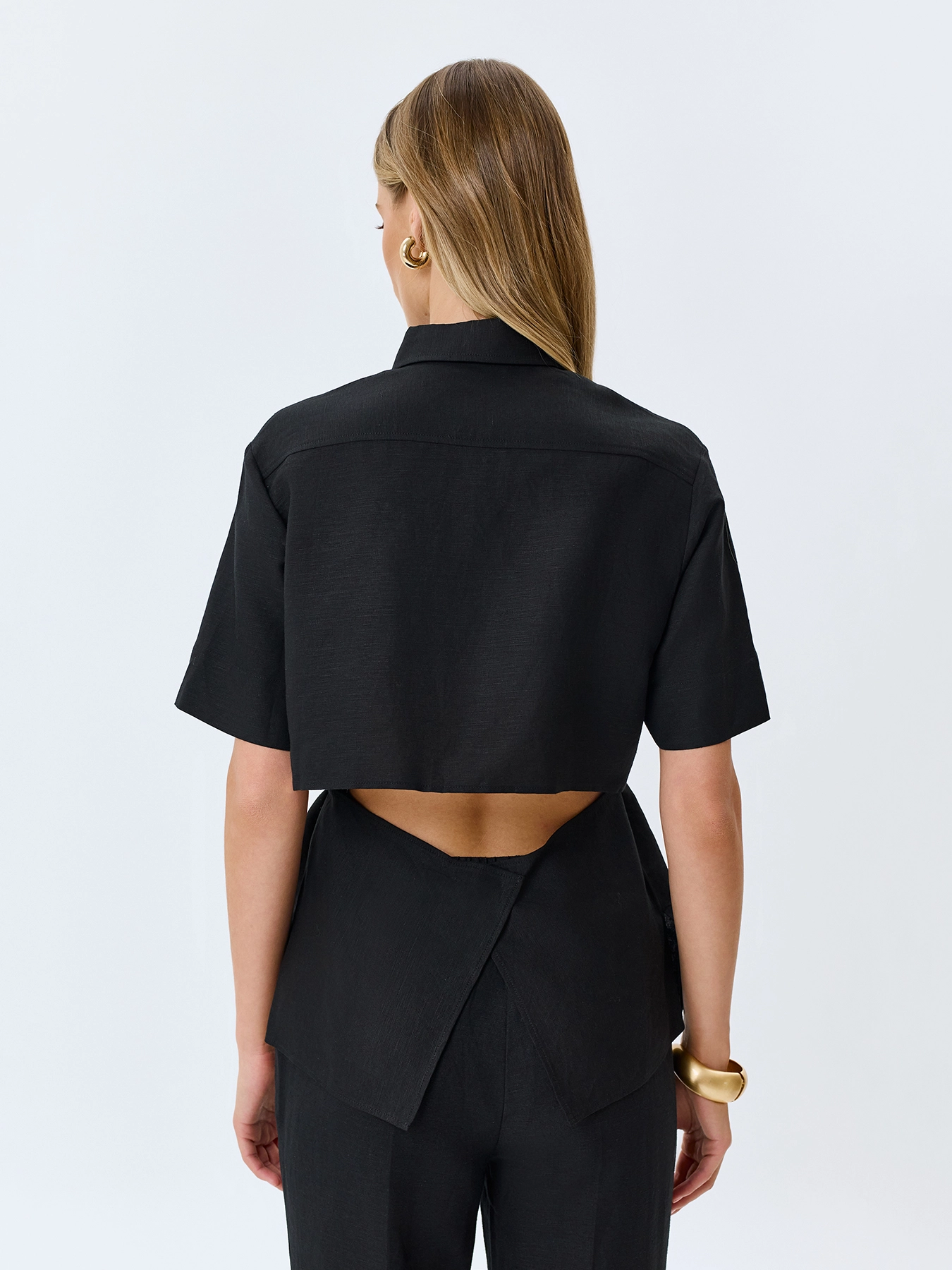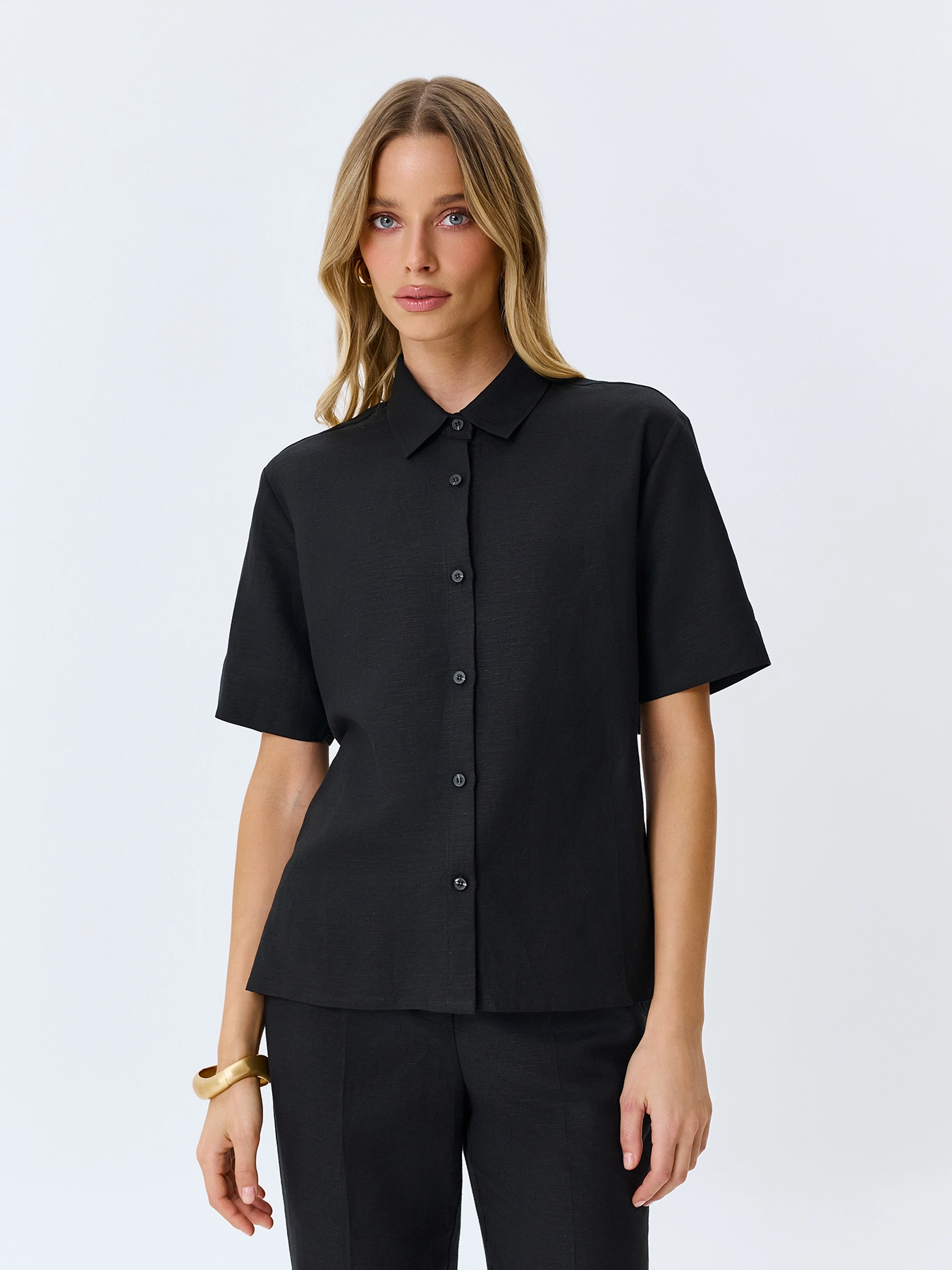 Блузка с акцентным разрезом на спинке. Приталенный силуэт с тонким поясом. Отложной воротник. Застежка на пуговицы. Линия плеч немного спущена. Широкие укороченные втачные рукава. Спинка немного удлинена. В составе вискоза и лен. Комплект с 63431.