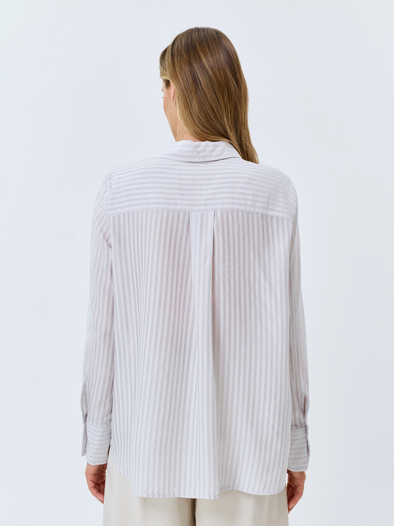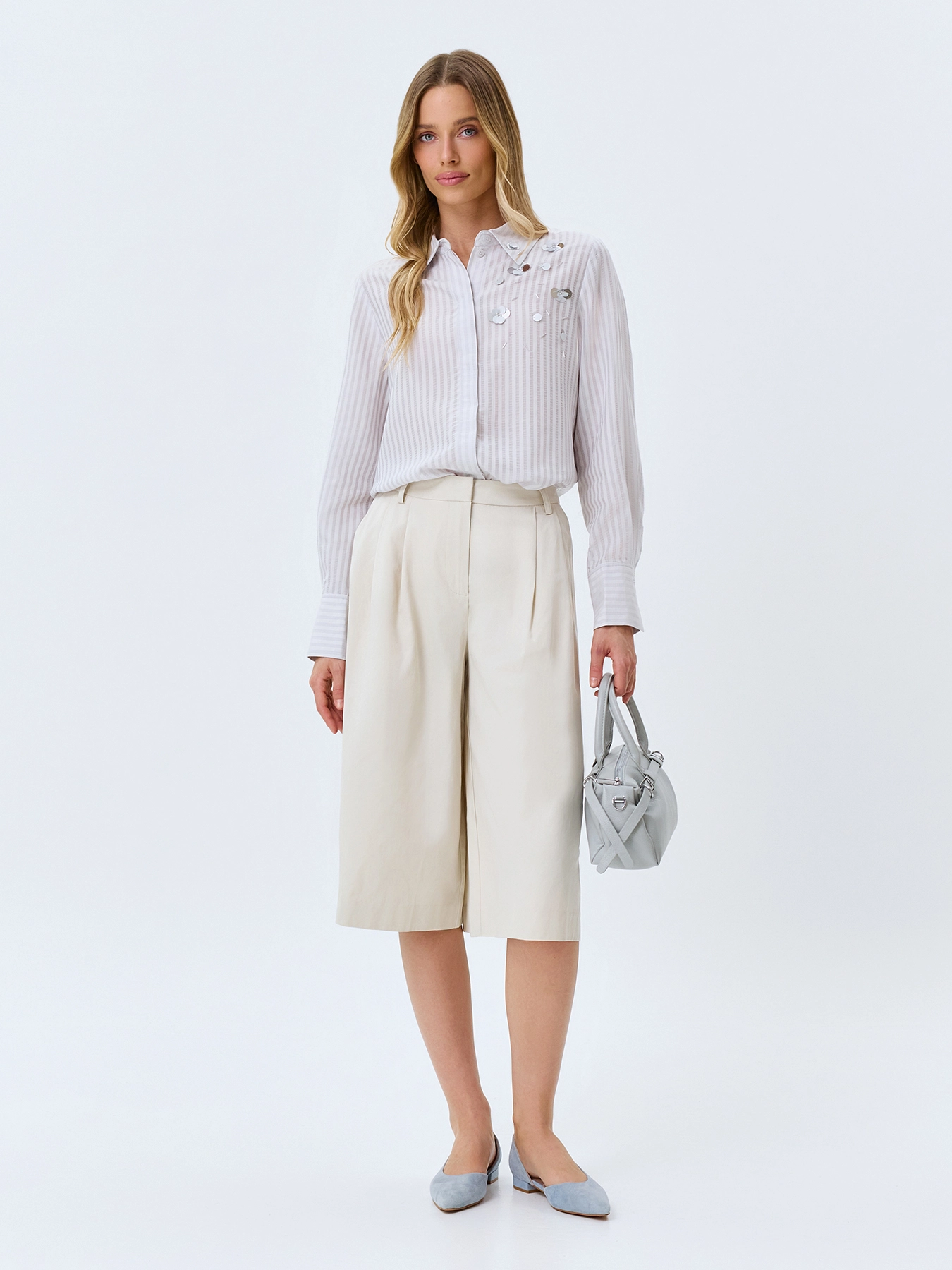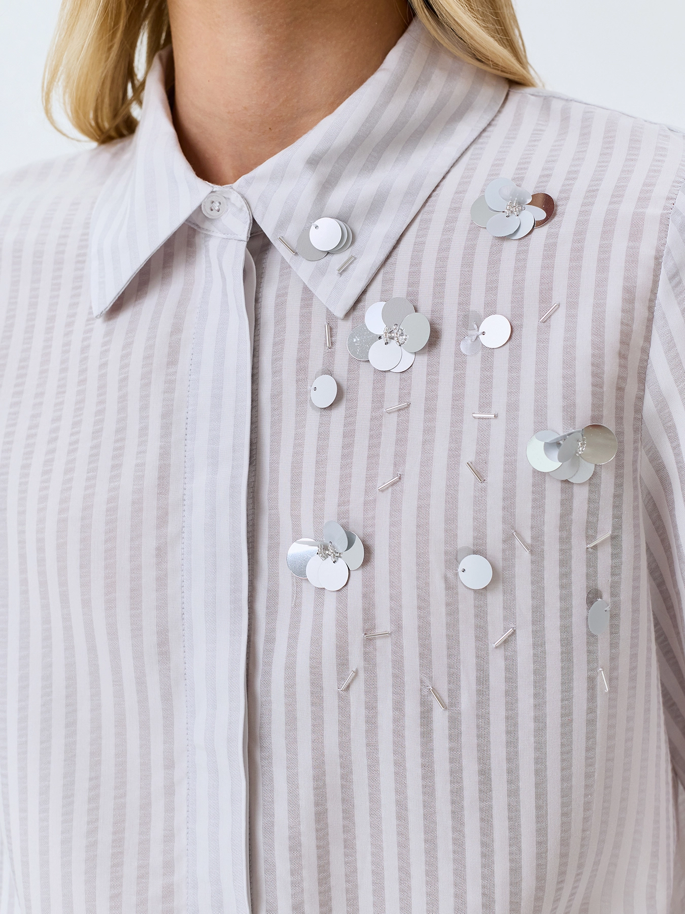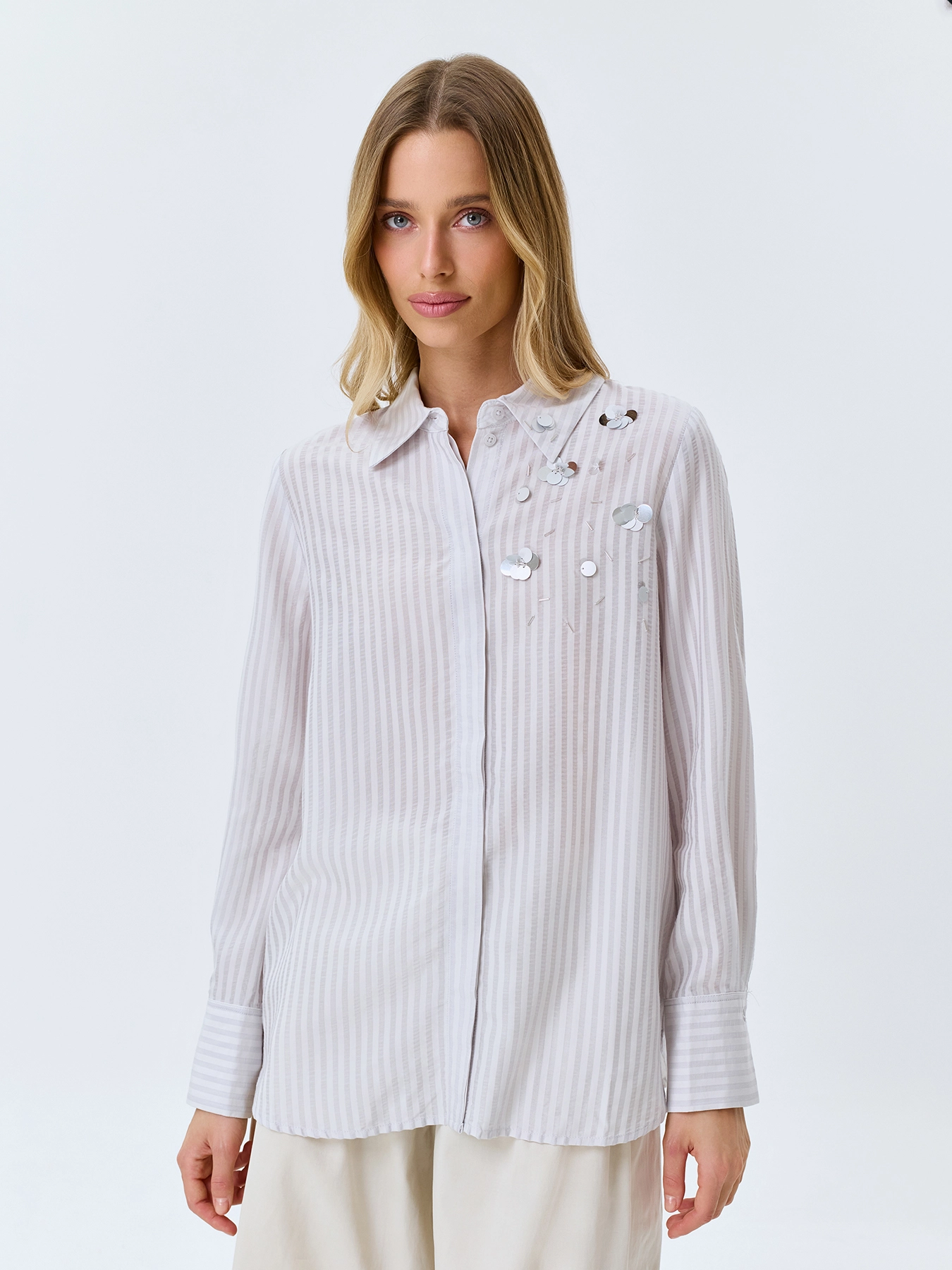 Блузка в тонкую полоску из 100% тенселя. Свободный силуэт. Отложной воротник. Застежка на пуговицы. Длинные втачные рукава с манжетами по низу. Дополнена цветочной аппликацией из пайеток.