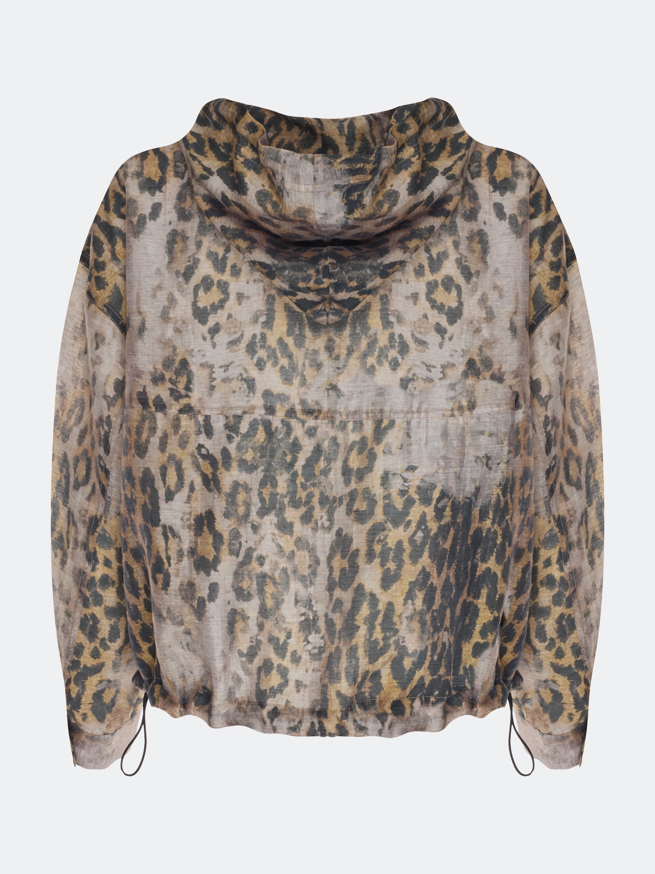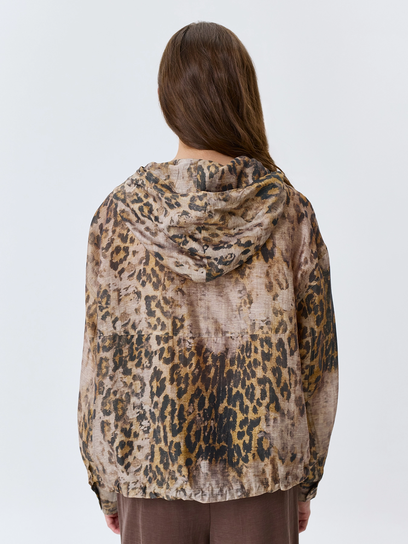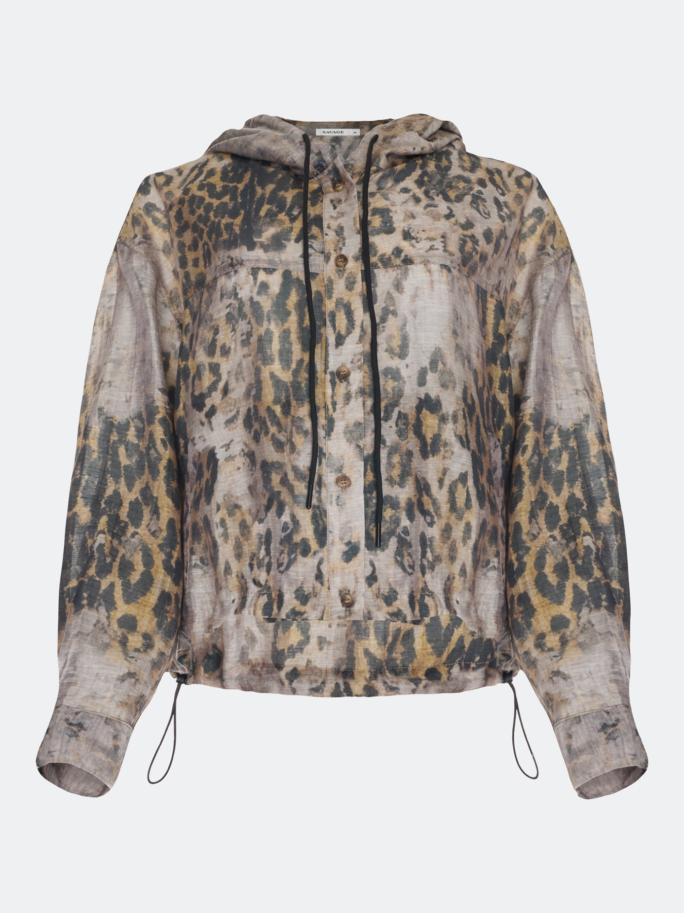 Худи из полупрозрачного смесового тенселя с анималистичным принтом. Свободный силуэт. Капюшон с кулиской и шнурком. Застежка на пуговицы. Спущенная линия плеч. Длинные рукава с манжетами по низу. Кулиса по низу изделия позволяет варьировать посадку. Боковые карманы с листочками.