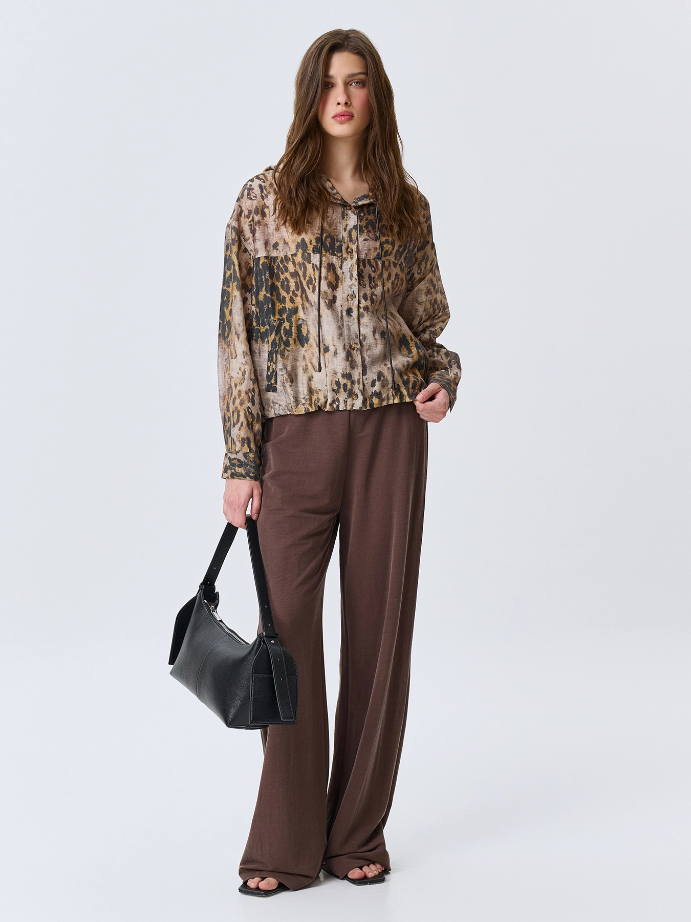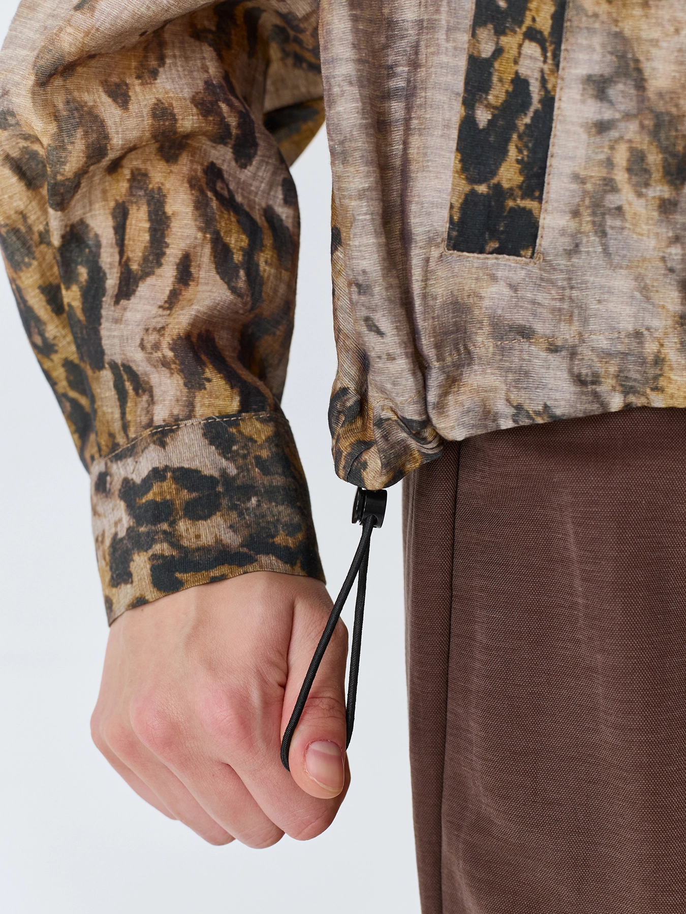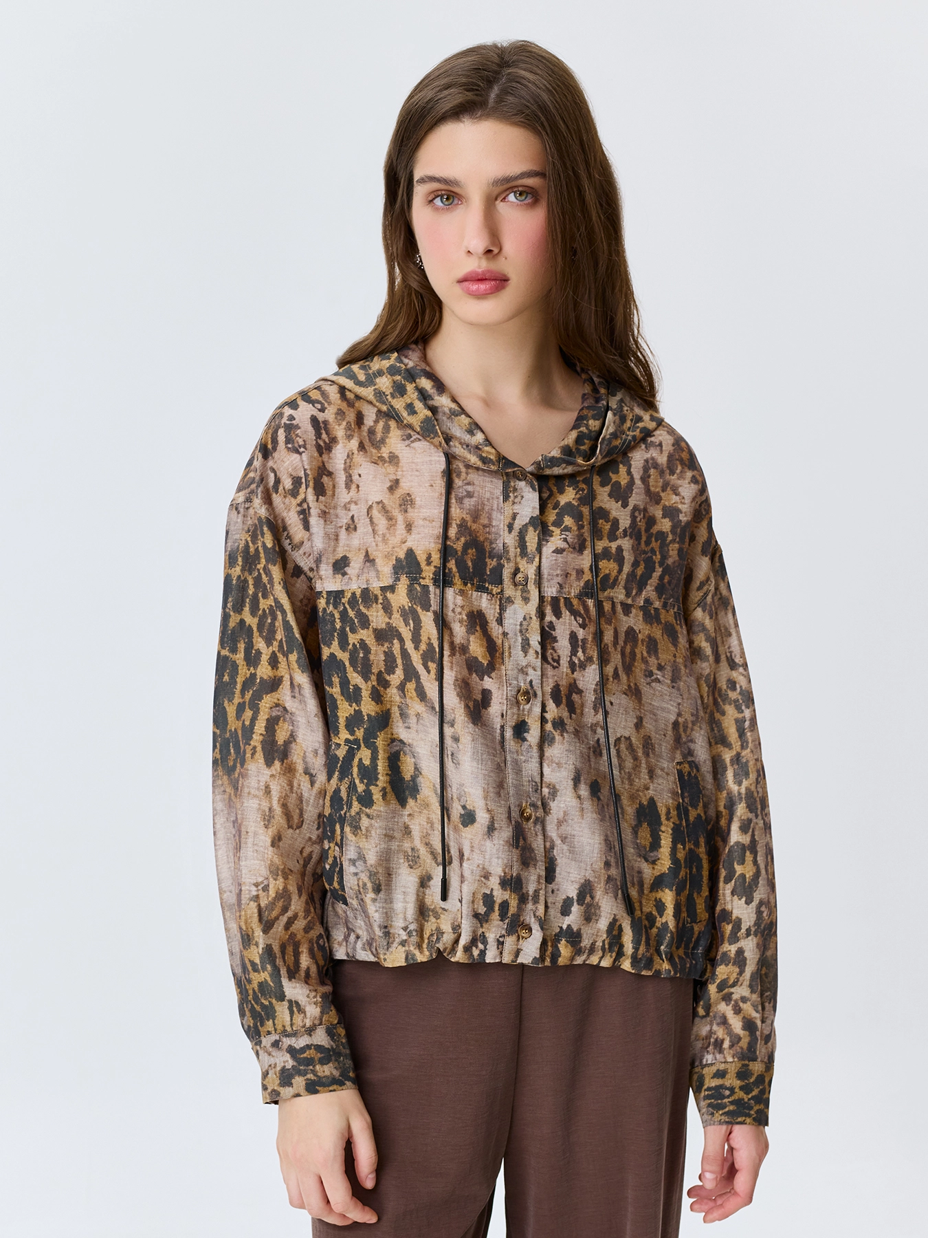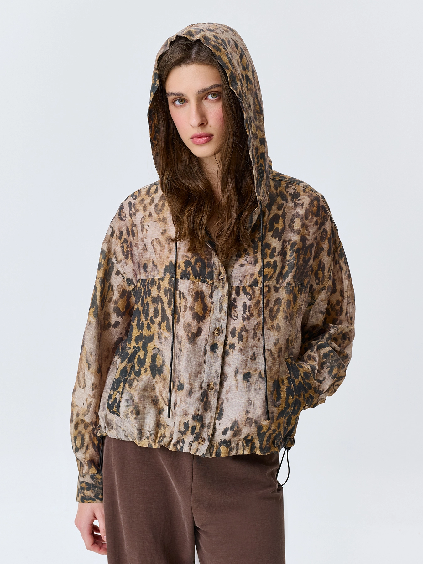 Худи из полупрозрачного смесового тенселя с анималистичным принтом. Свободный силуэт. Капюшон с кулиской и шнурком. Застежка на пуговицы. Спущенная линия плеч. Длинные рукава с манжетами по низу. Кулиса по низу изделия позволяет варьировать посадку. Боковые карманы с листочками.