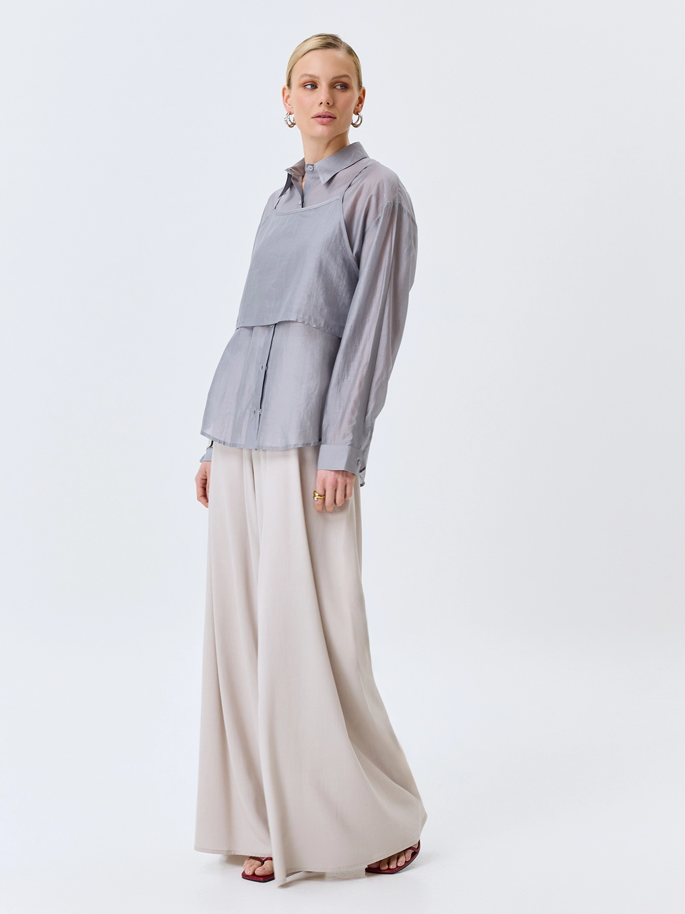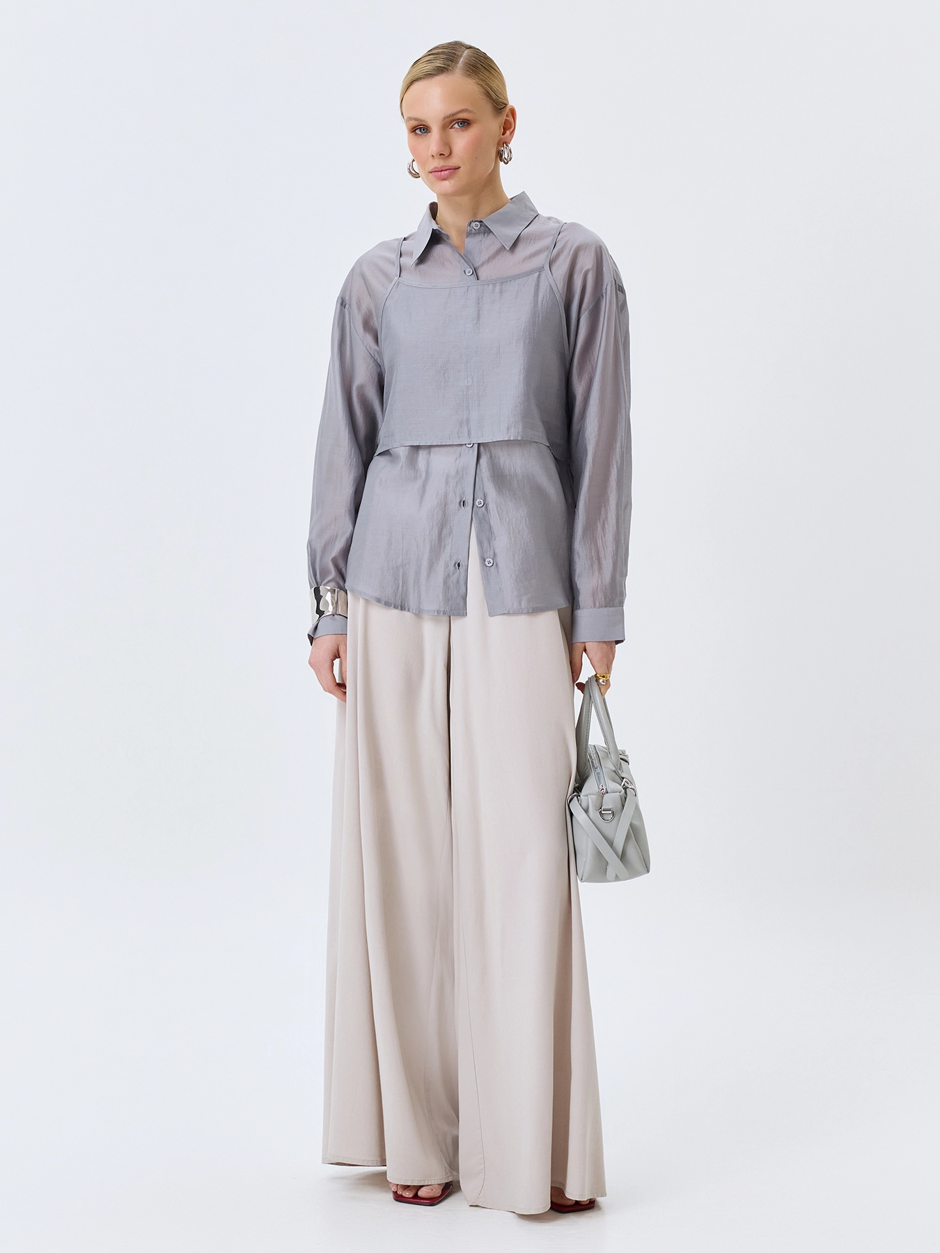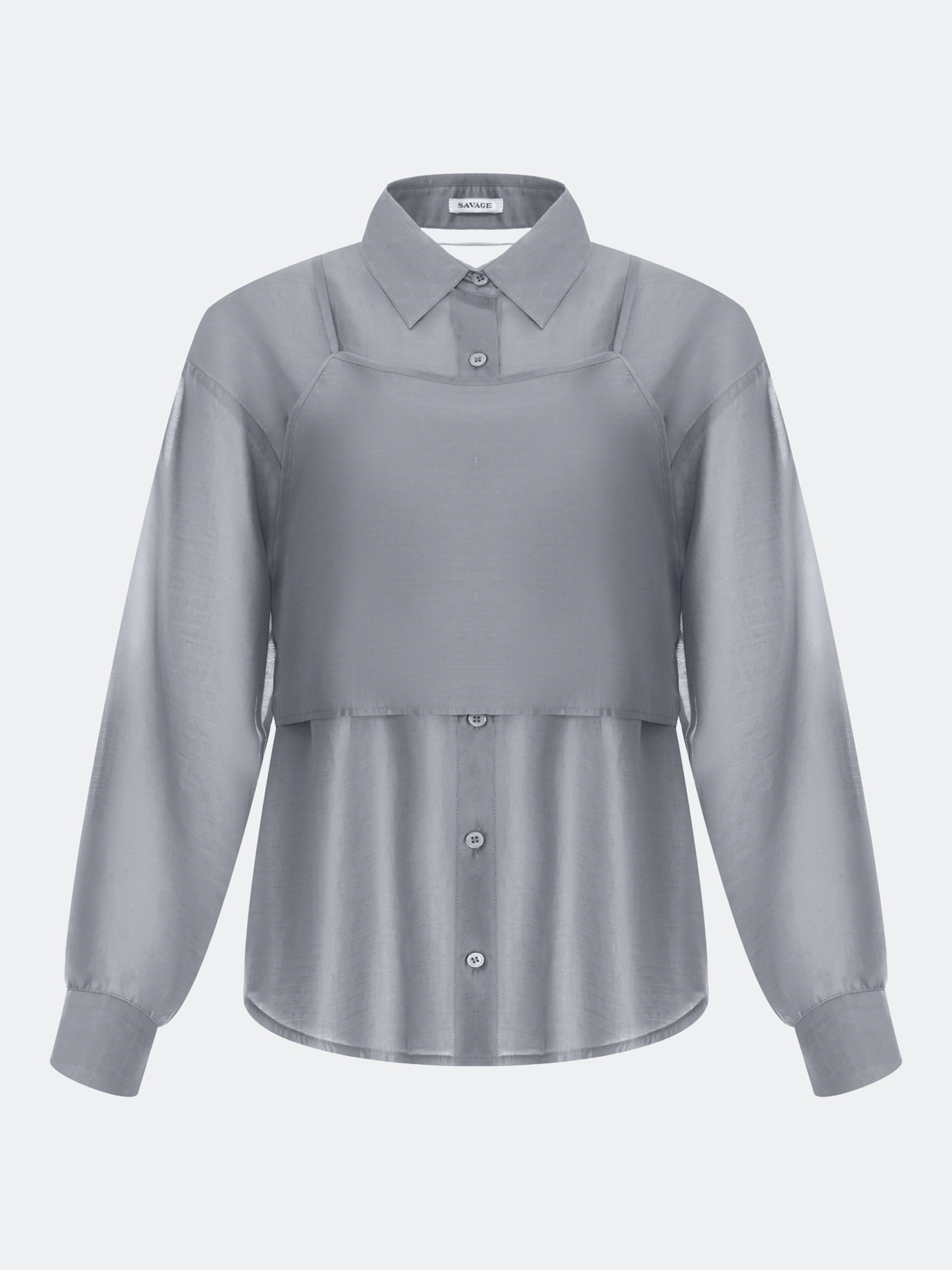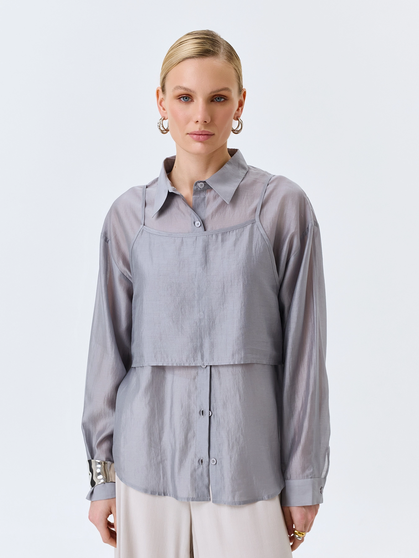 Комбинированная блузка с топом из воздушного полупрозрачного текстиля. Свободный силуэт. Спущенная линия плеч. Отложной воротник. Застежка на пуговицы. Спинка немного удлинена. Длинные объемные рукава. Дополнена съемным топом свободного силуэта. В составе тенсель.