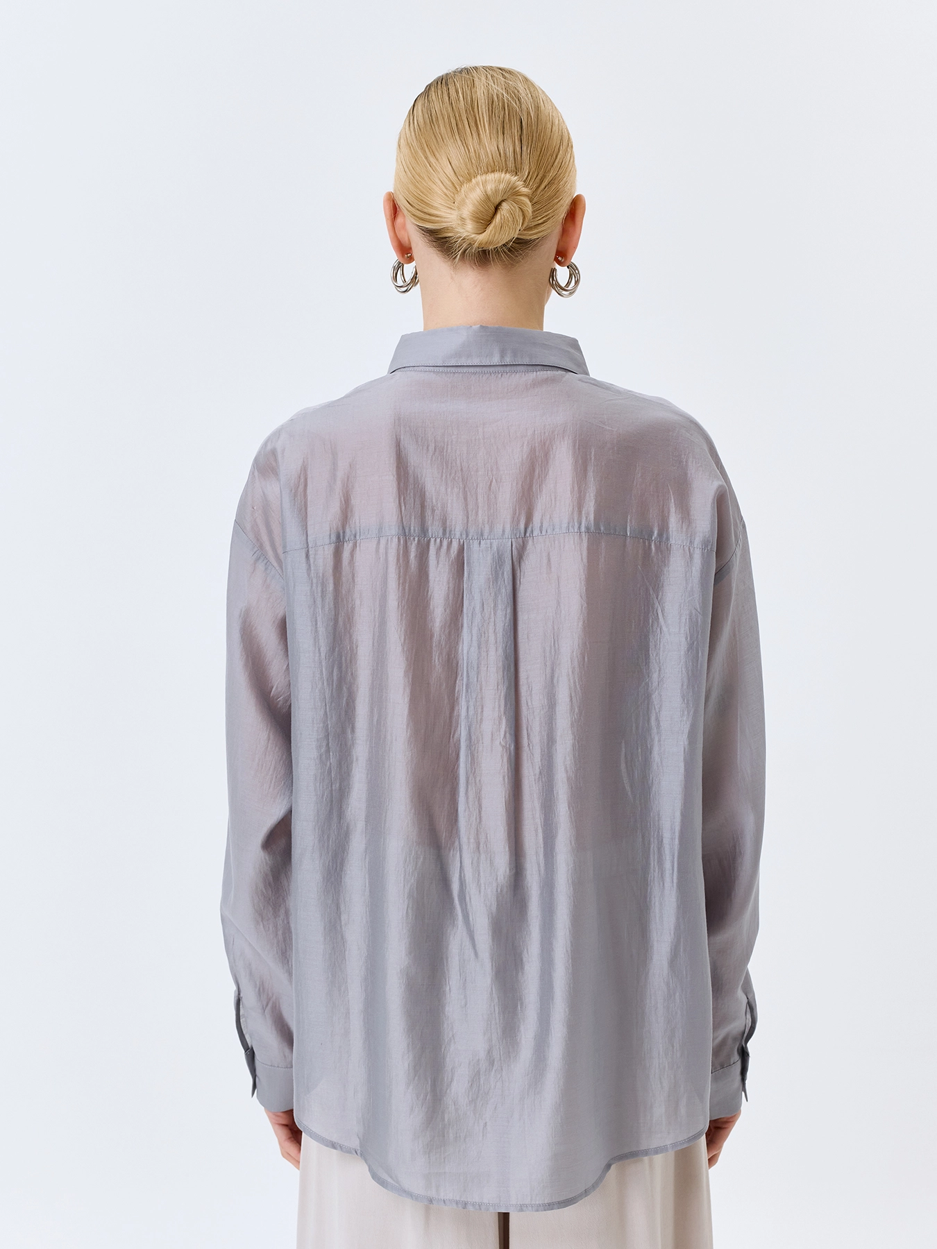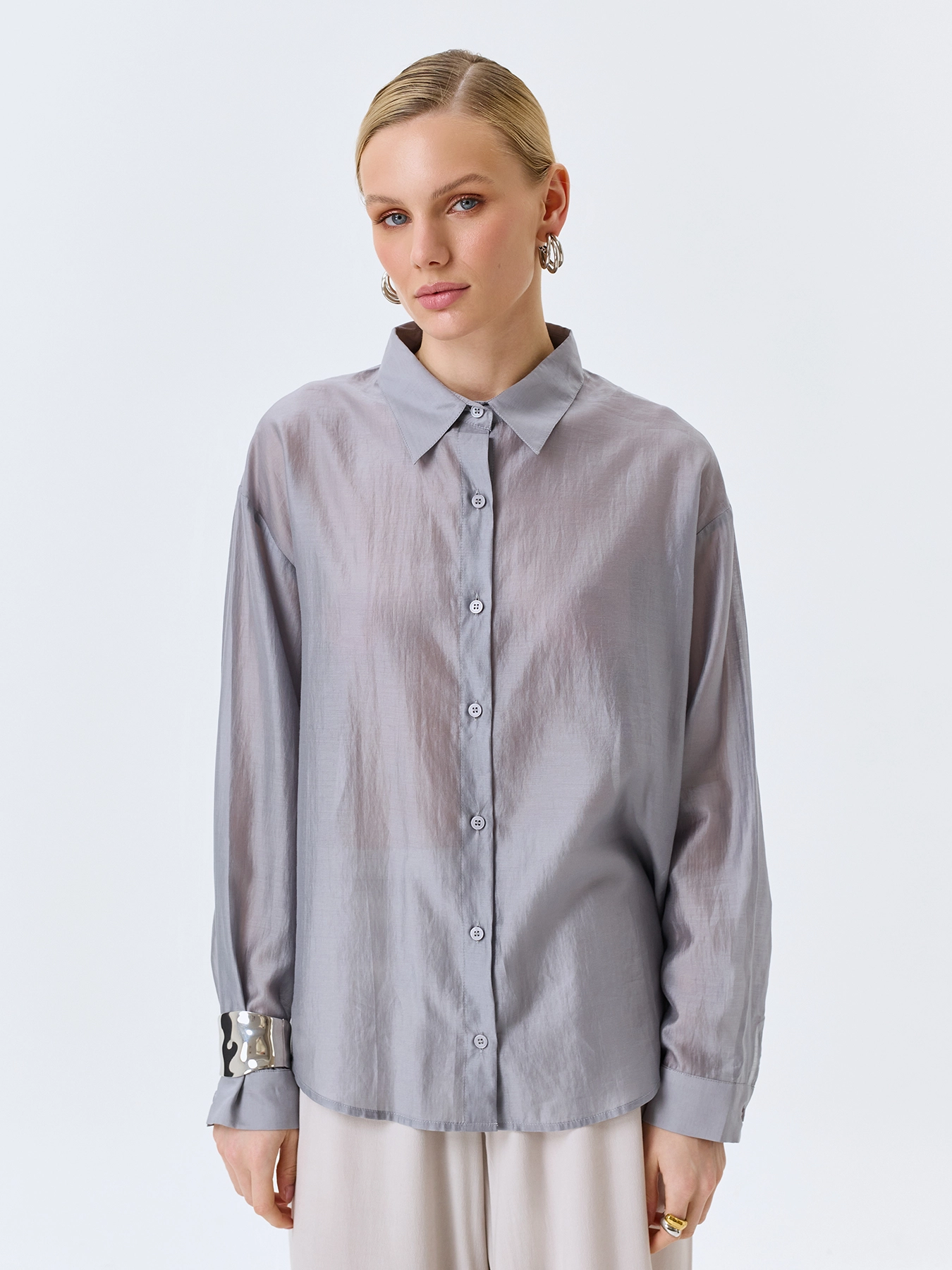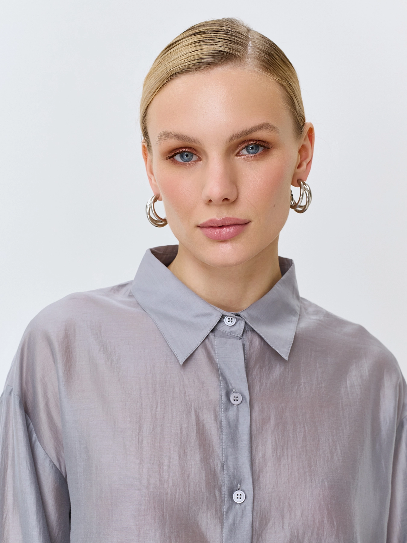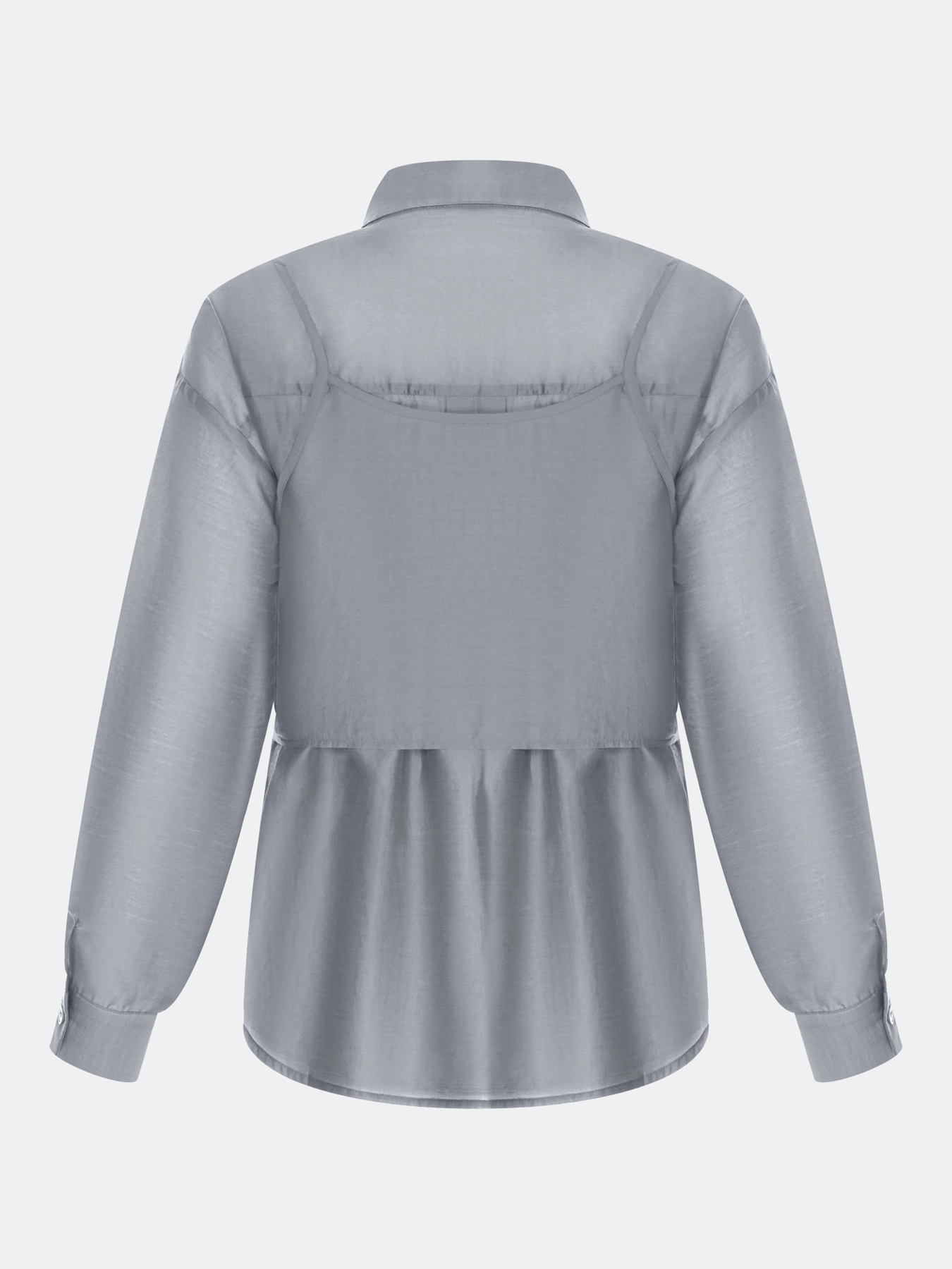 Комбинированная блузка с топом из воздушного полупрозрачного текстиля. Свободный силуэт. Спущенная линия плеч. Отложной воротник. Застежка на пуговицы. Спинка немного удлинена. Длинные объемные рукава. Дополнена съемным топом свободного силуэта. В составе тенсель.