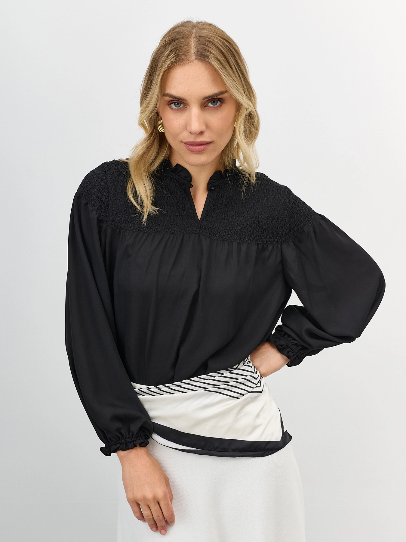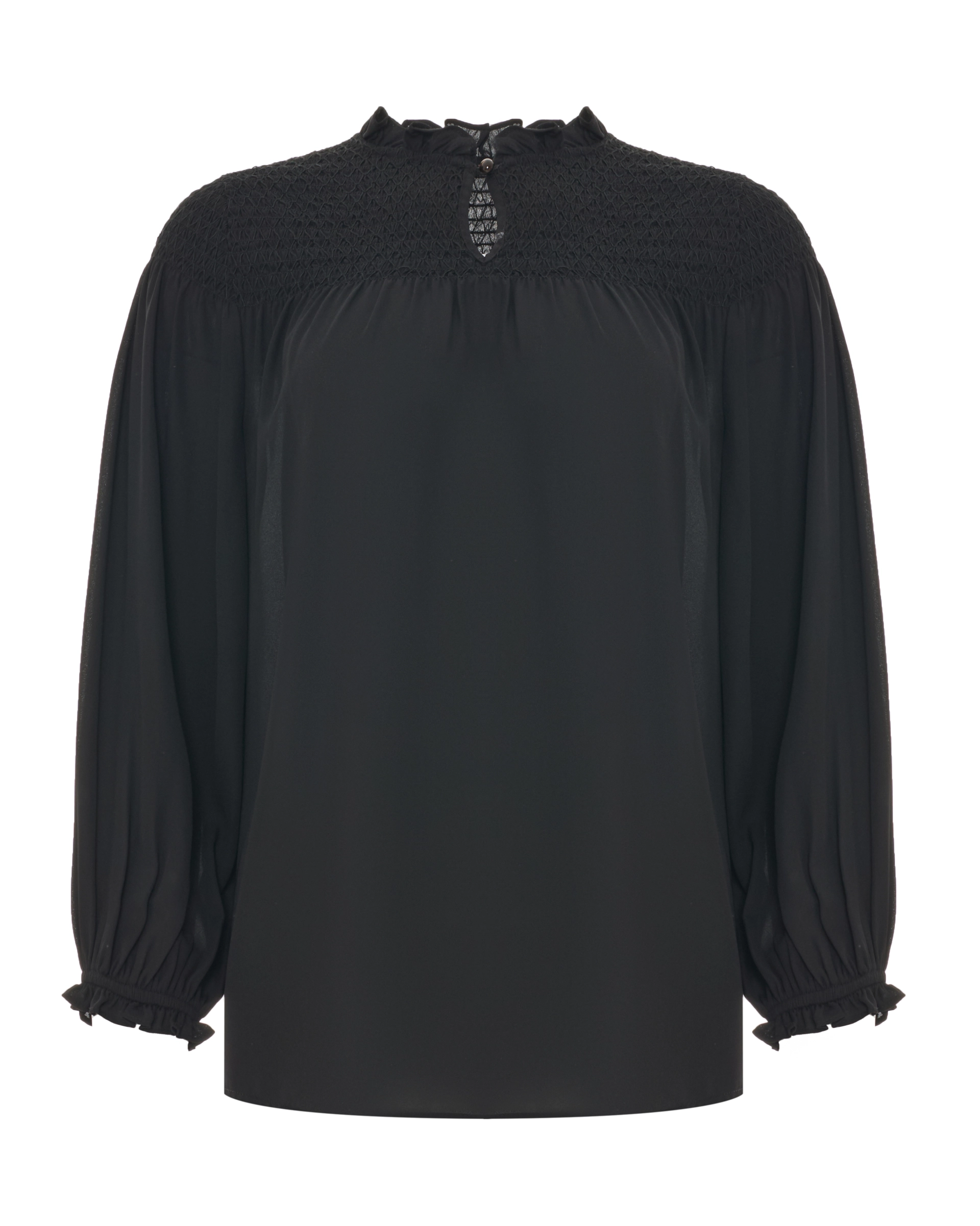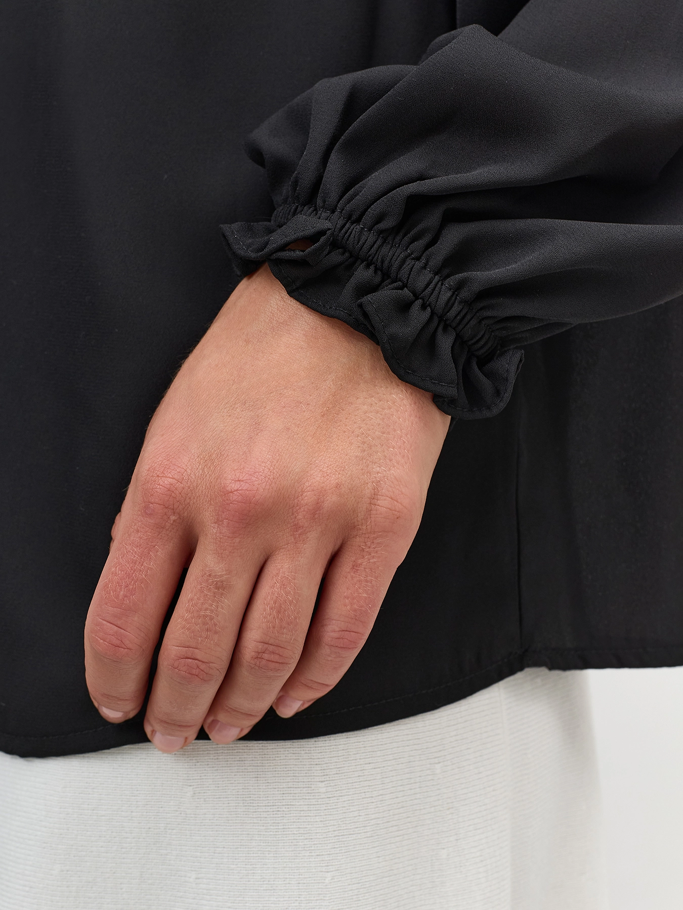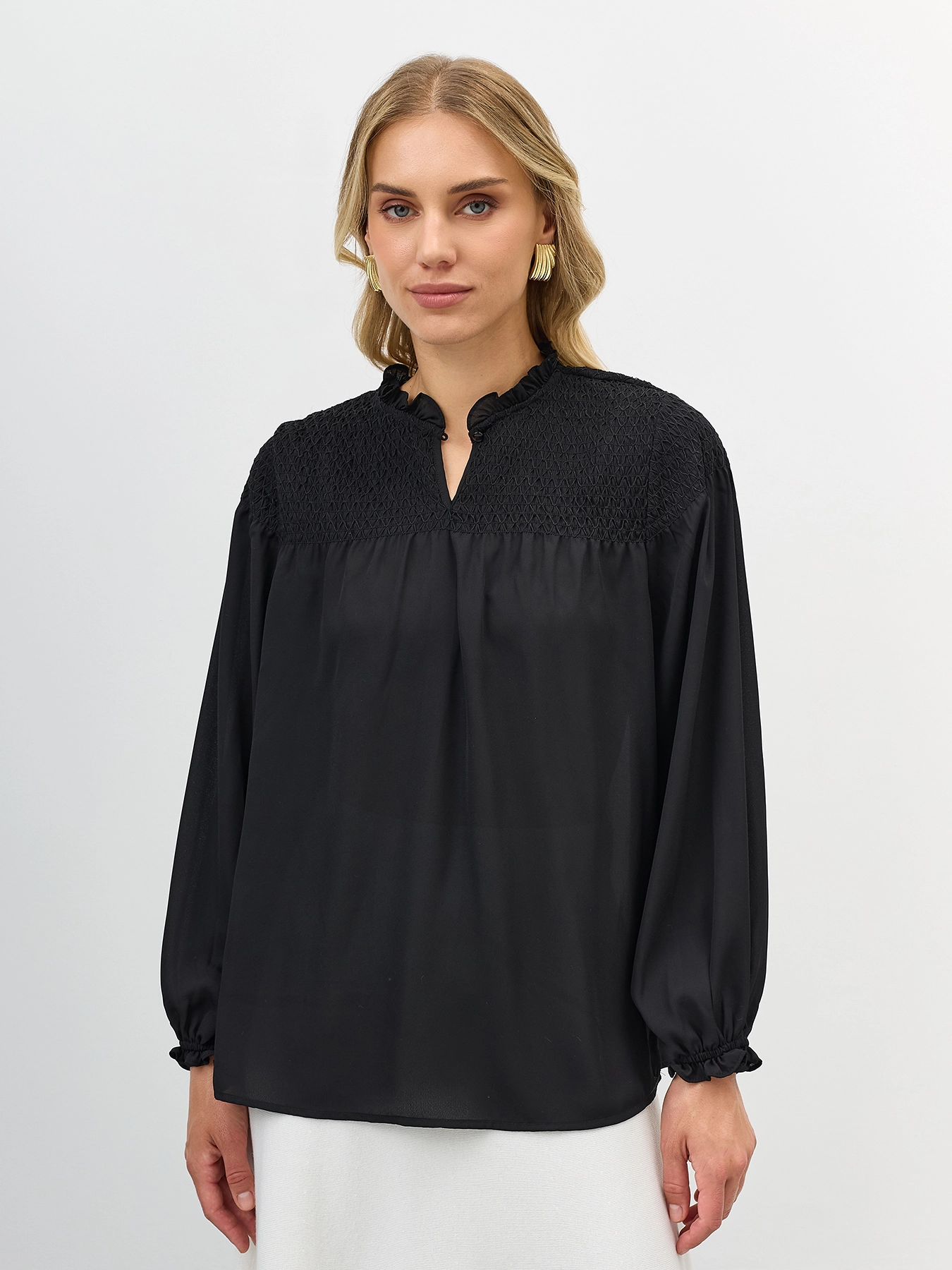 Легкая свободная блузка в стиле бохо. Круглый воротник с деликатным вырезом на пуговице. Резинка по низу рукавов. Акцентная сборка-буфы по линии плеч.