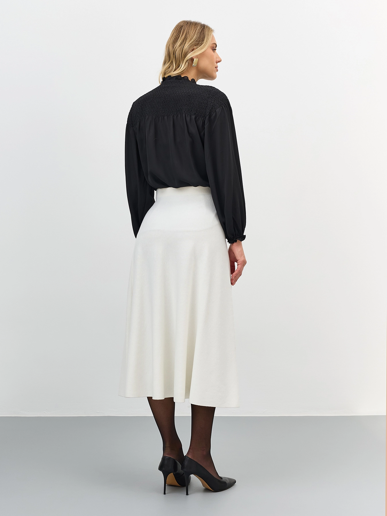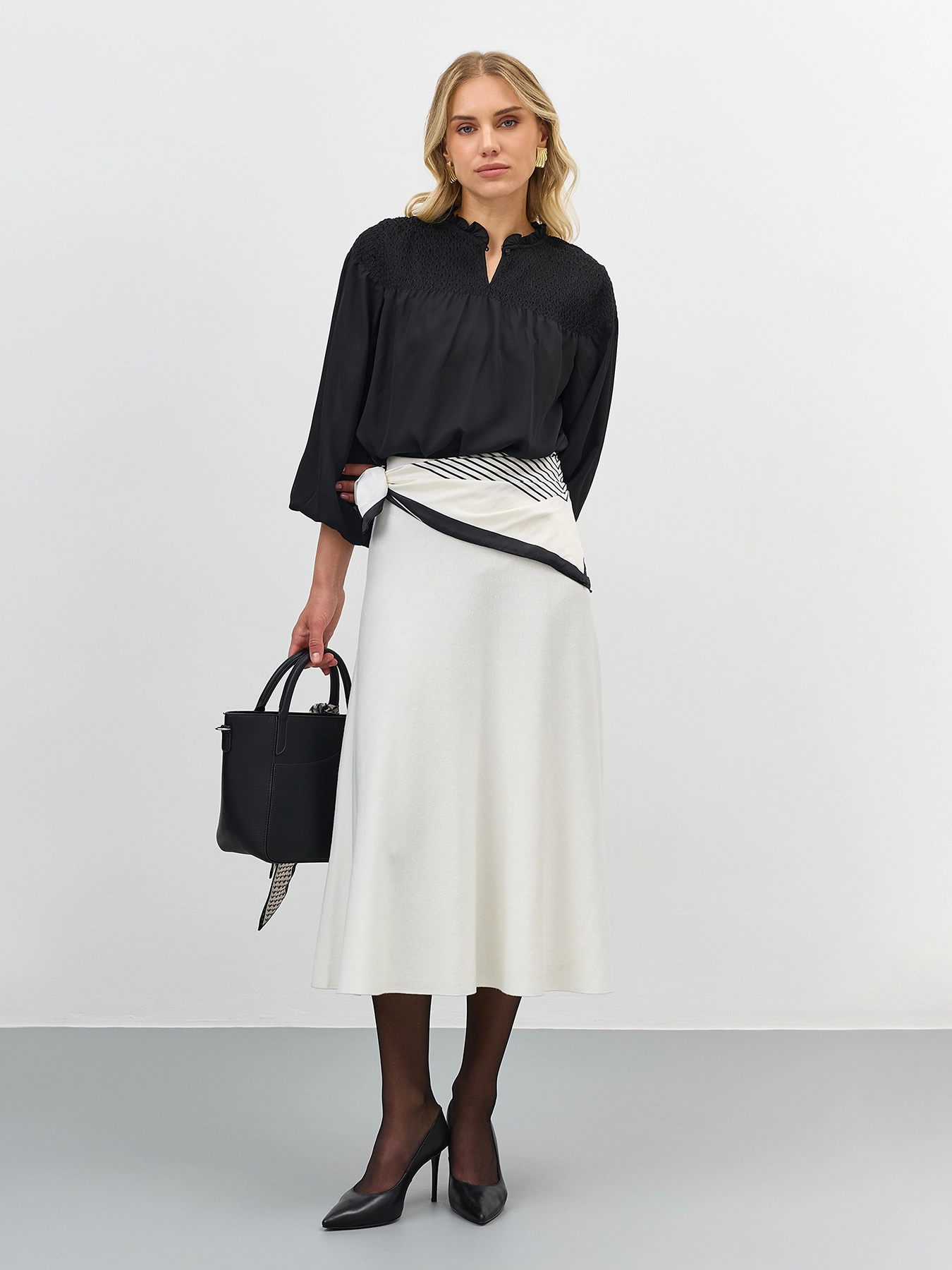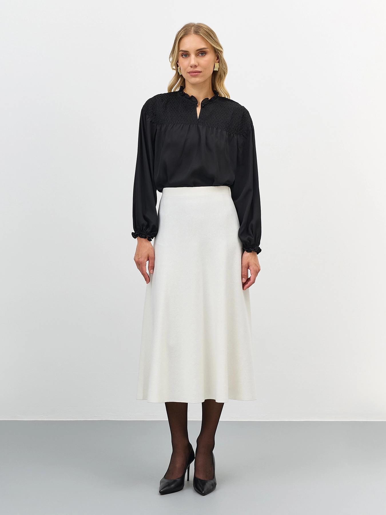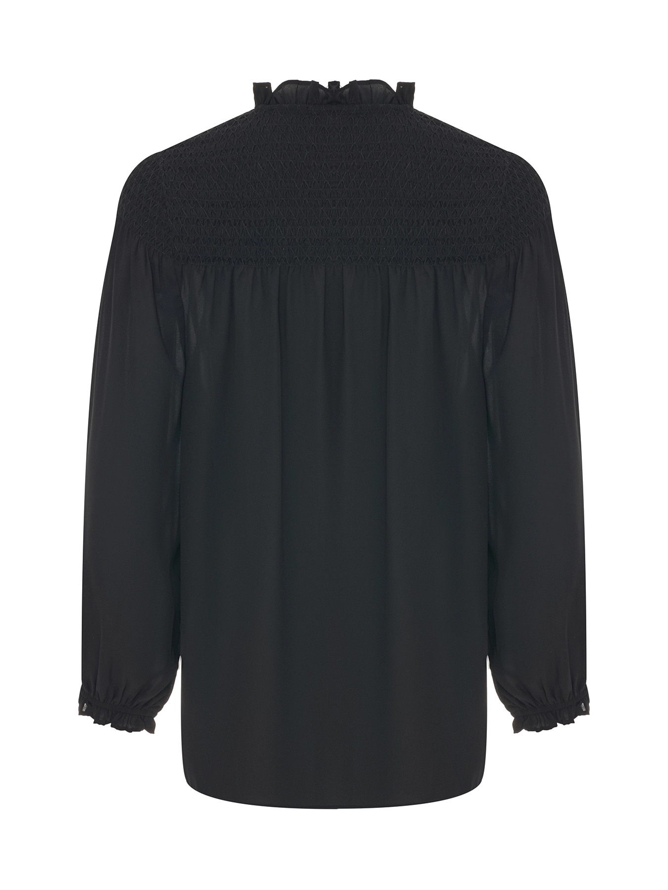 Легкая свободная блузка в стиле бохо. Круглый воротник с деликатным вырезом на пуговице. Резинка по низу рукавов. Акцентная сборка-буфы по линии плеч.