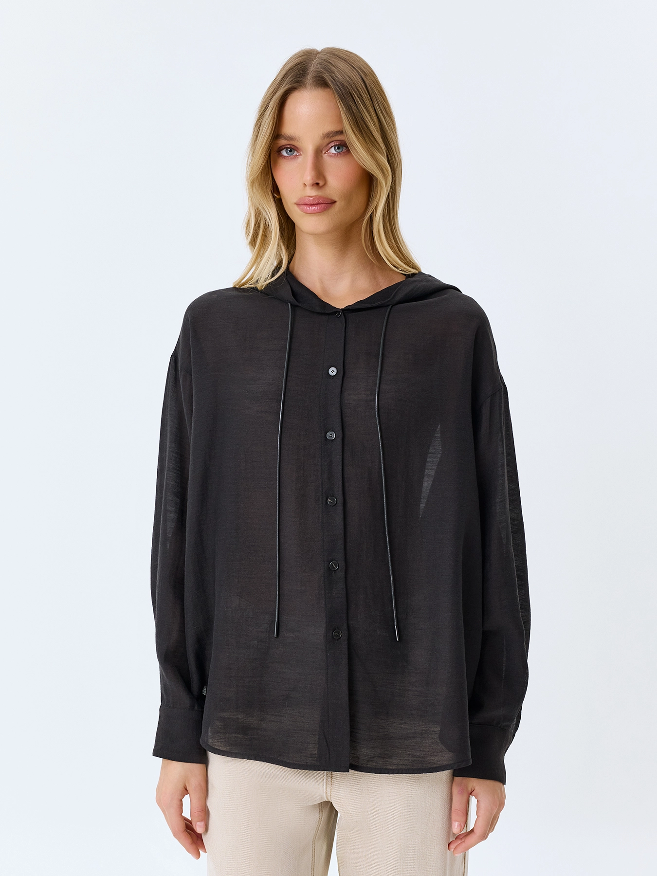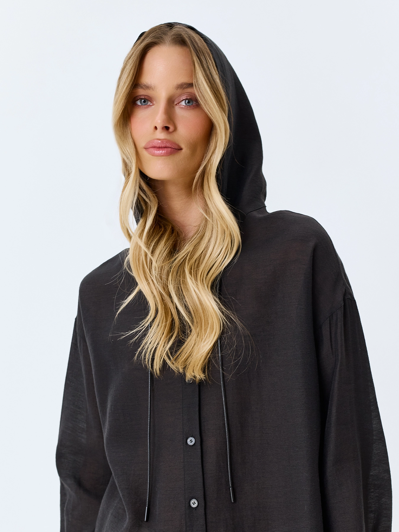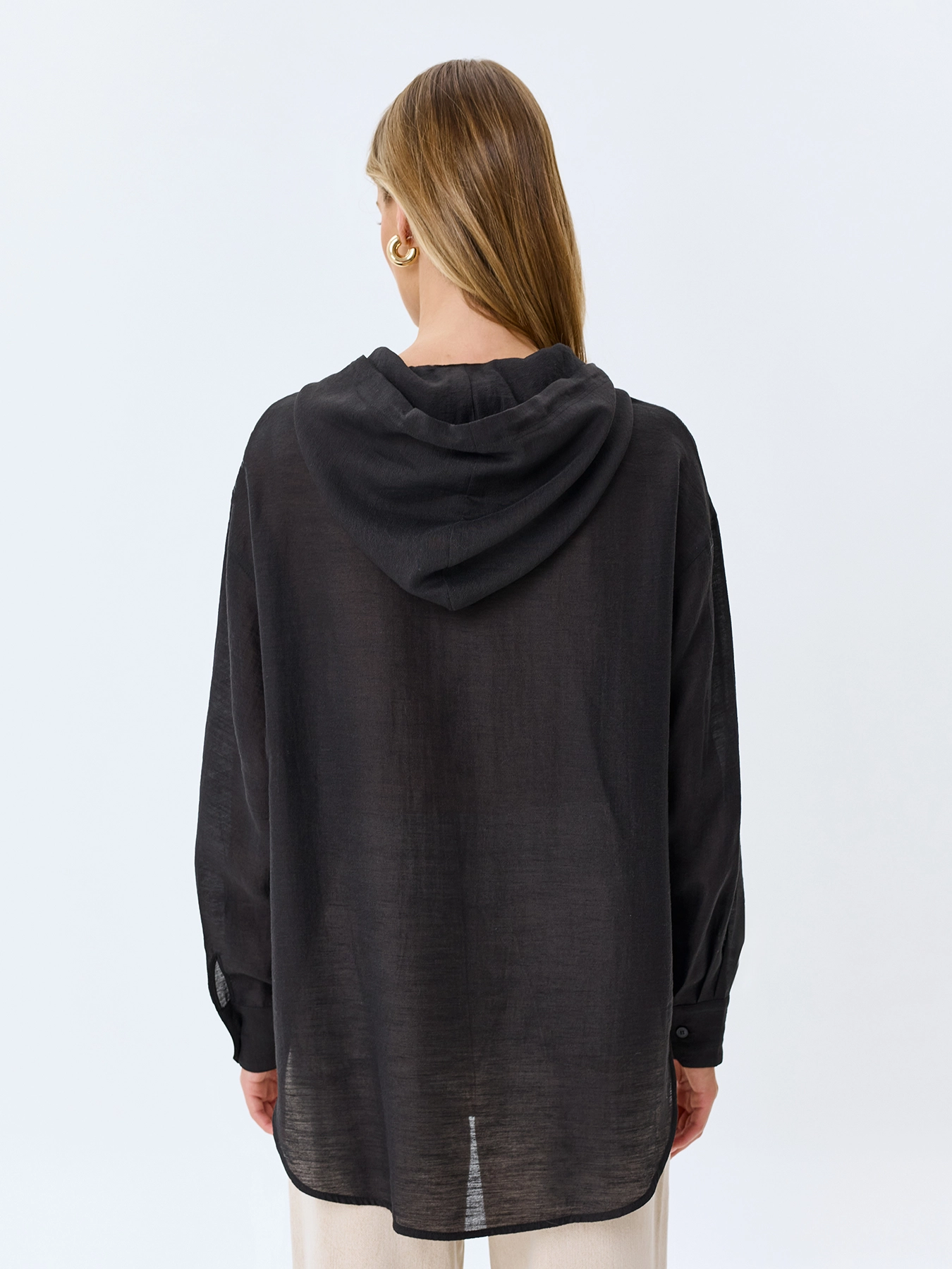 Полупрозрачная Oversize рубашка с капюшоном. Свободный силуэт. Застежка на пуговицы. Спущенная линия плеч. Длинные втачные рукава с манжетами по низу. Спинка немного удлинена. В составе тенсель и лен.