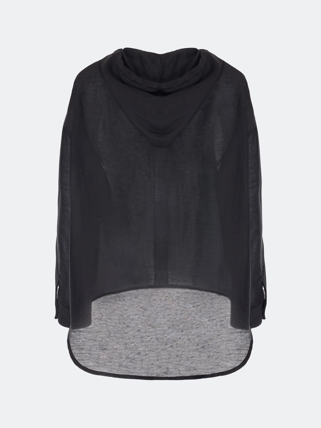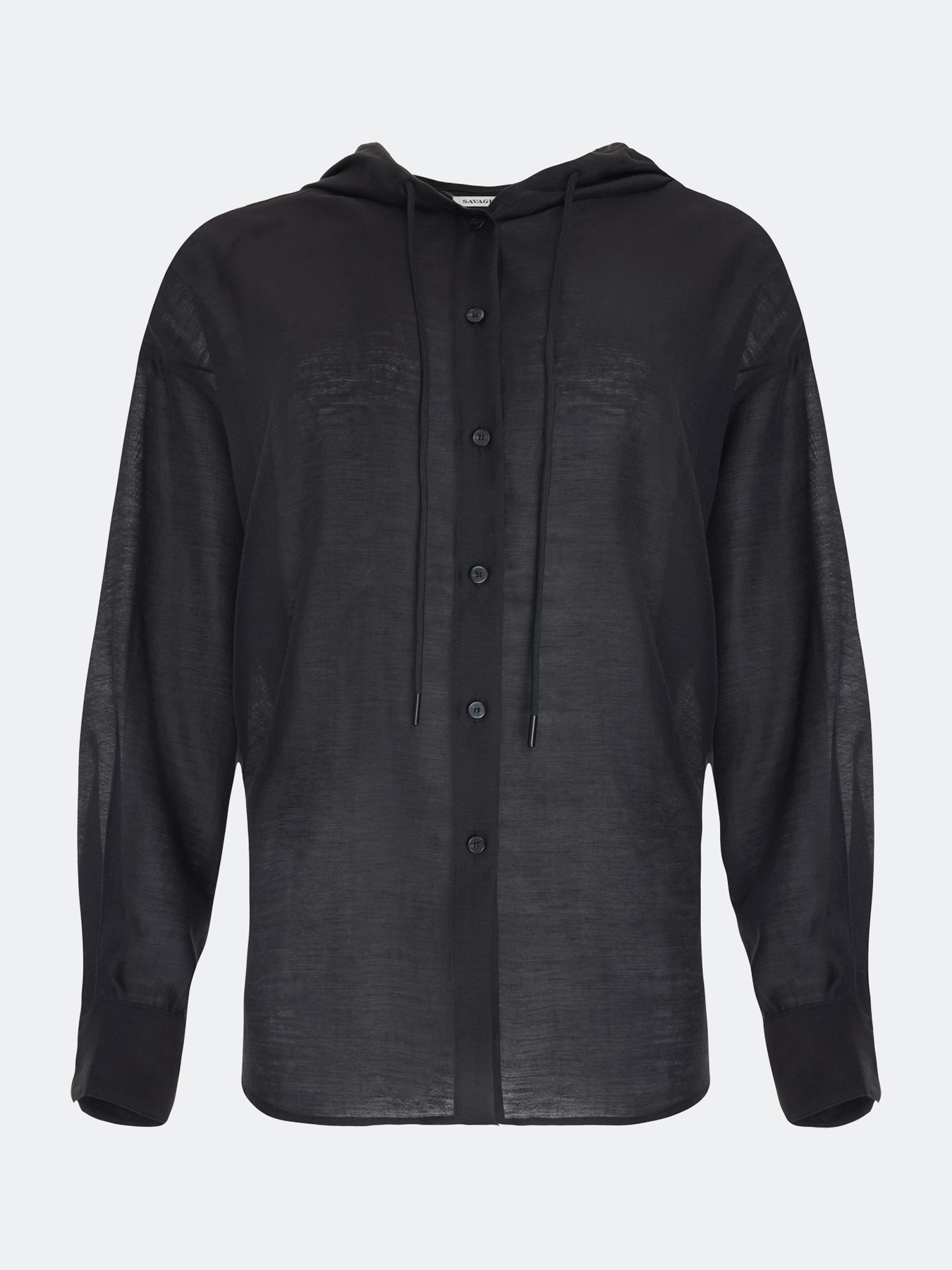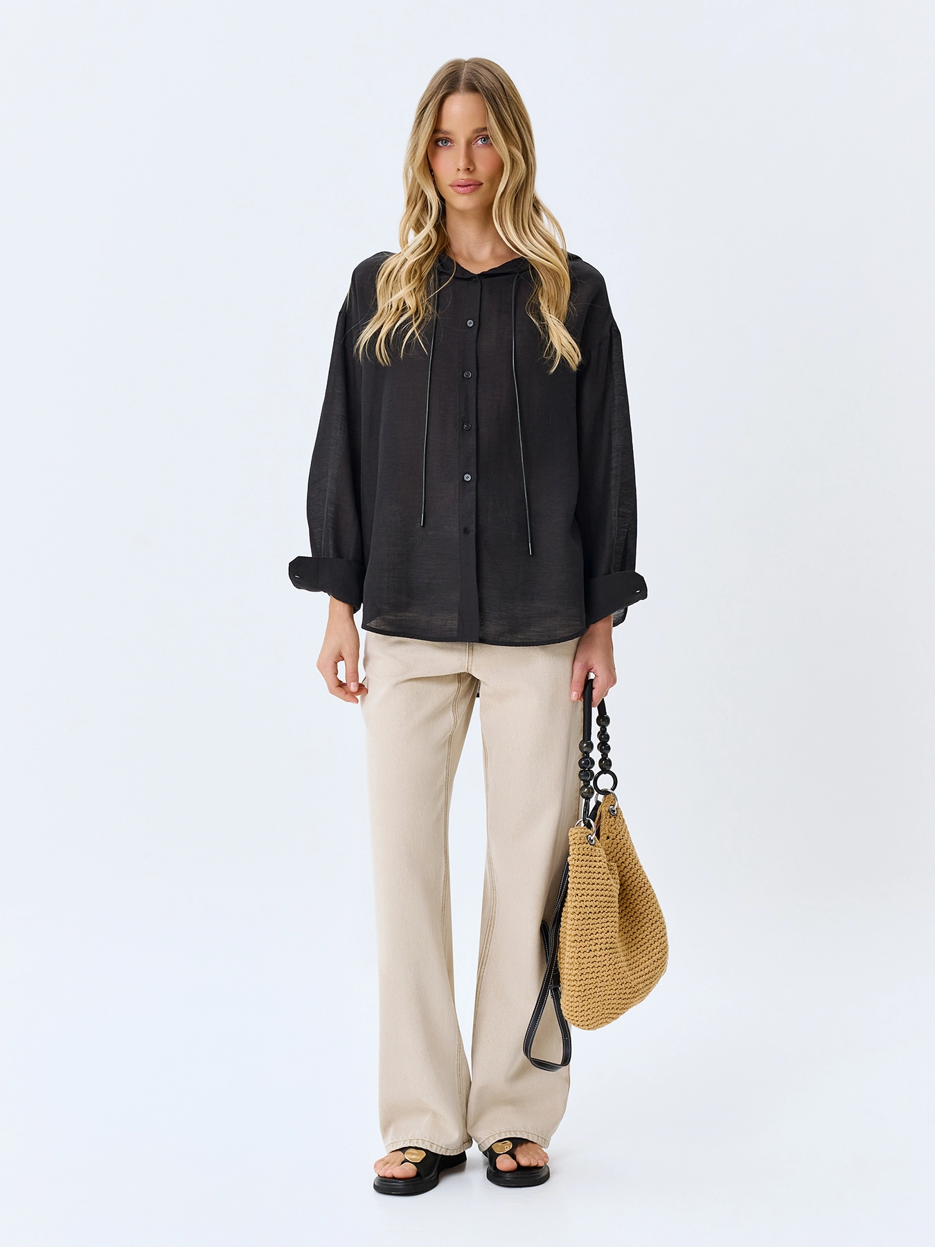 Полупрозрачная Oversize рубашка с капюшоном. Свободный силуэт. Застежка на пуговицы. Спущенная линия плеч. Длинные втачные рукава с манжетами по низу. Спинка немного удлинена. В составе тенсель и лен.