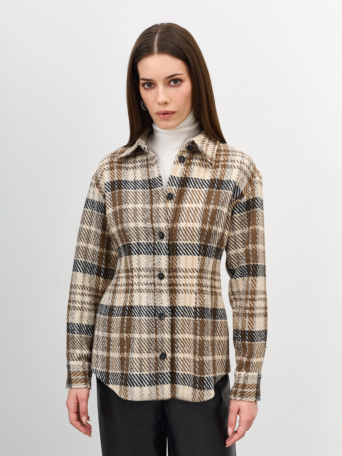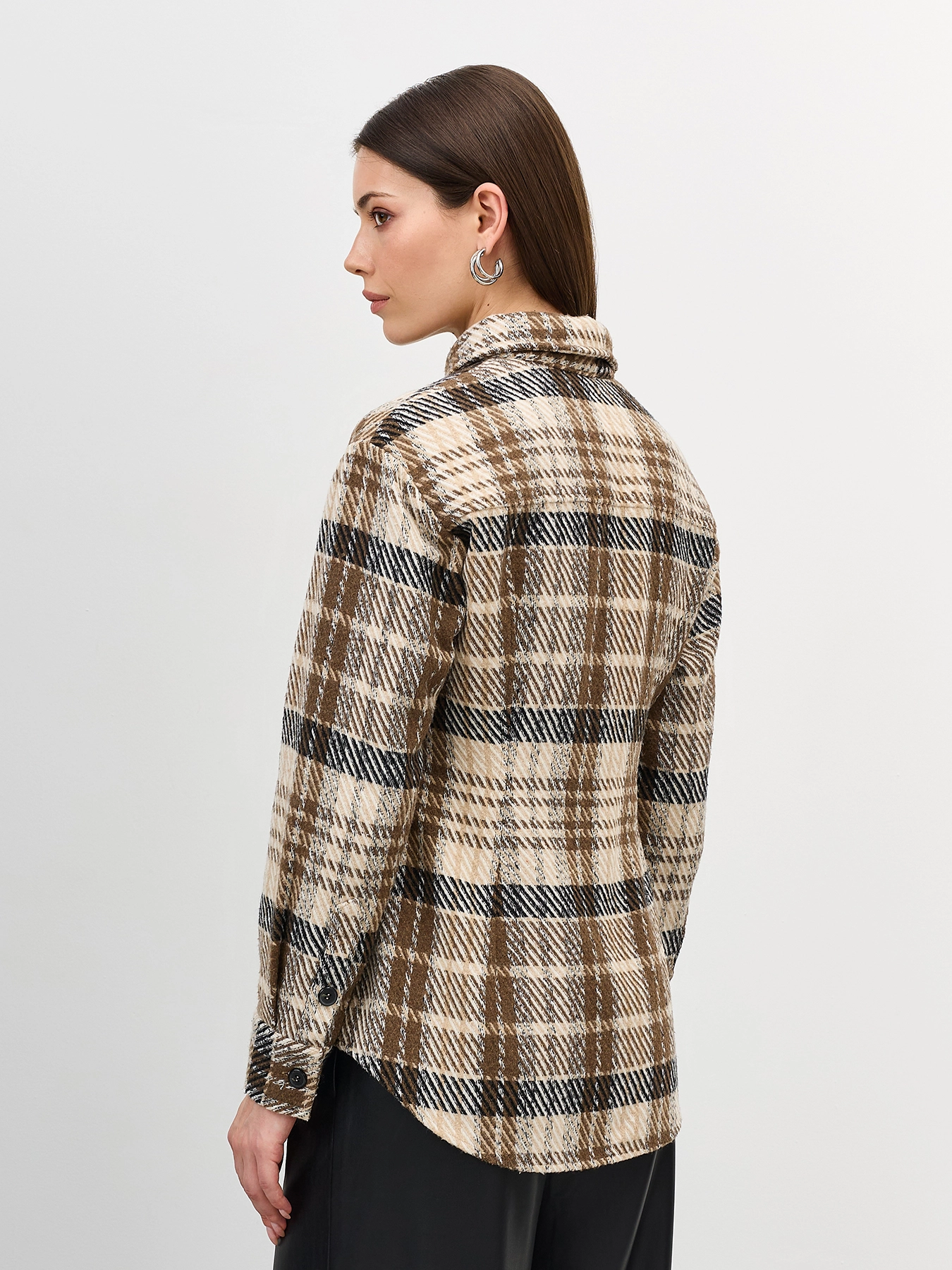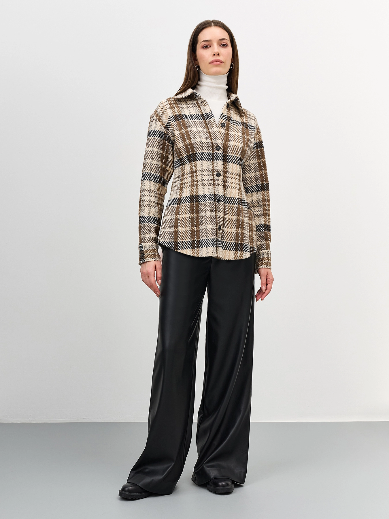 Приталенная рубашка из фланели в клетку. Линия плеч немного расширена. Отложной воротник. Застежка на контрастные пуговицы. Длинные объемные рукава дополнены манжетами на пуговицах по низу.