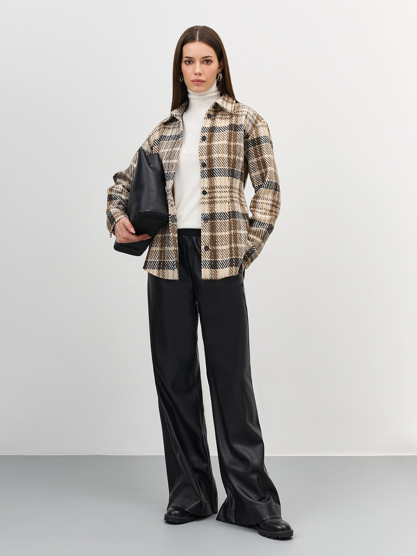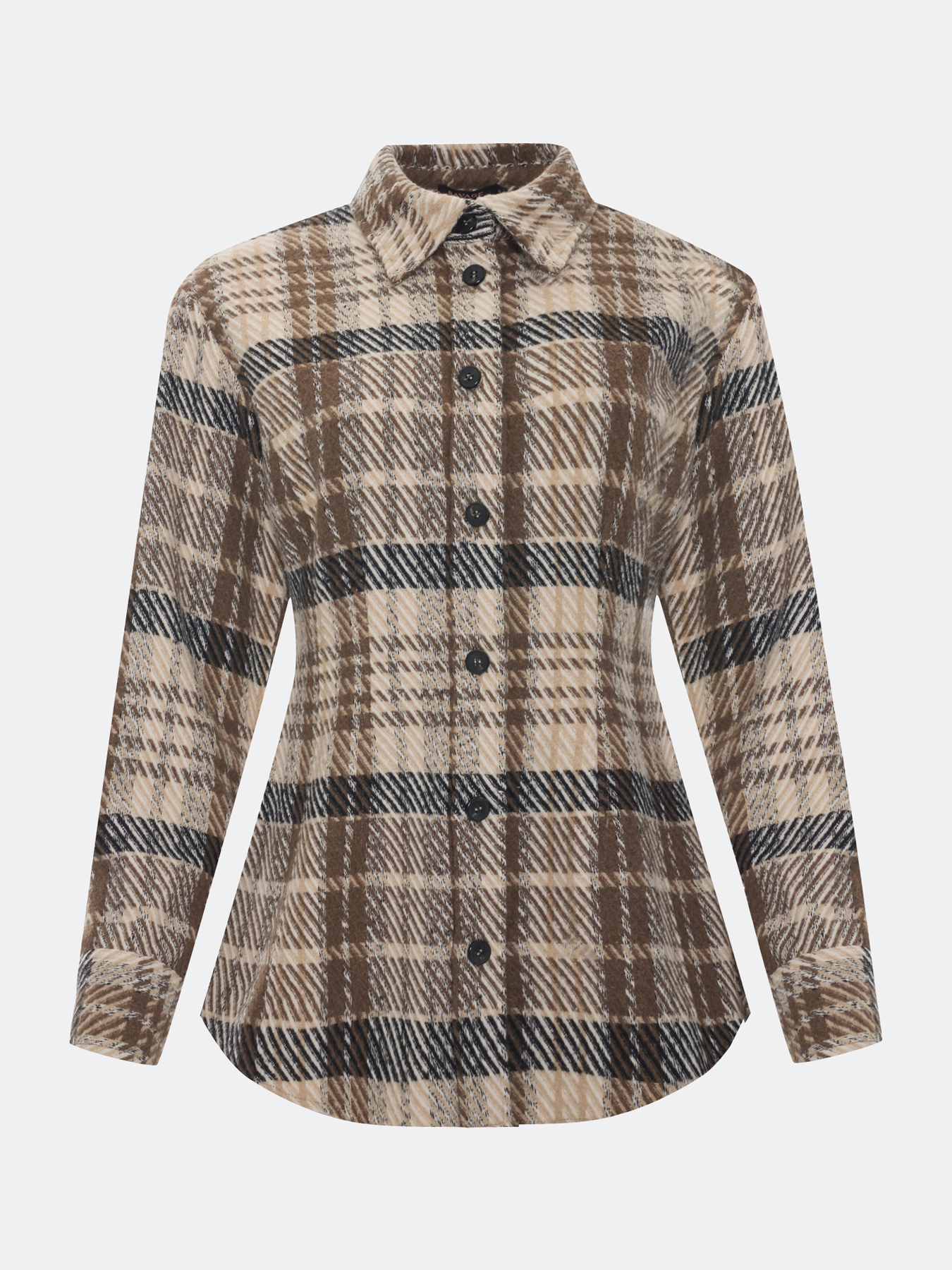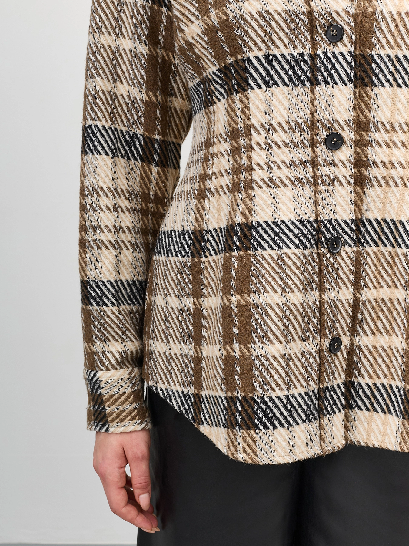 Приталенная рубашка из фланели в клетку. Линия плеч немного расширена. Отложной воротник. Застежка на контрастные пуговицы. Длинные объемные рукава дополнены манжетами на пуговицах по низу.