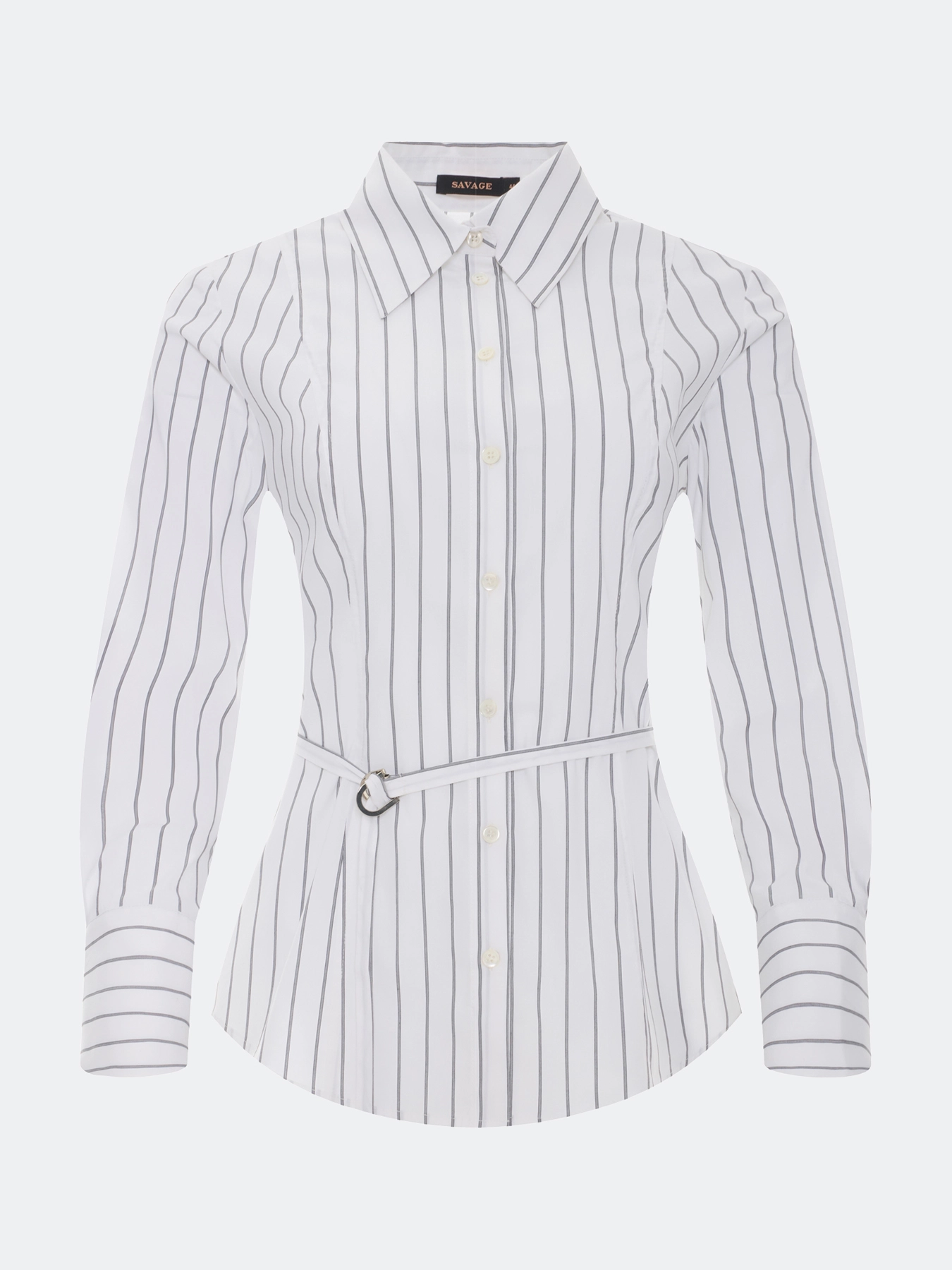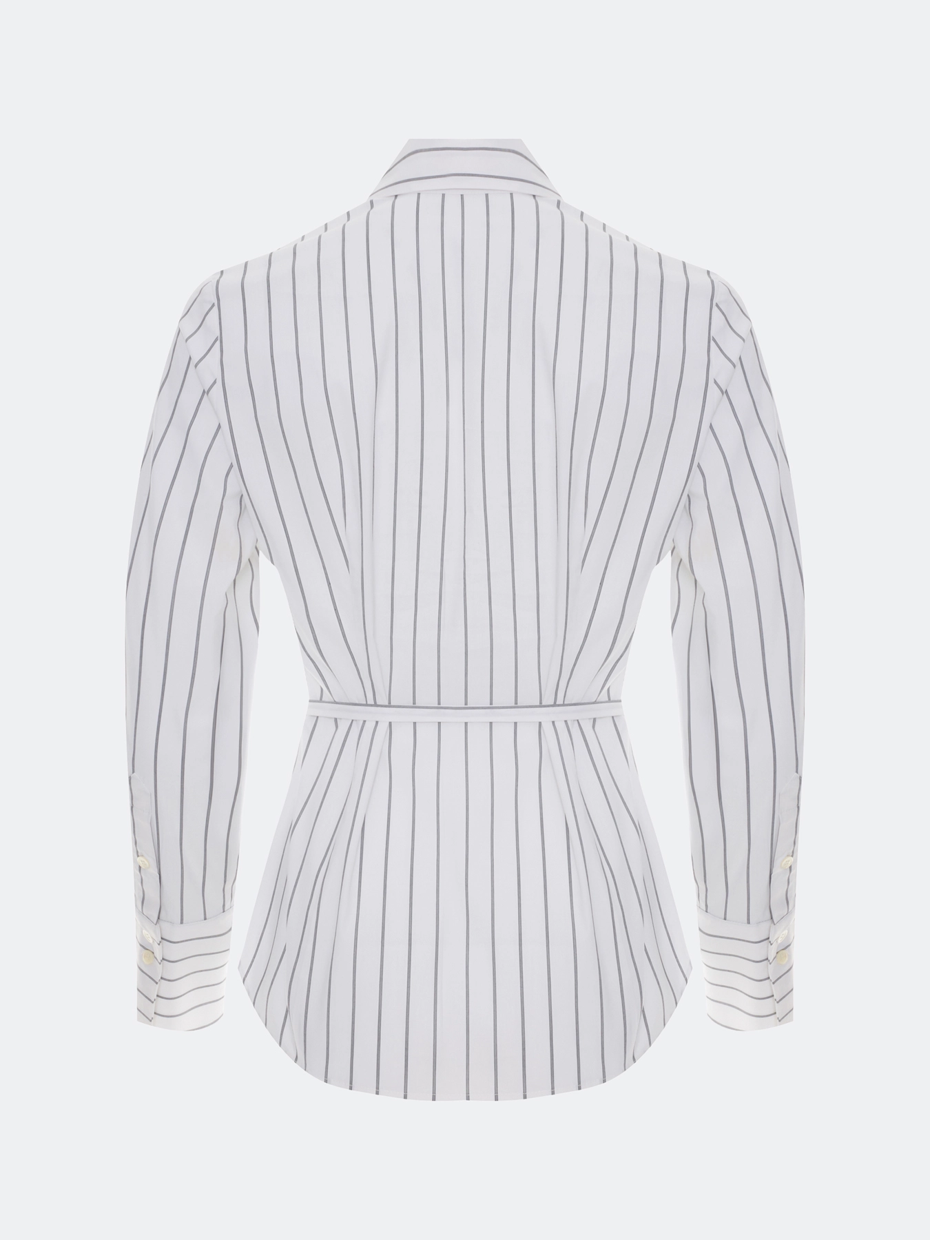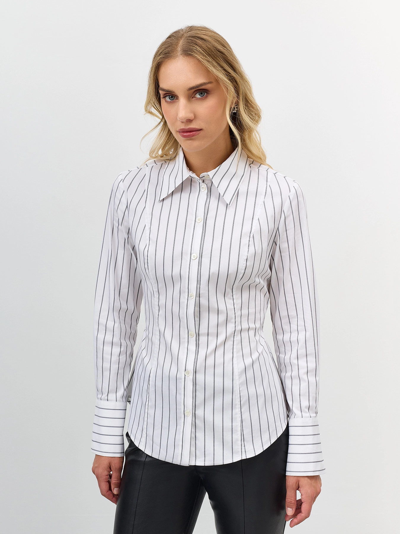 Рубашка приталенного силуэта в тонкую контрастную полоску. Отложной воротник. Застежка на пуговицы. Широкие манжеты по низу рукавов. Дополнена тонким съемным поясом с металлической пряжкой. В составе хлопок.