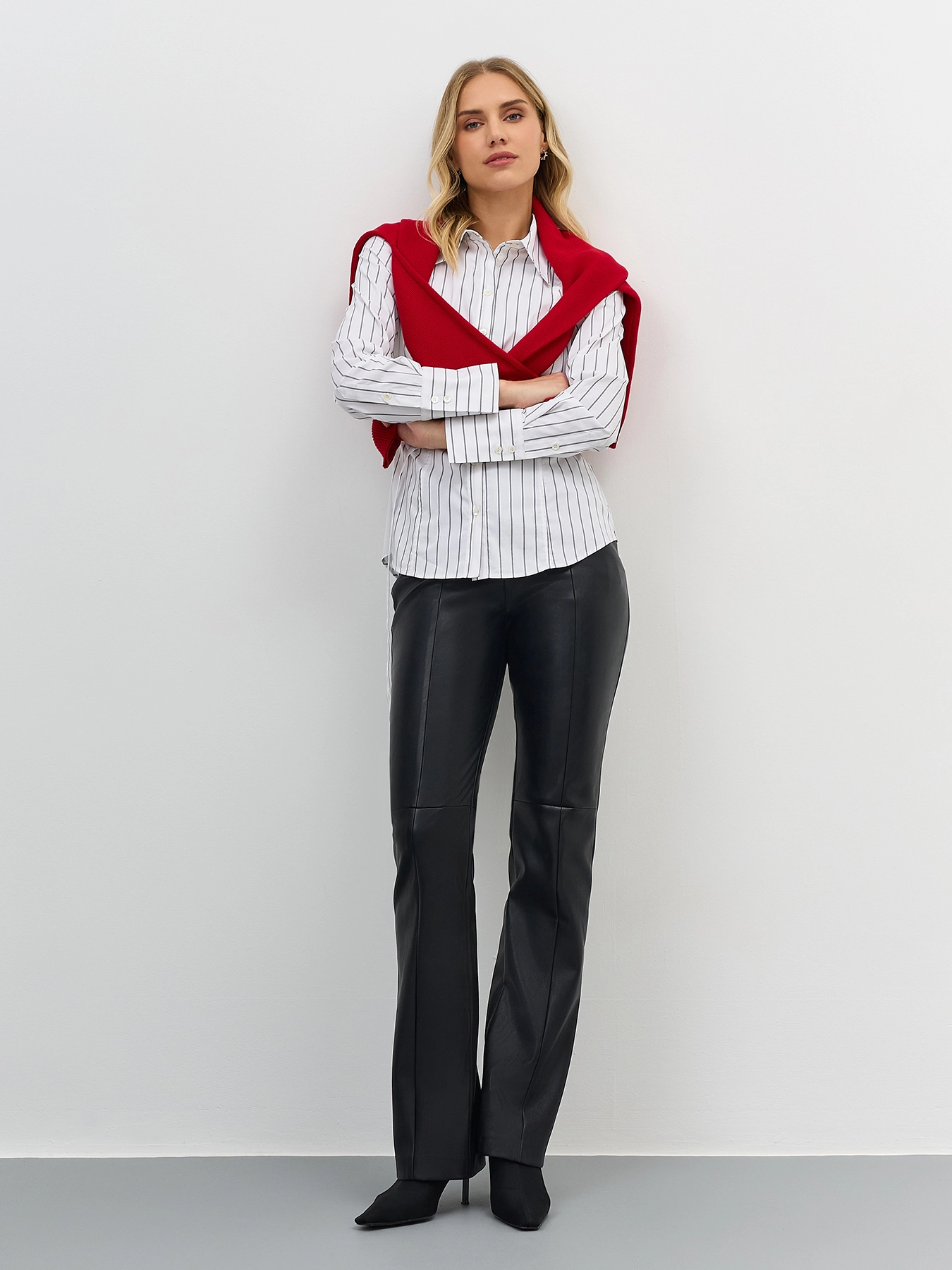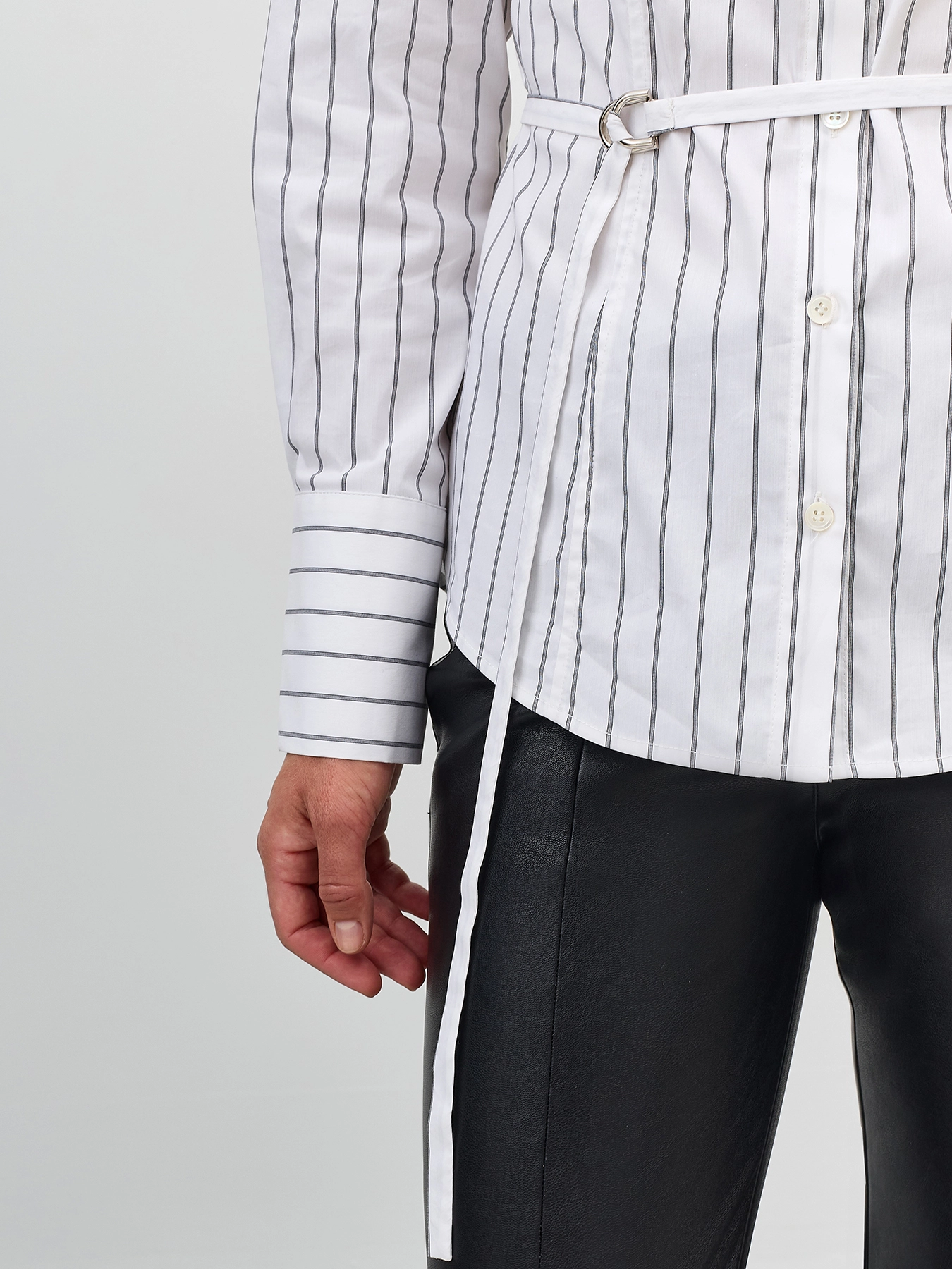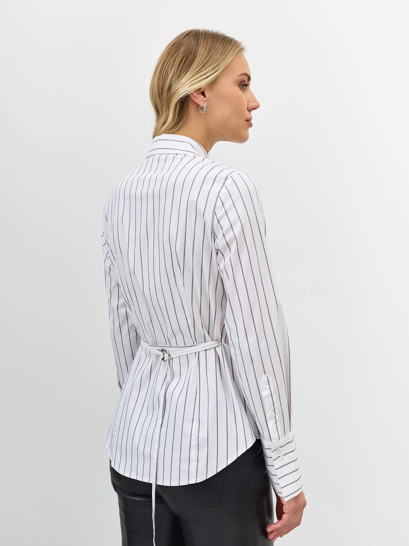 Рубашка приталенного силуэта в тонкую контрастную полоску. Отложной воротник. Застежка на пуговицы. Широкие манжеты по низу рукавов. Дополнена тонким съемным поясом с металлической пряжкой. В составе хлопок.