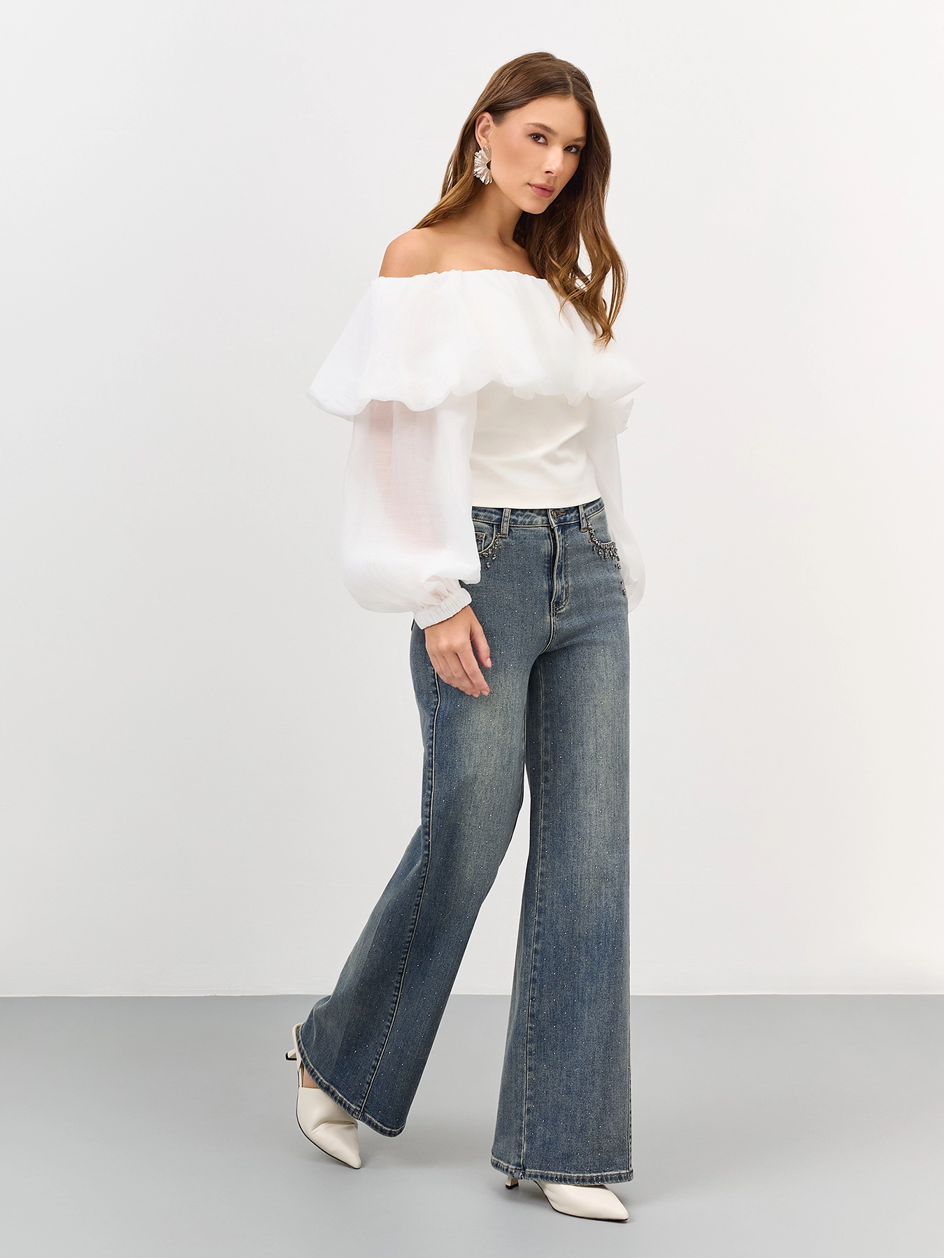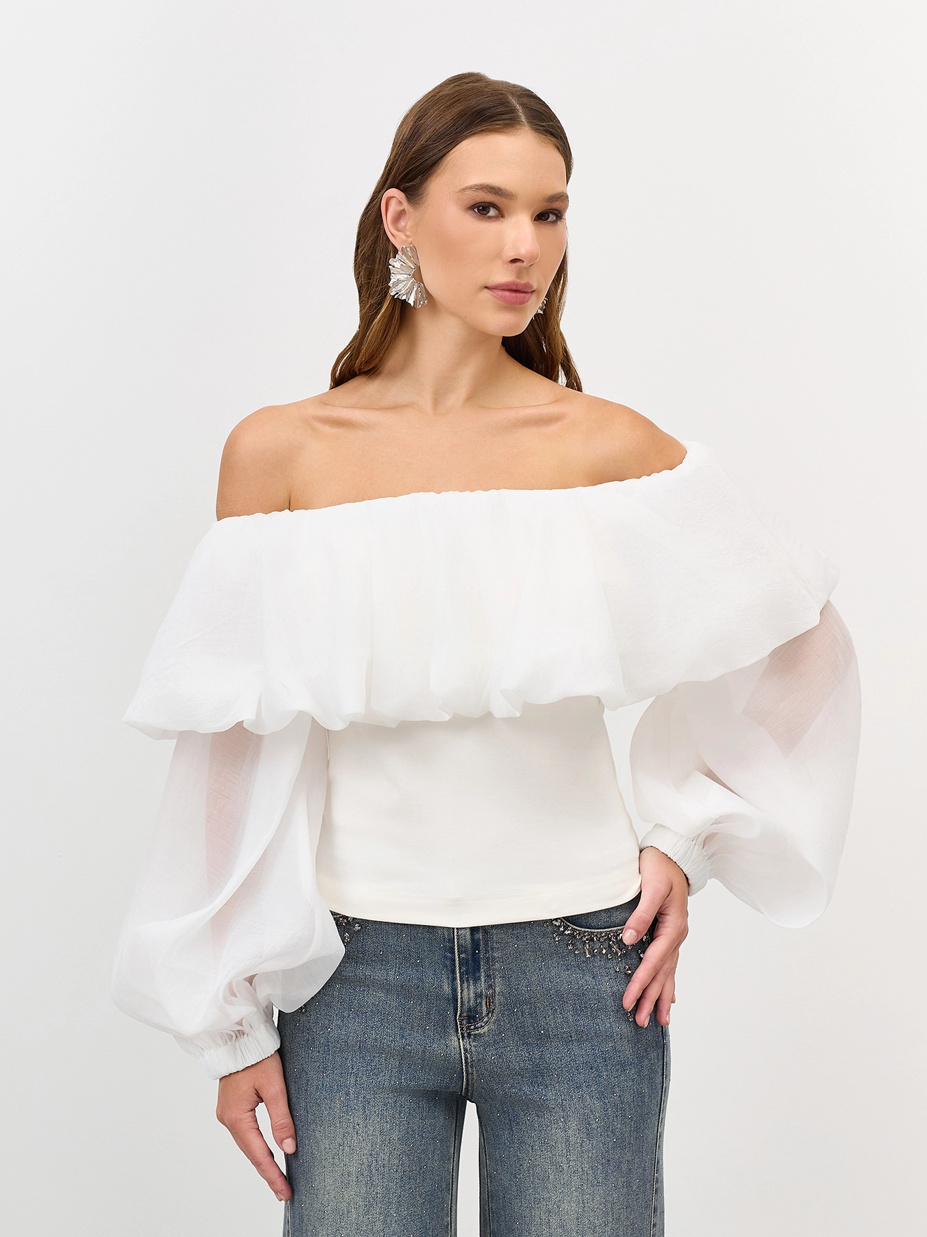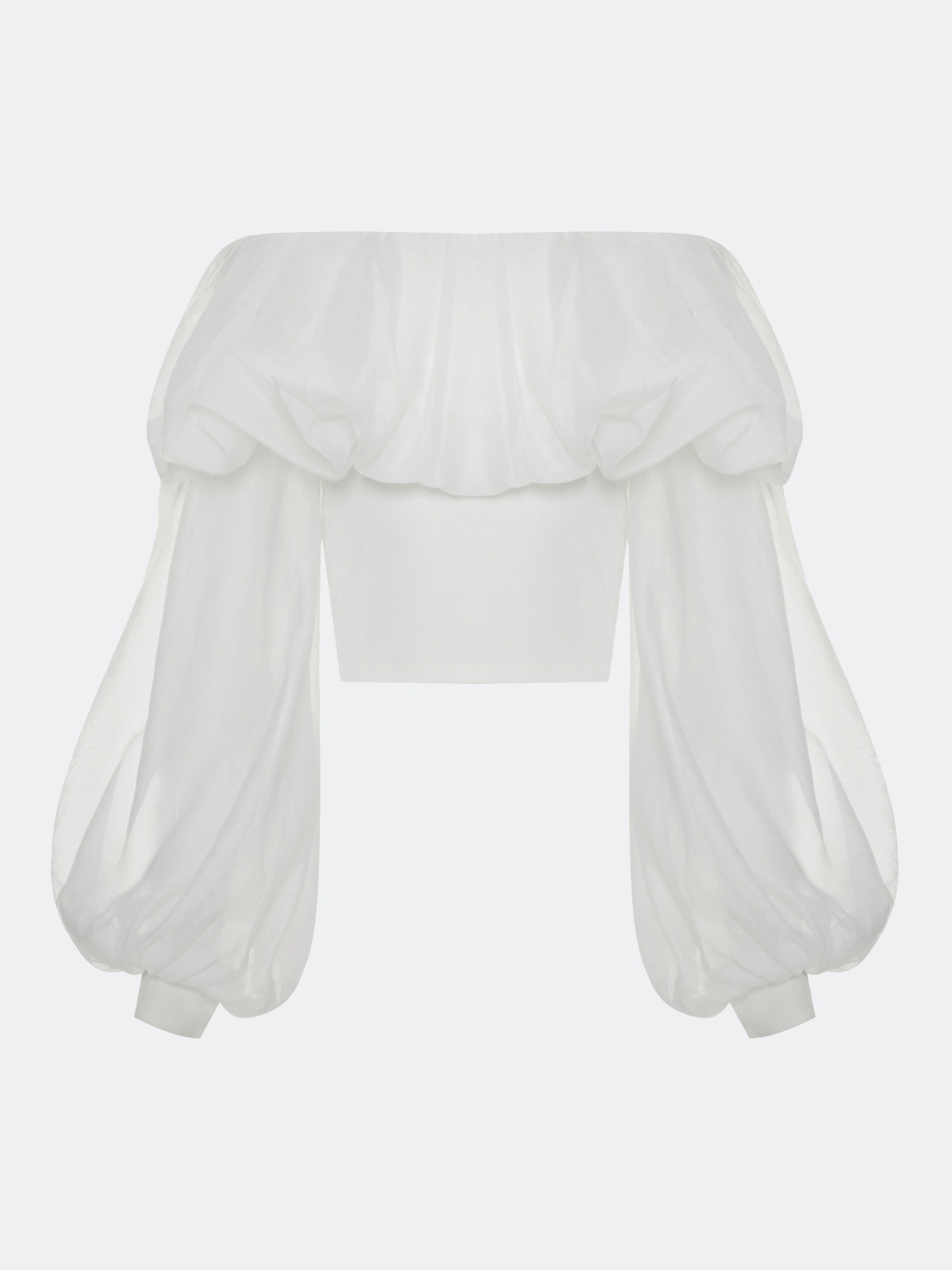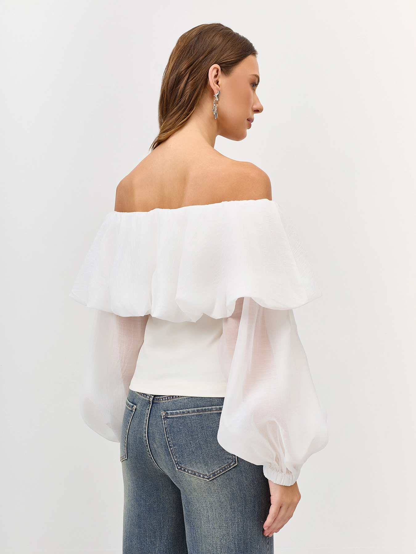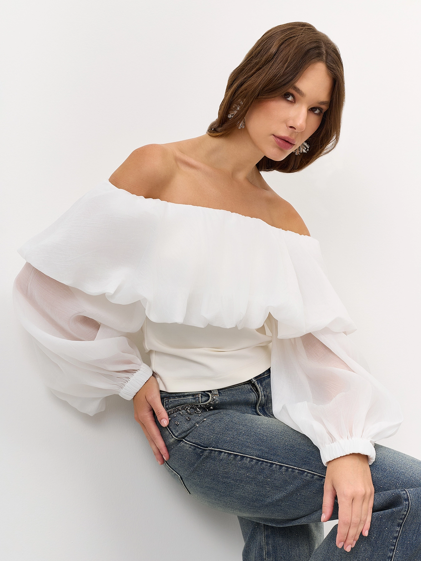 Романтичная укороченная блузка с объемными рукавами и открытой линией плеч, украшенной объемным воланом. Прилегающий силуэт. Длинные объемные полупрозрачные рукава-фонарики с манжетами по низу. В составе вискоза.
