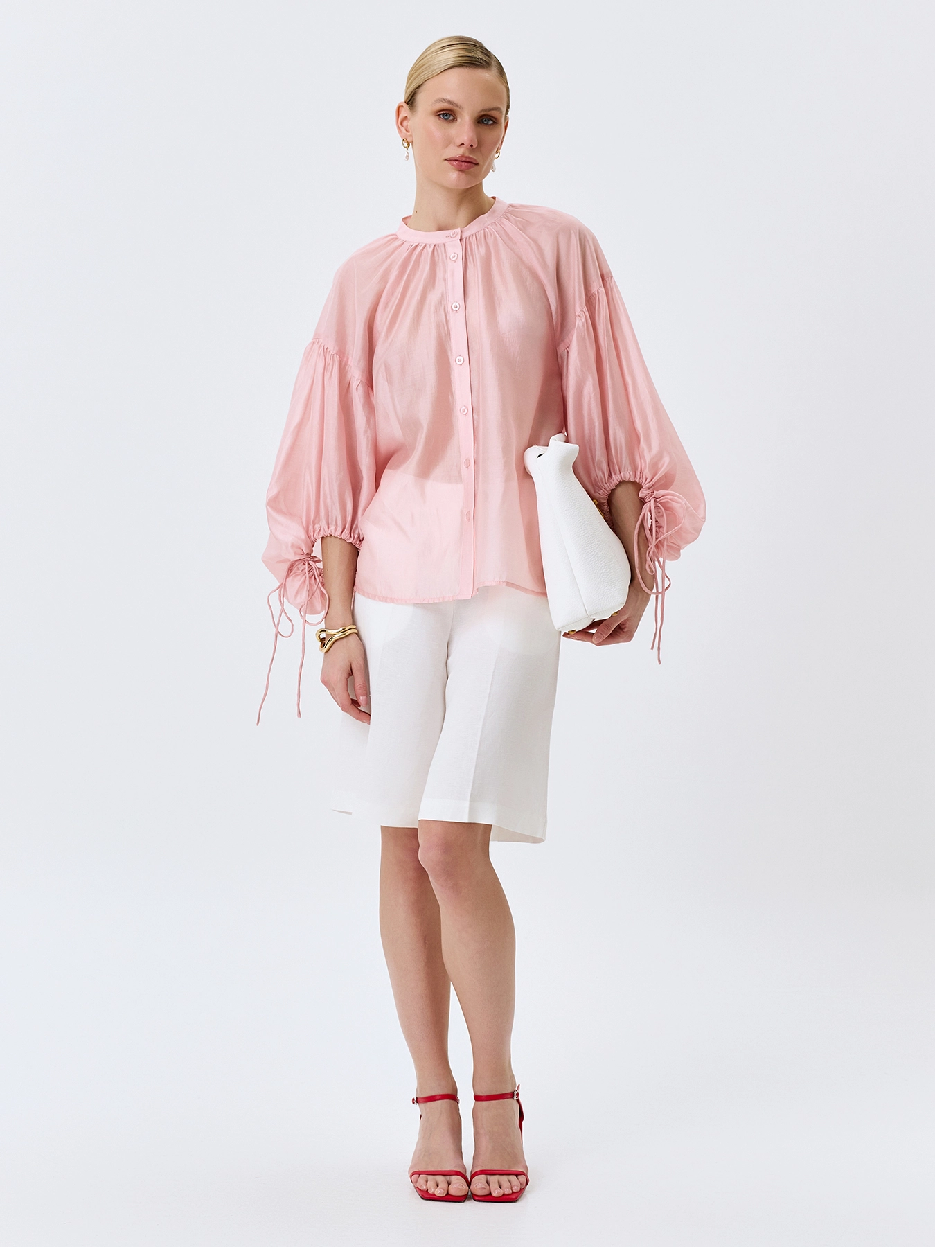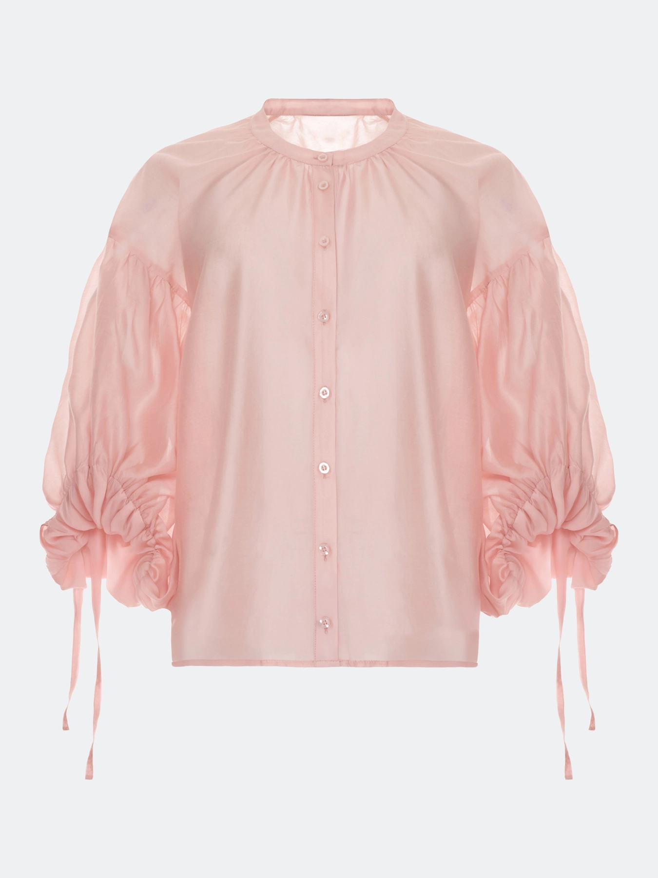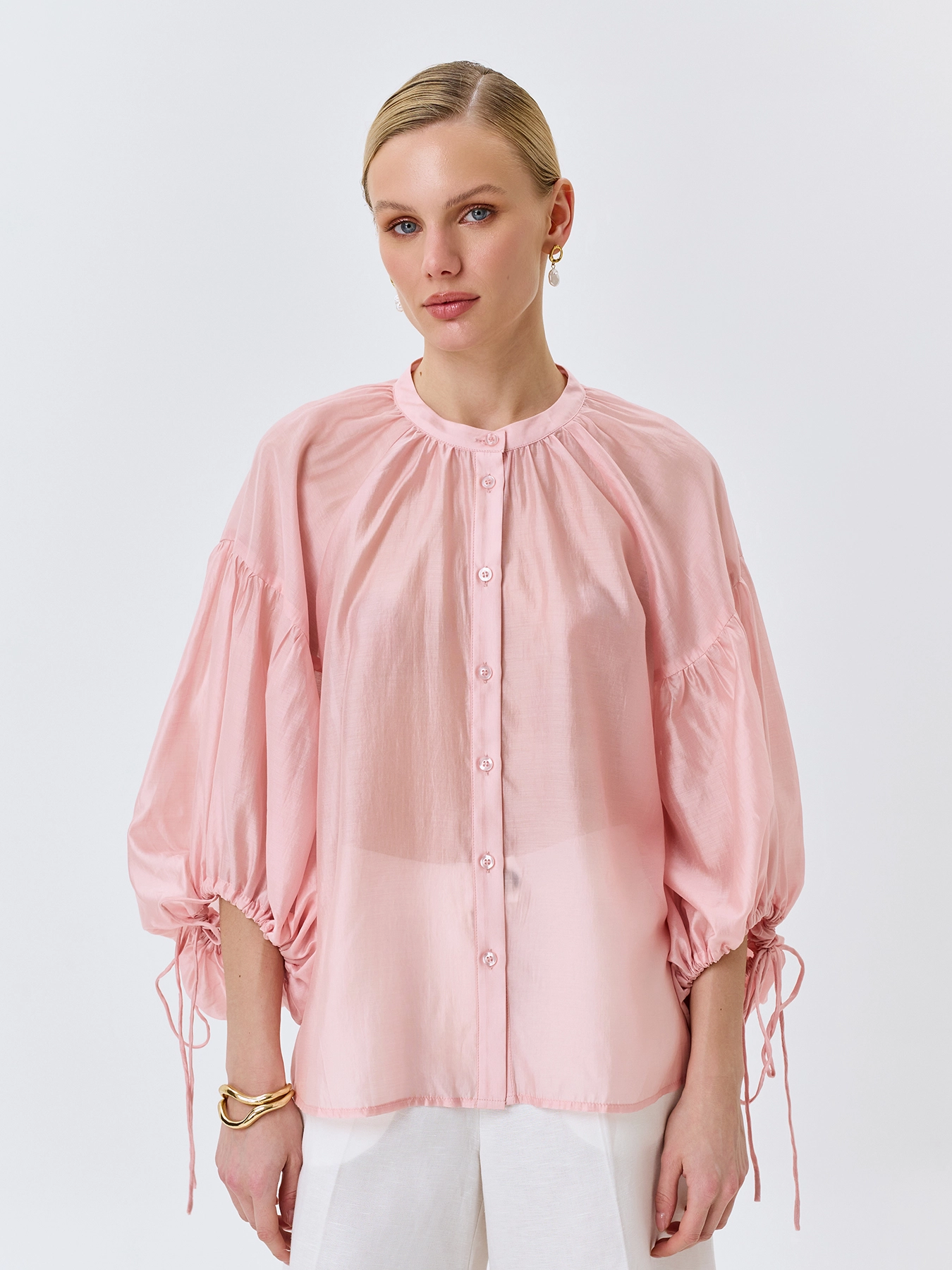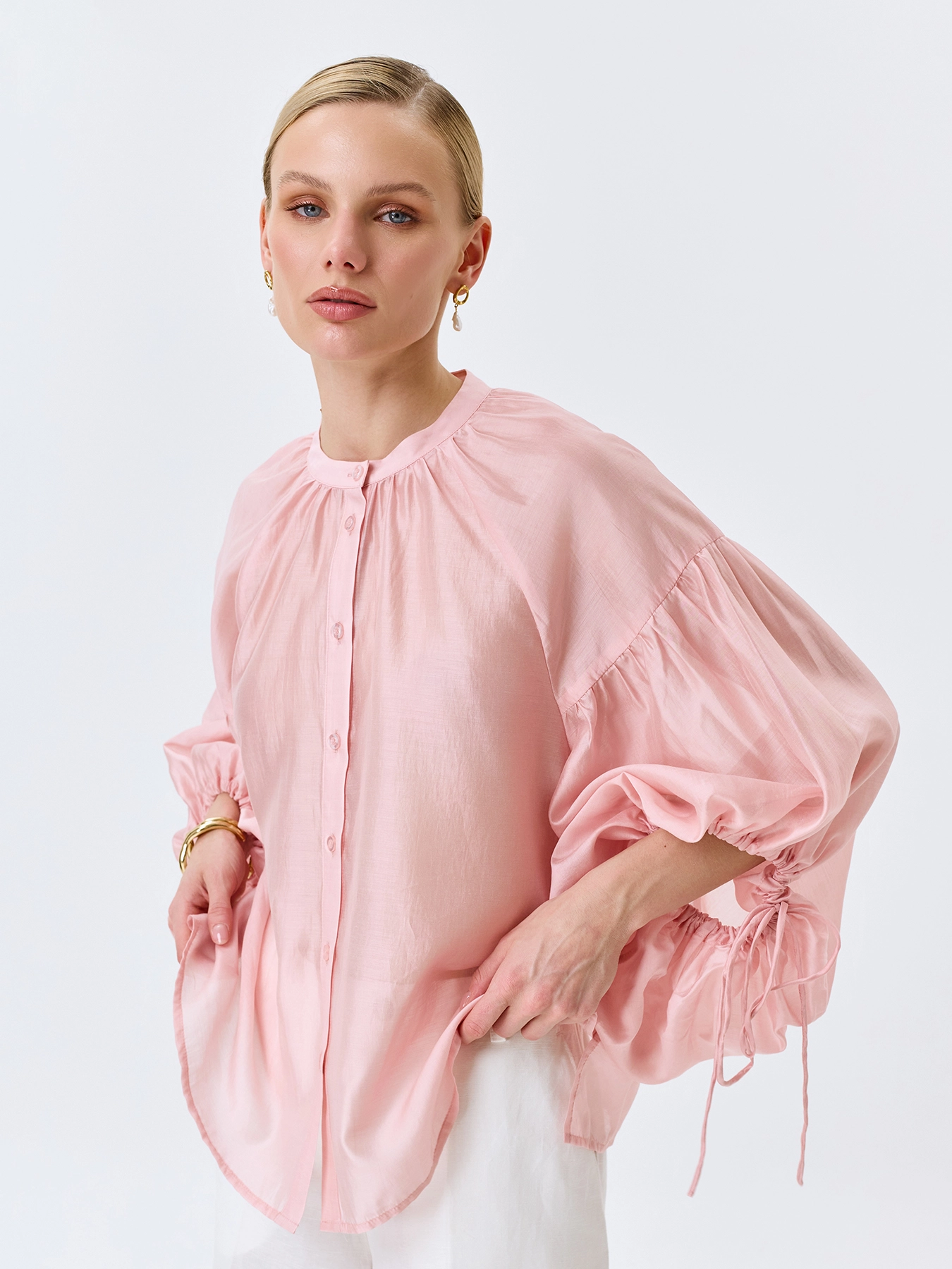 Романтичная блузка в стиле "Бохо-шик" с объёмными рукавами. Свободный силуэт. Круглый вырез. Застежка на пуговицы. Линия плеч немного спущена. Дополнена резинками и завязками по низу рукавов. В составе тенсель.