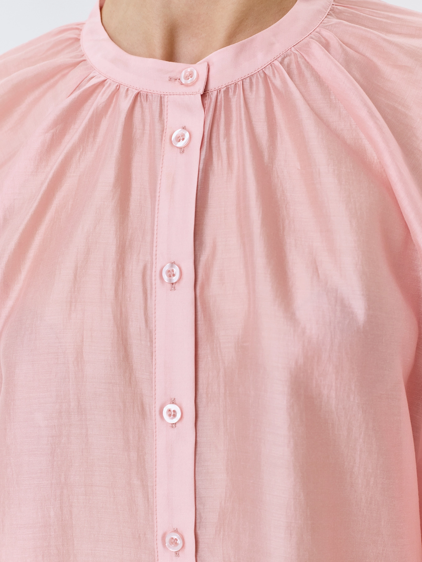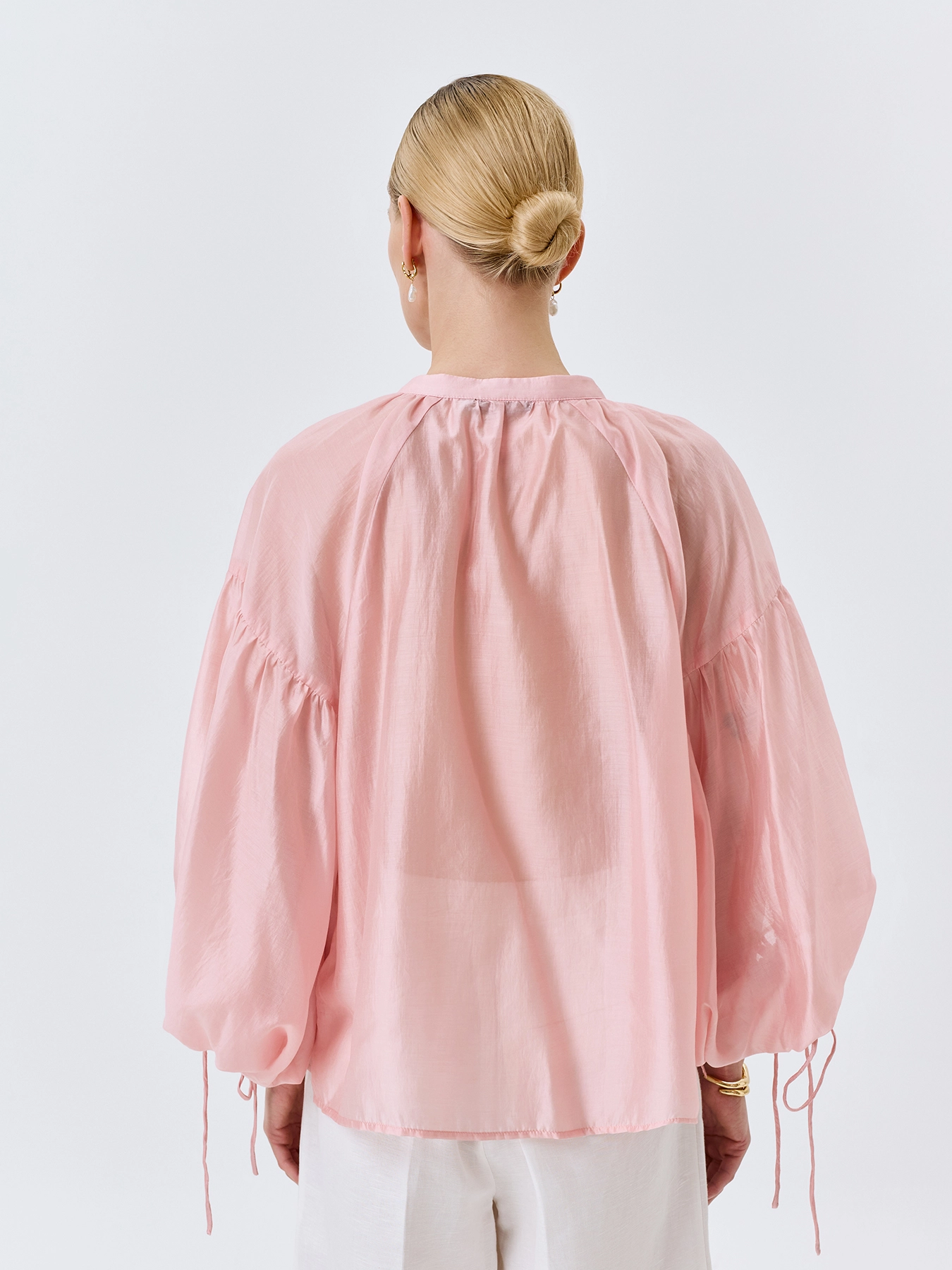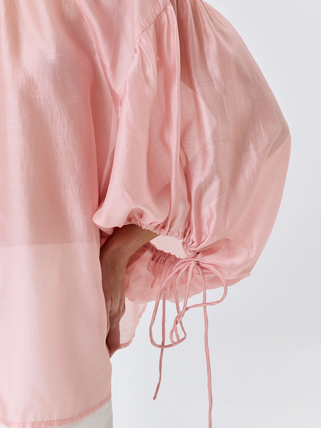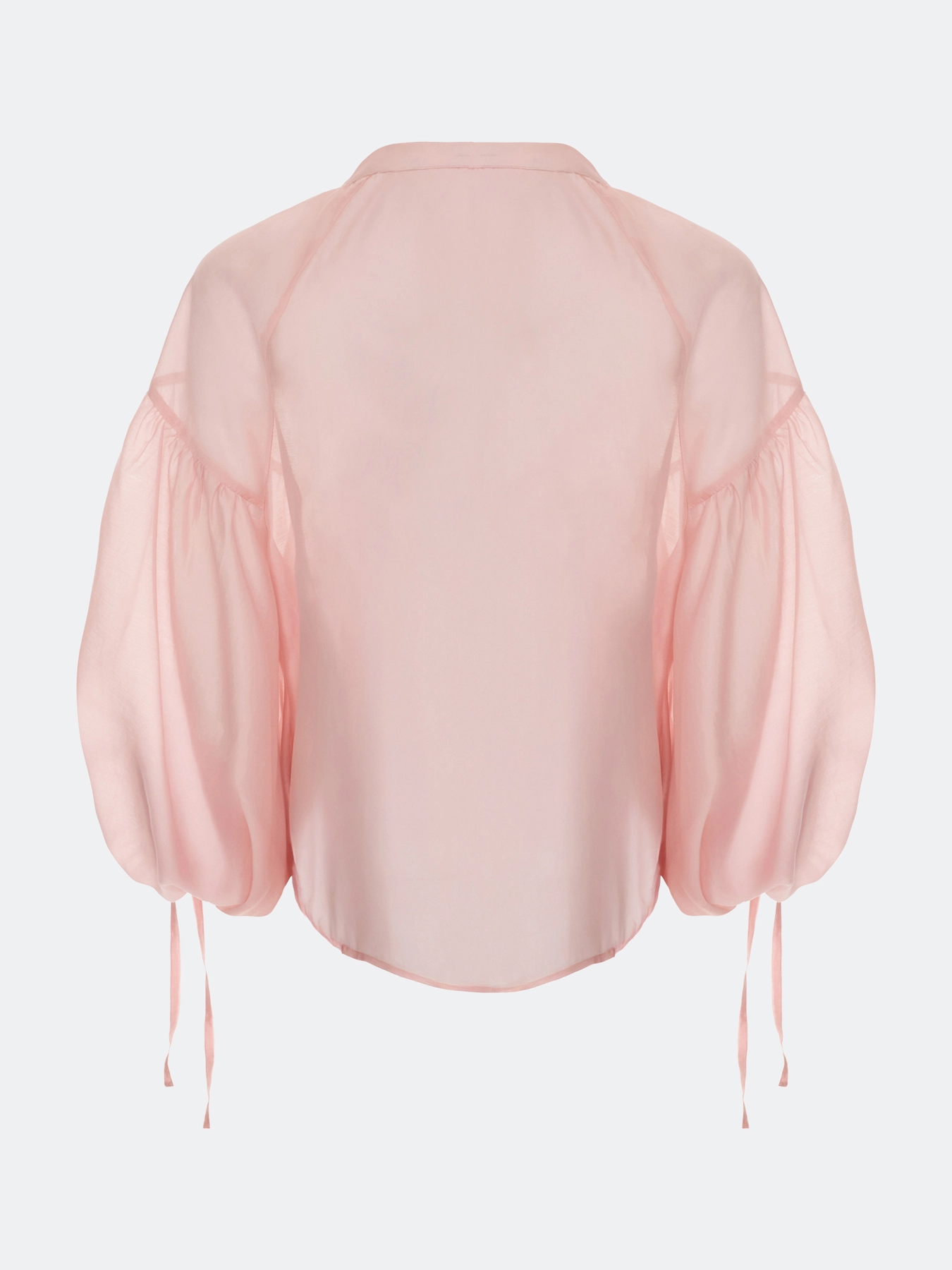 Романтичная блузка в стиле "Бохо-шик" с объёмными рукавами. Свободный силуэт. Круглый вырез. Застежка на пуговицы. Линия плеч немного спущена. Дополнена резинками и завязками по низу рукавов. В составе тенсель.