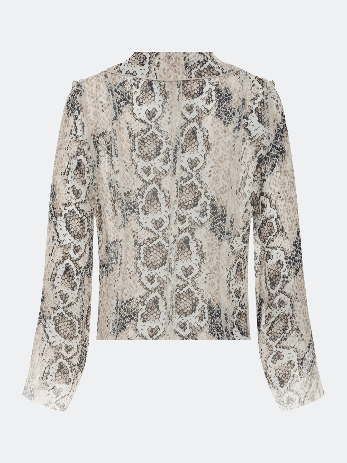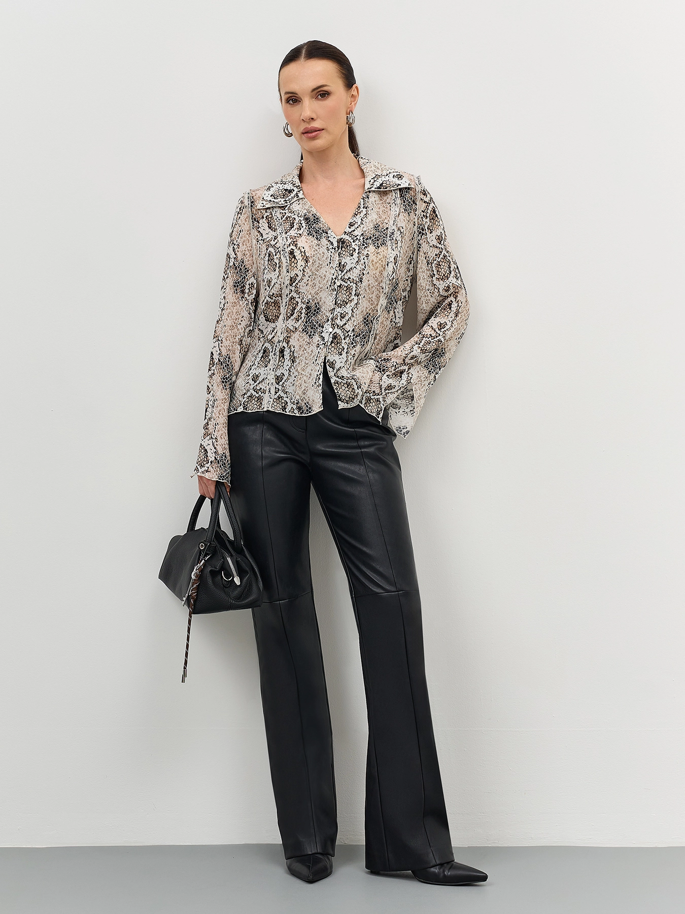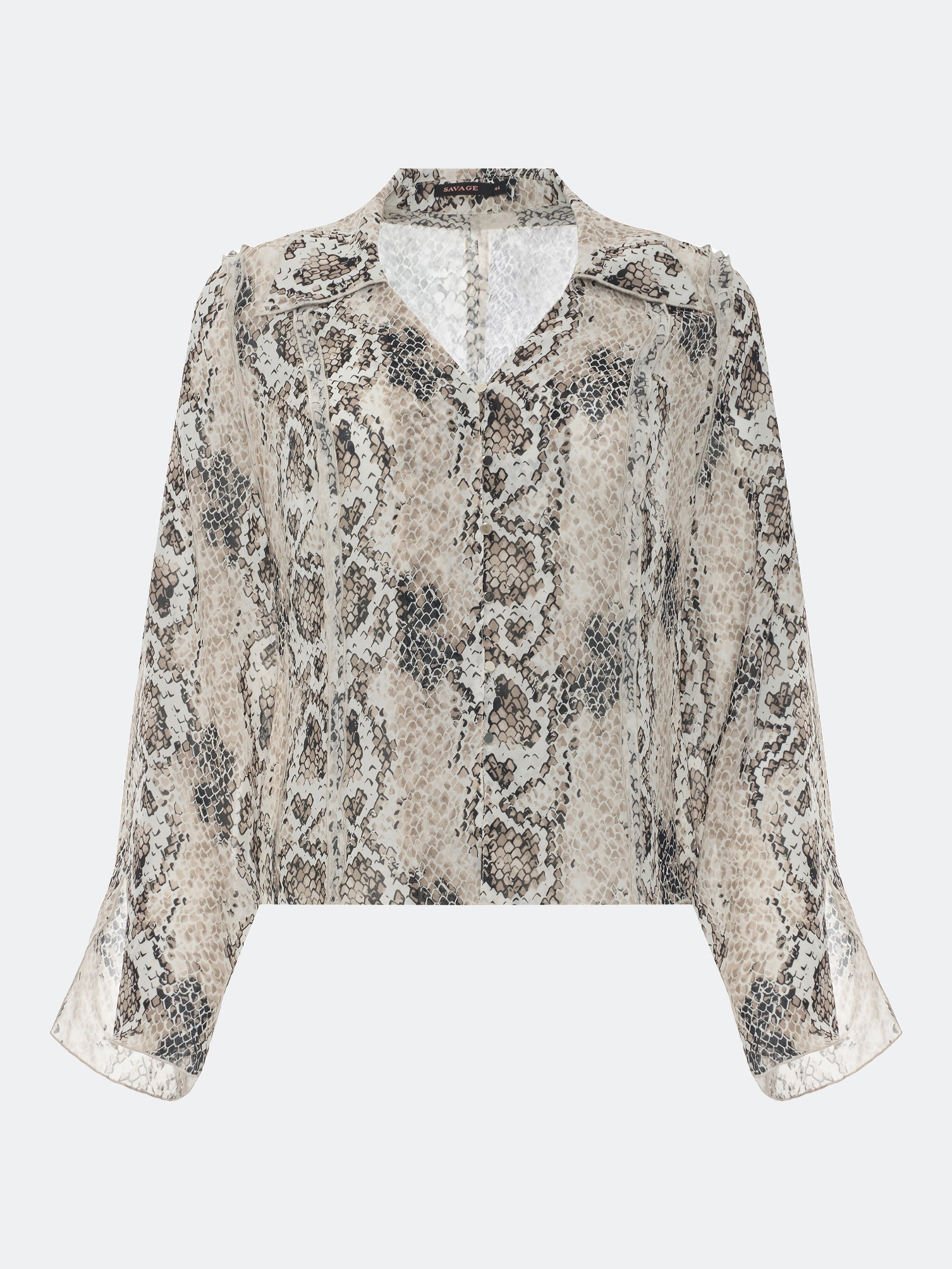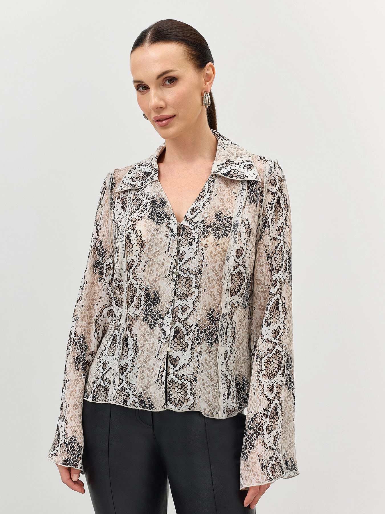 Яркая блузка из 100% вискозы с анималистичным принтом. Прямой силуэт. V-образный вырез. Широкий отложной воротник. Застежка на пуговицы и навесные петли. Акцентные открытые швы. Разрезы по низу рукавов.