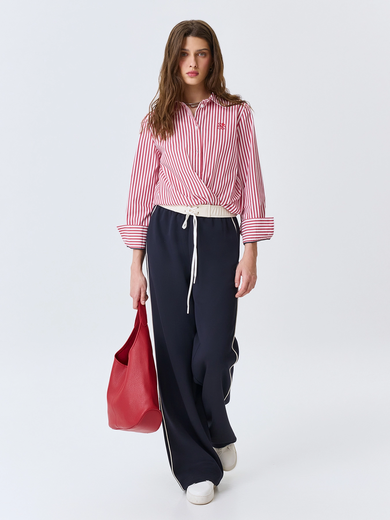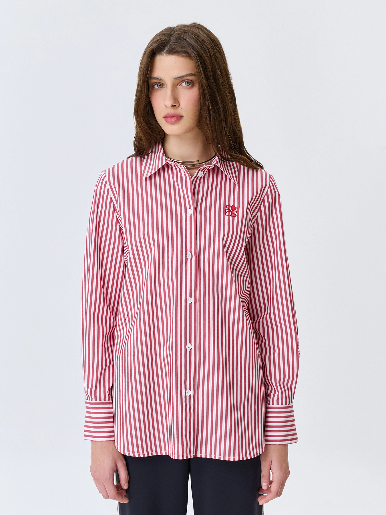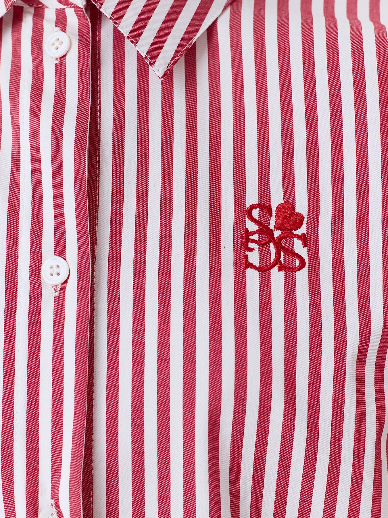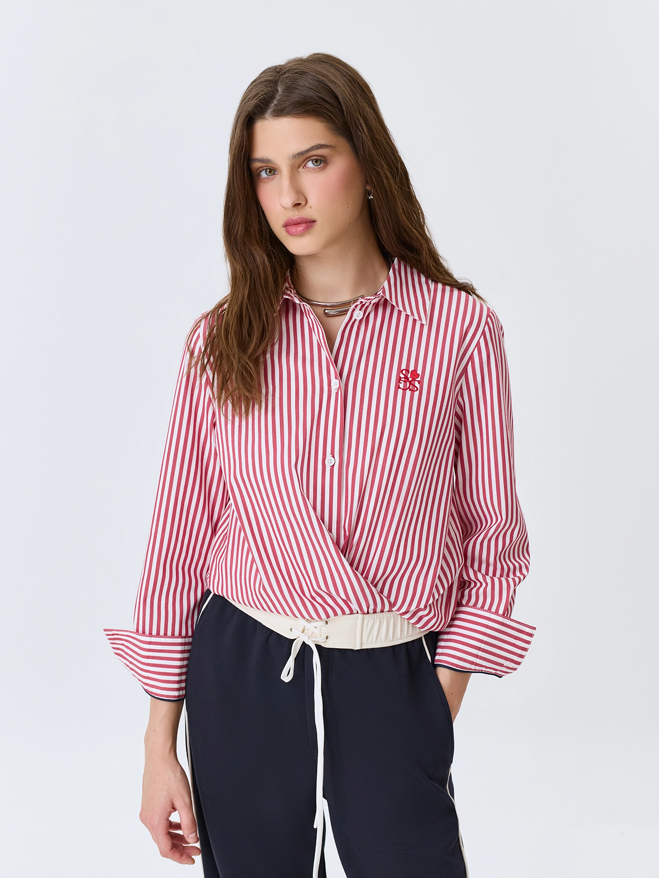 Яркая рубашка из смесового хлопка в полоску. Прямой силуэт. Отложной воротник. Застежка на пуговицы. Длинные втачные рукава дополнены удлиненными манжетами. Деликатная вышивка на груди. В составе хлопок и нейлон.