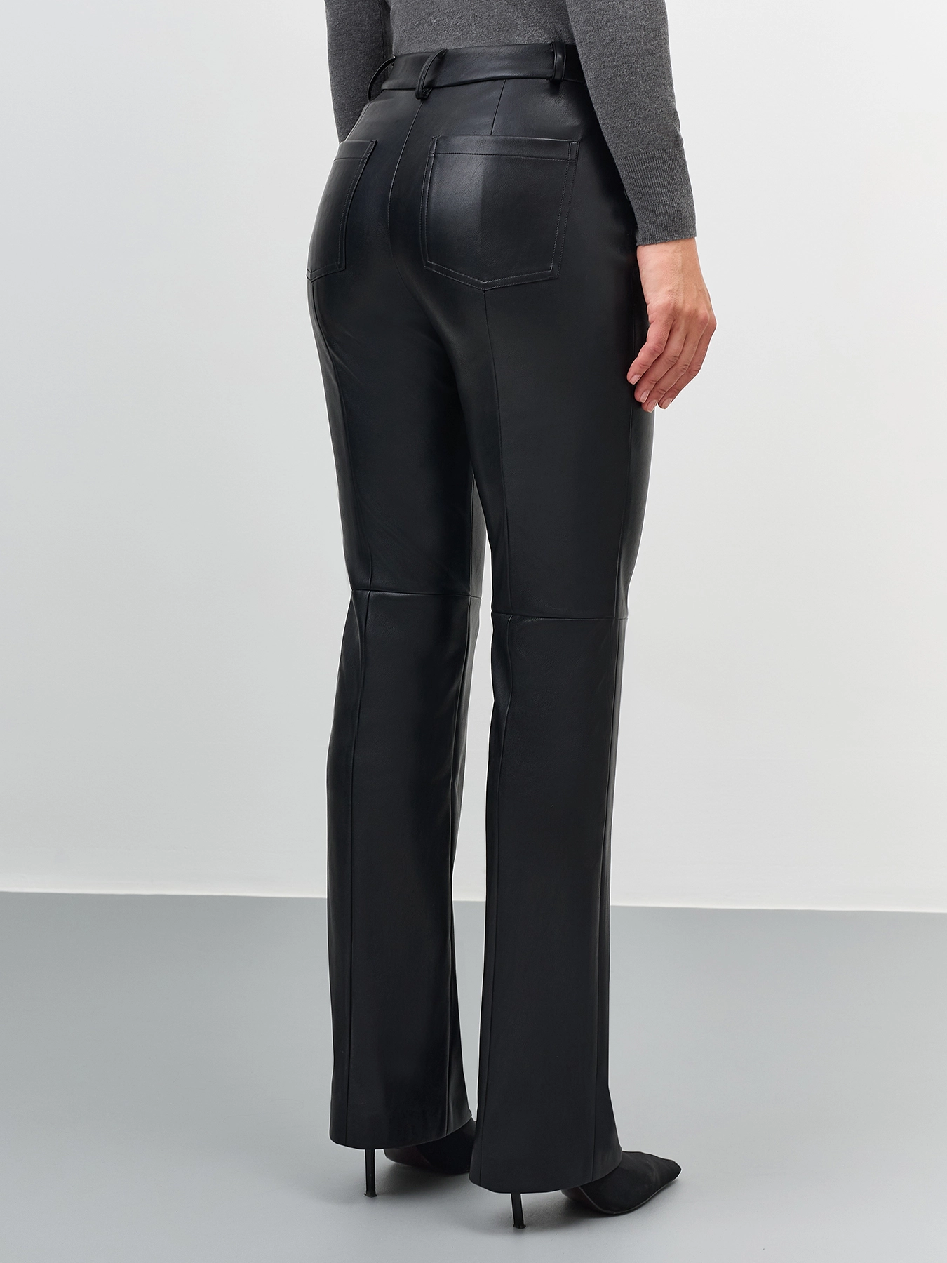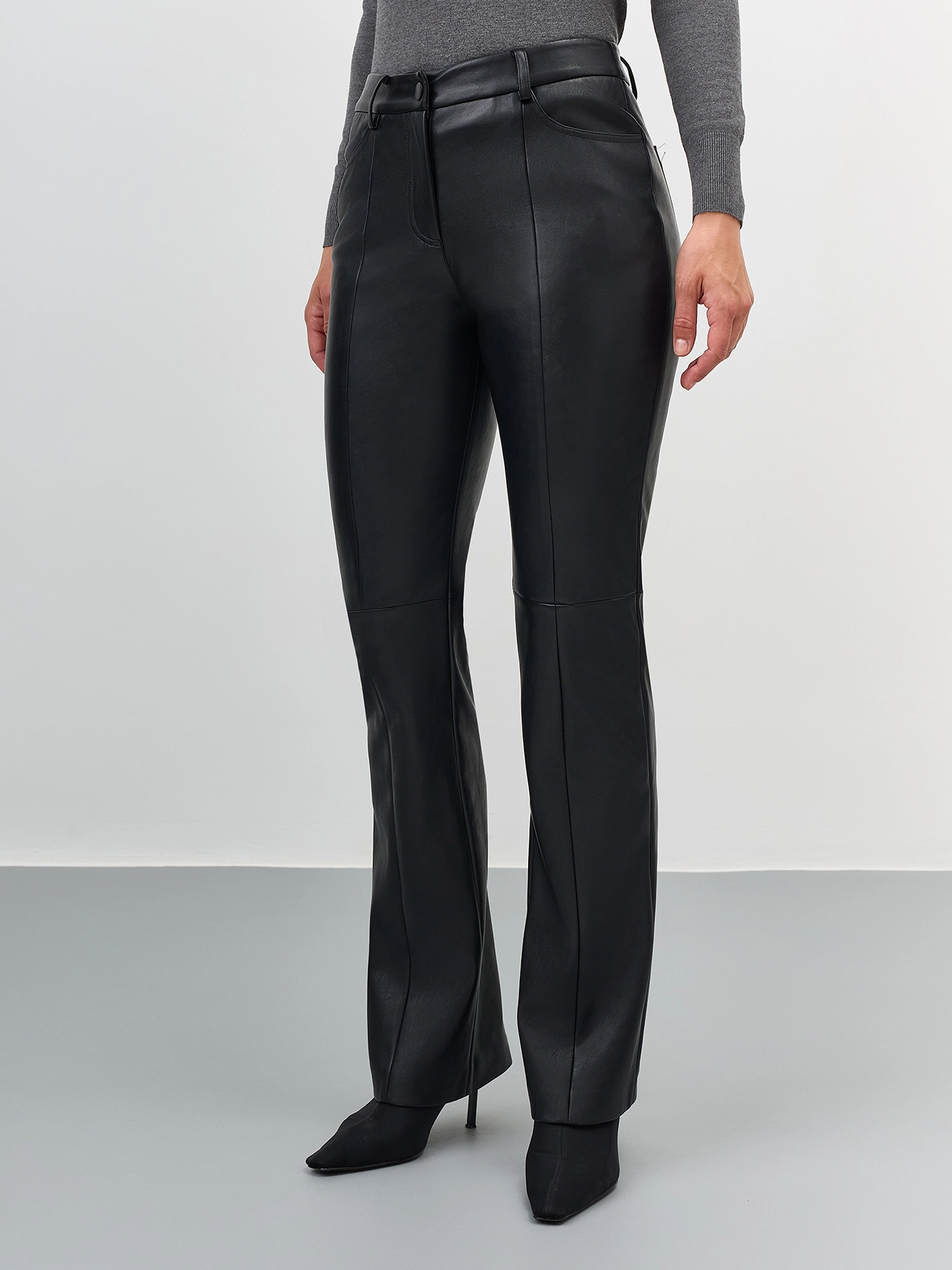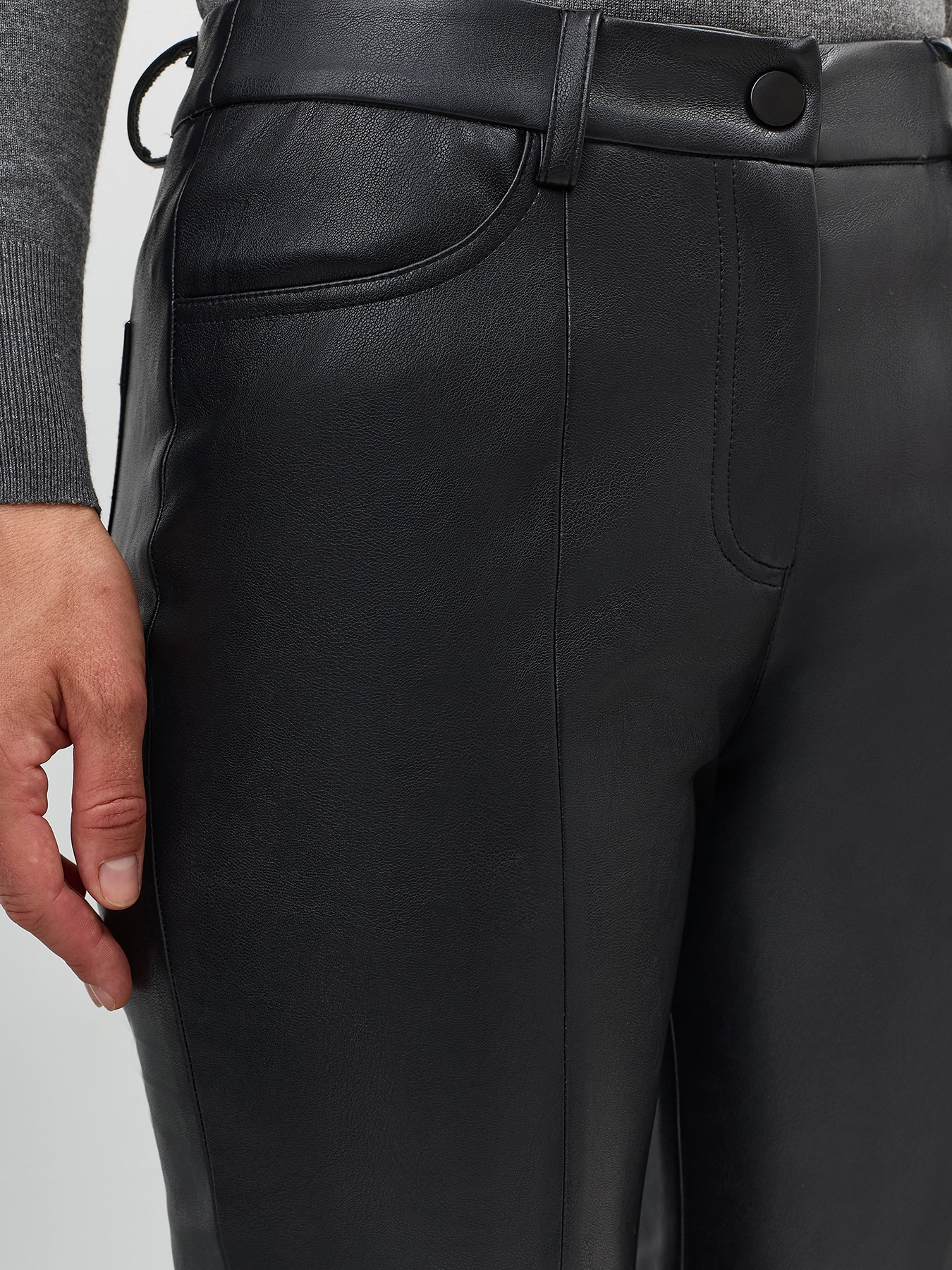 Брюки из экокожи прямого силуэта. Застежка на молнию и кнопку. Боковые карманы в швах. Вертикальные рельефные швы вытягивают силуэт.