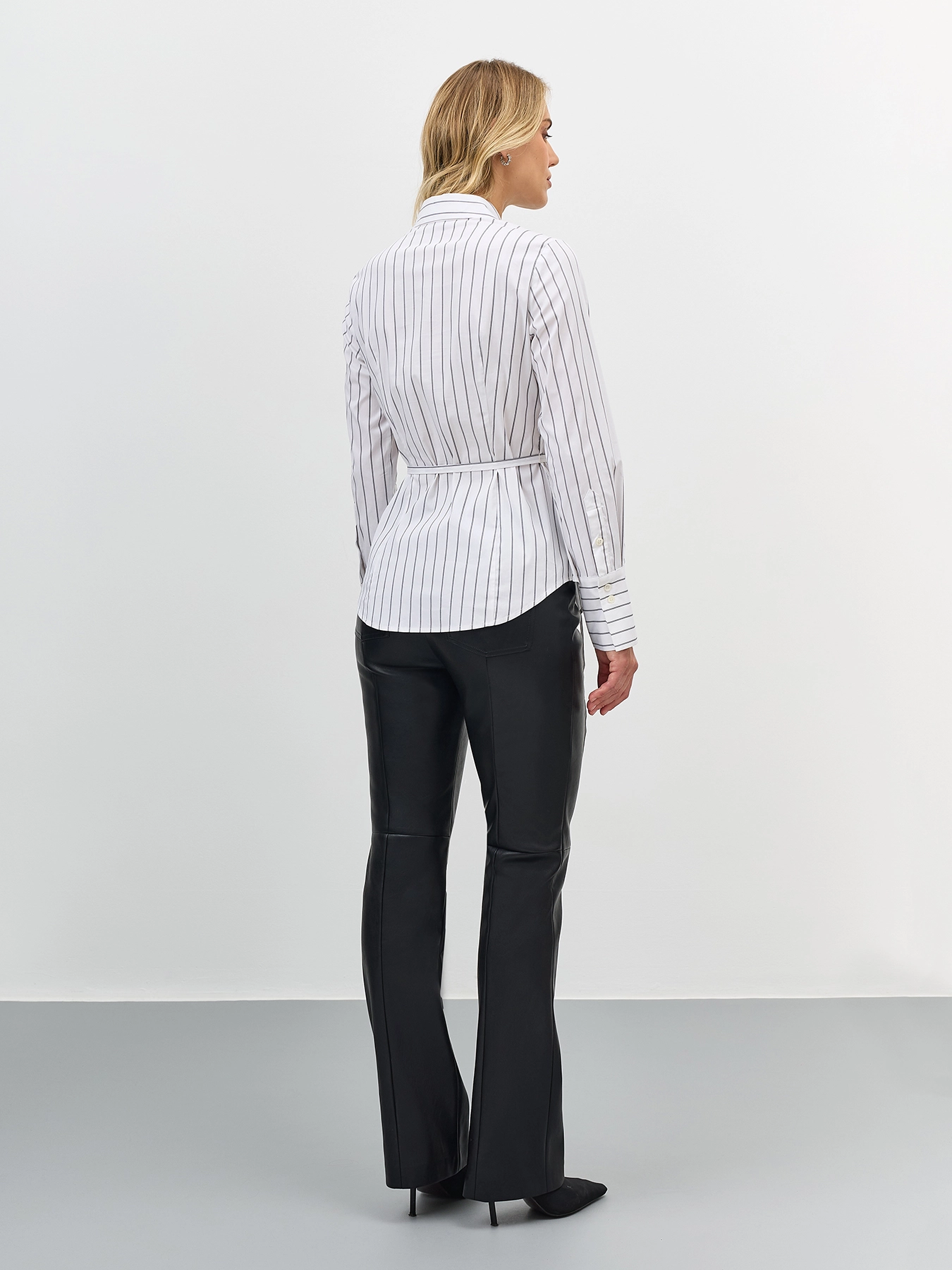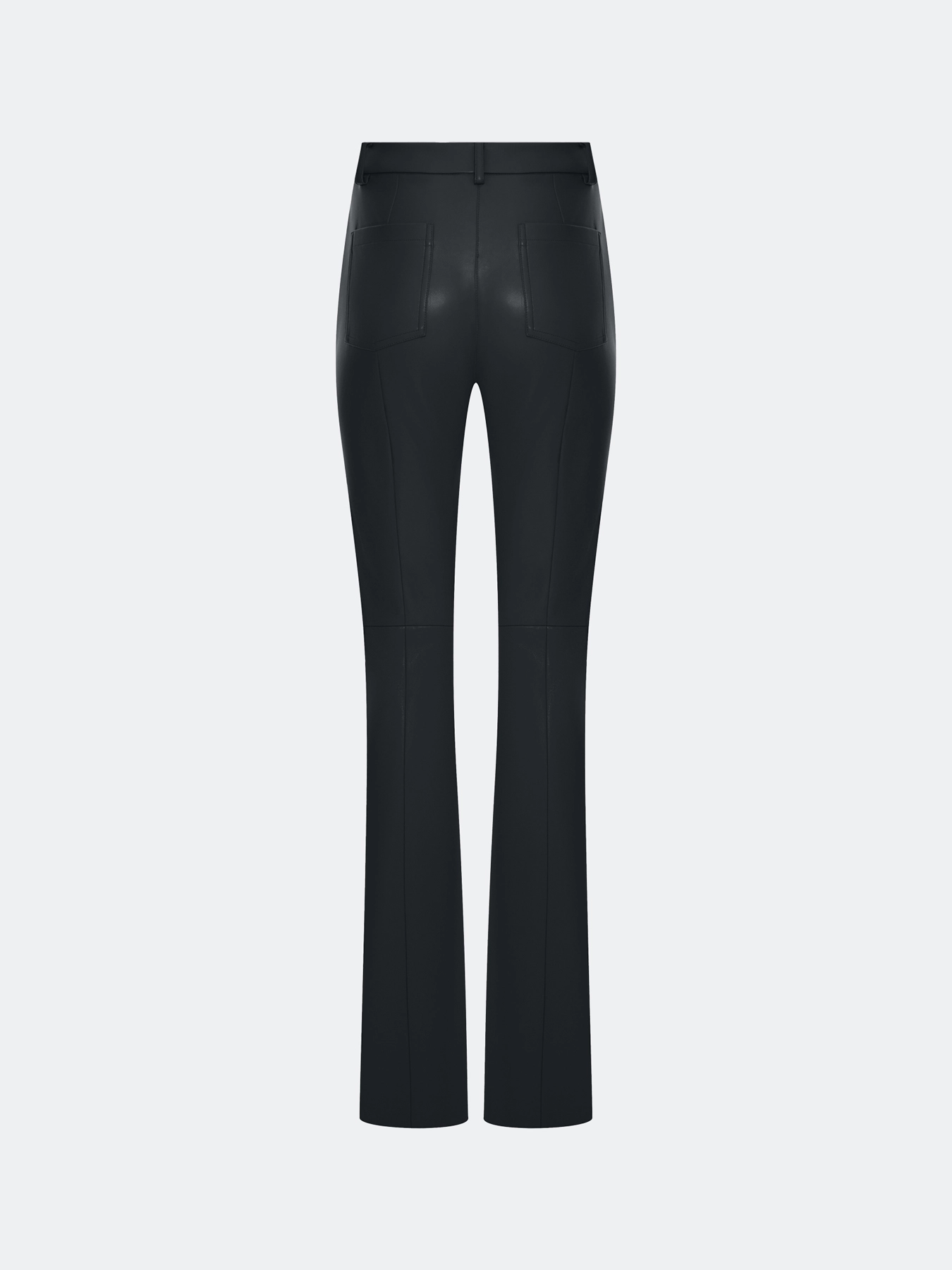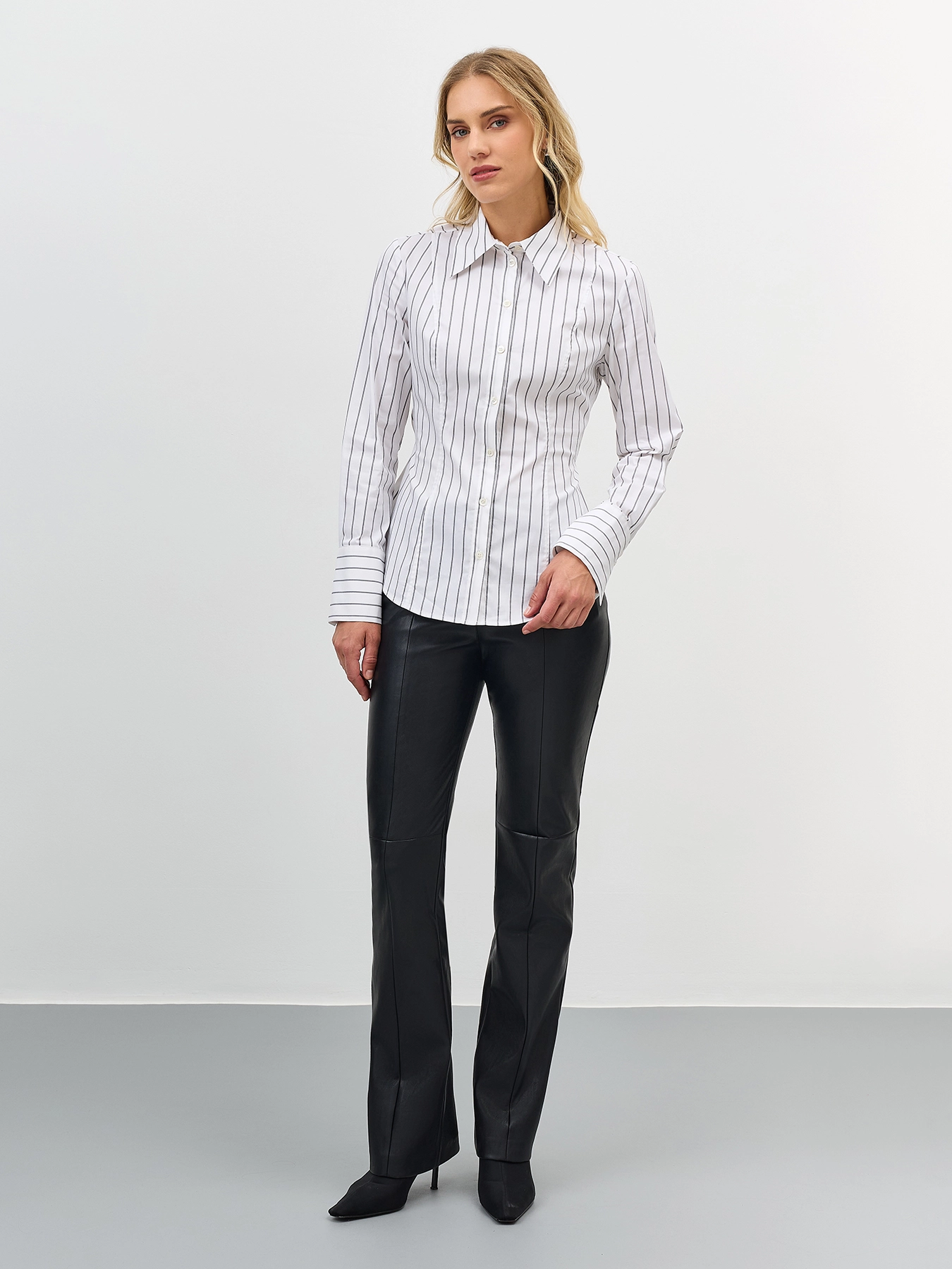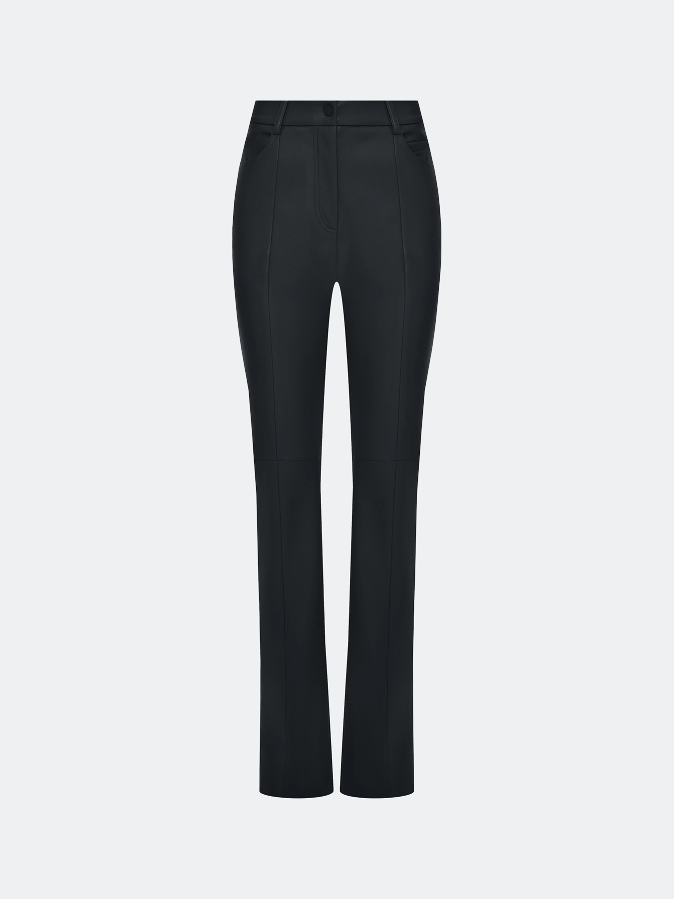 Брюки из экокожи прямого силуэта. Застежка на молнию и кнопку. Боковые карманы в швах. Вертикальные рельефные швы вытягивают силуэт.