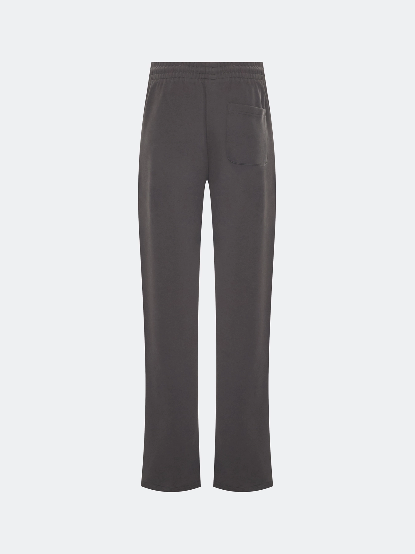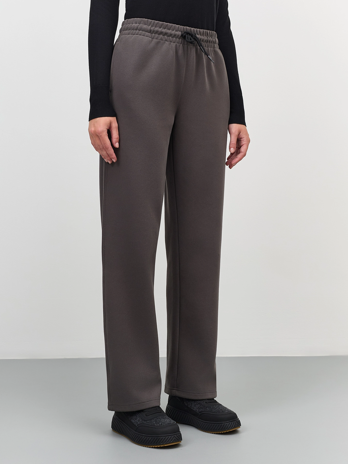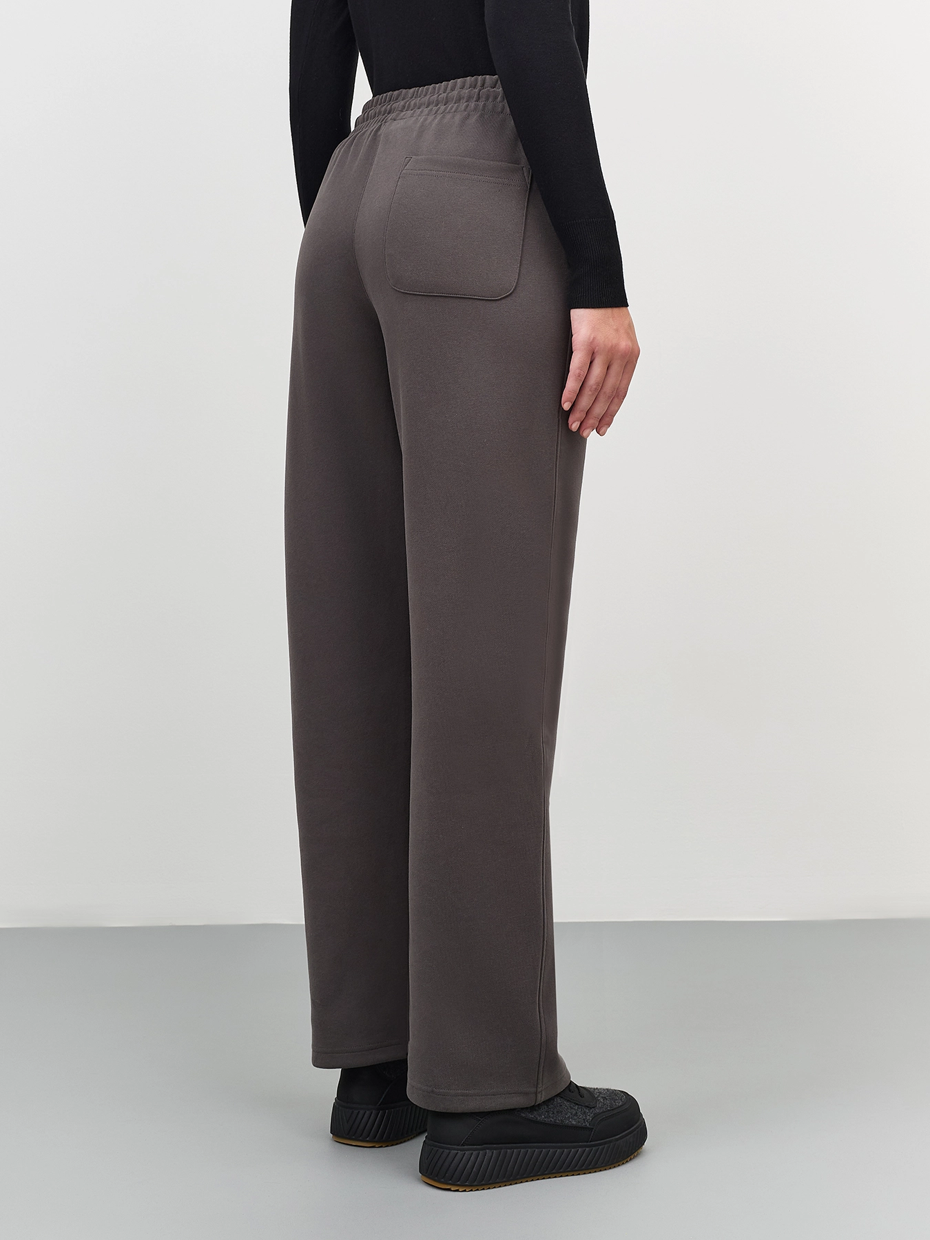 Хлопковые графитовые брюки прямого силуэта. Резинка и шнурок по линии талии. Боковые карманы в швах. Дополнены одним задним накладным карманом. Комплект с60887.