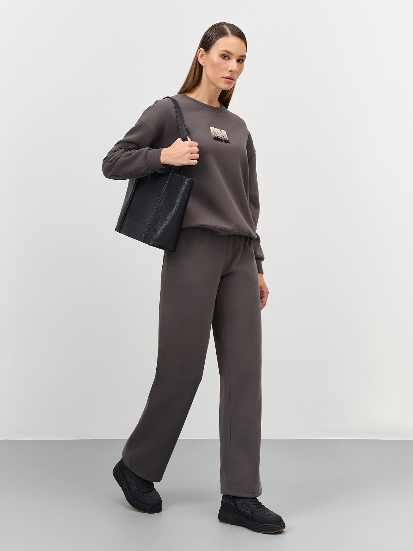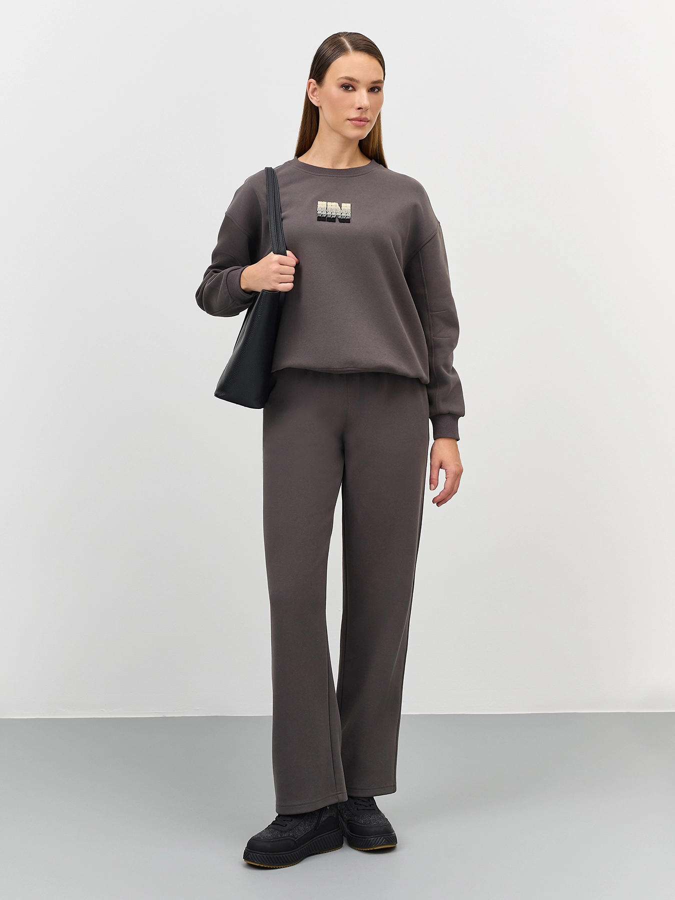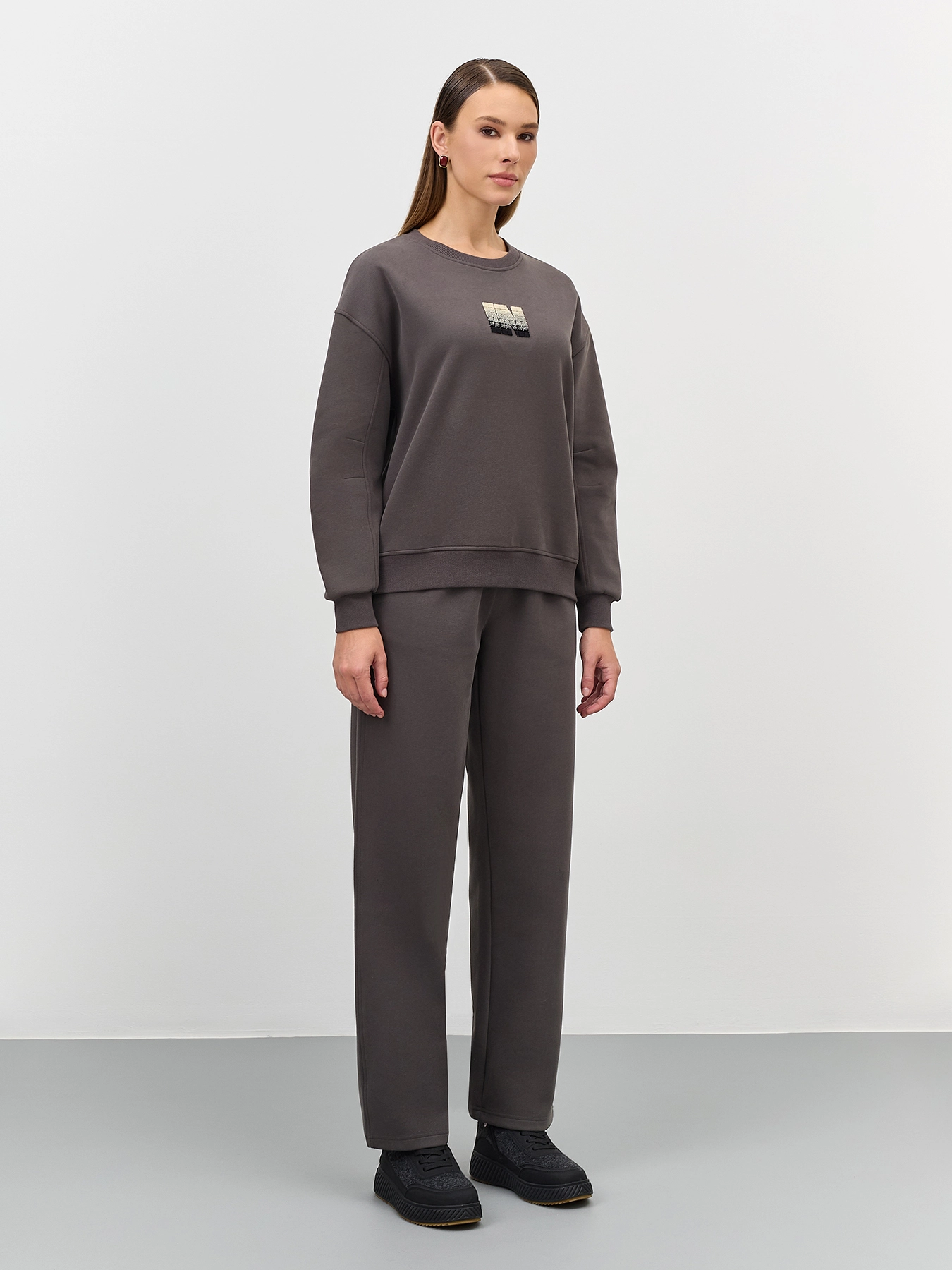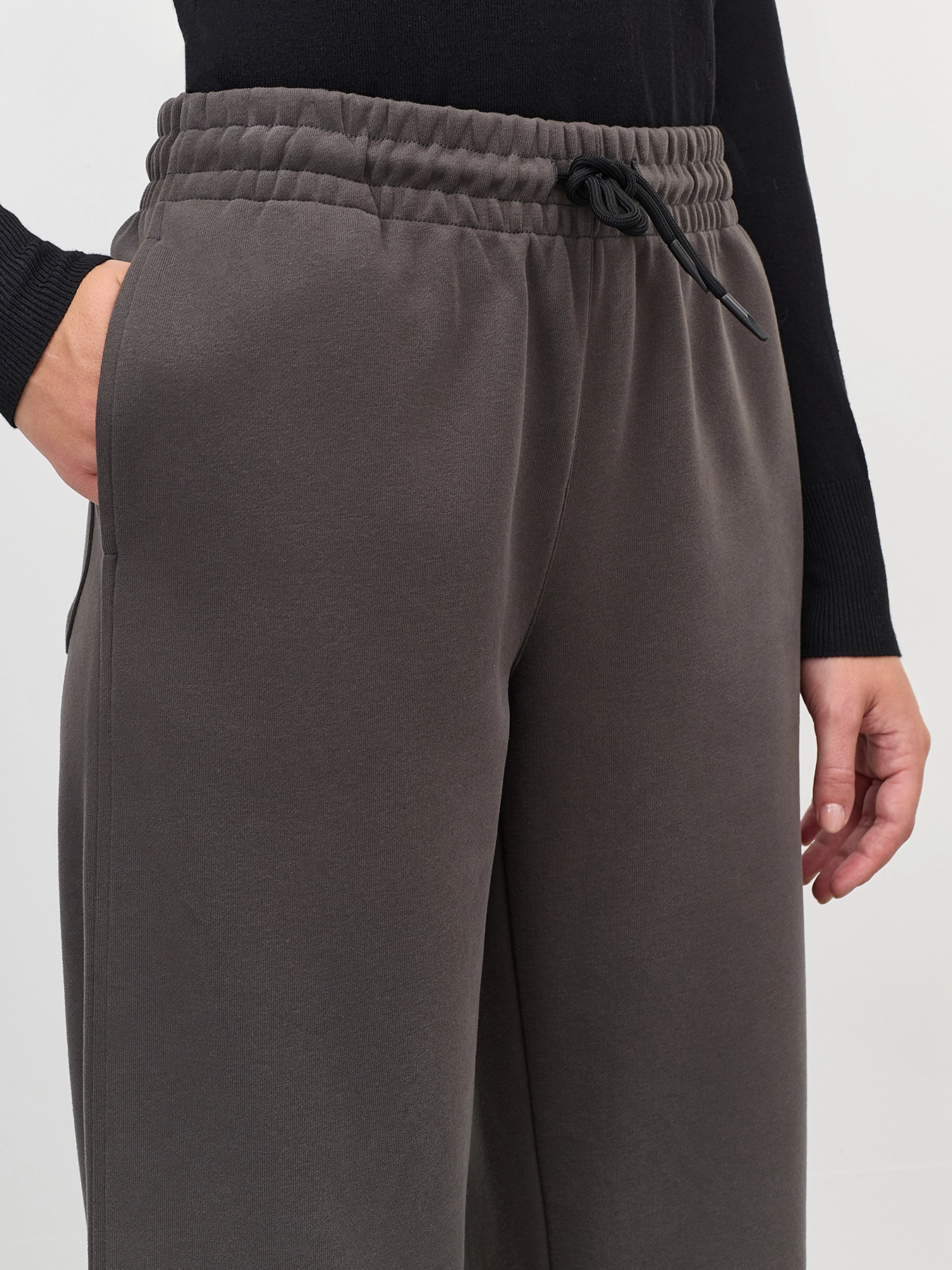 Хлопковые графитовые брюки прямого силуэта. Резинка и шнурок по линии талии. Боковые карманы в швах. Дополнены одним задним накладным карманом. Комплект с60887.