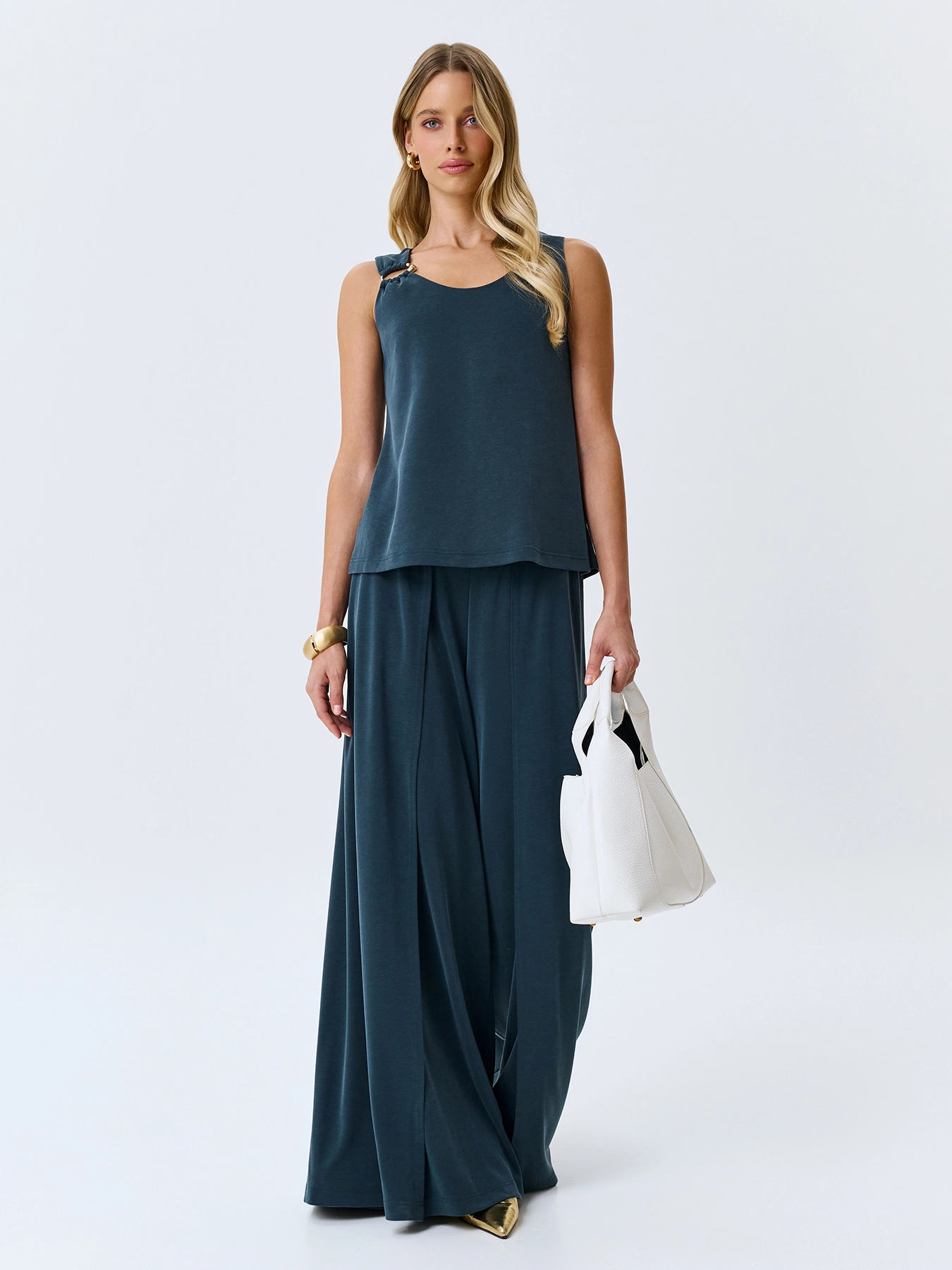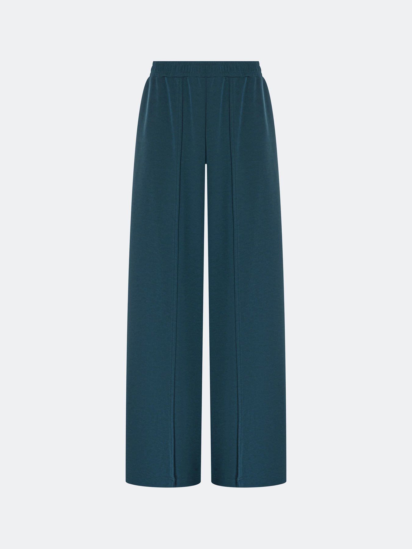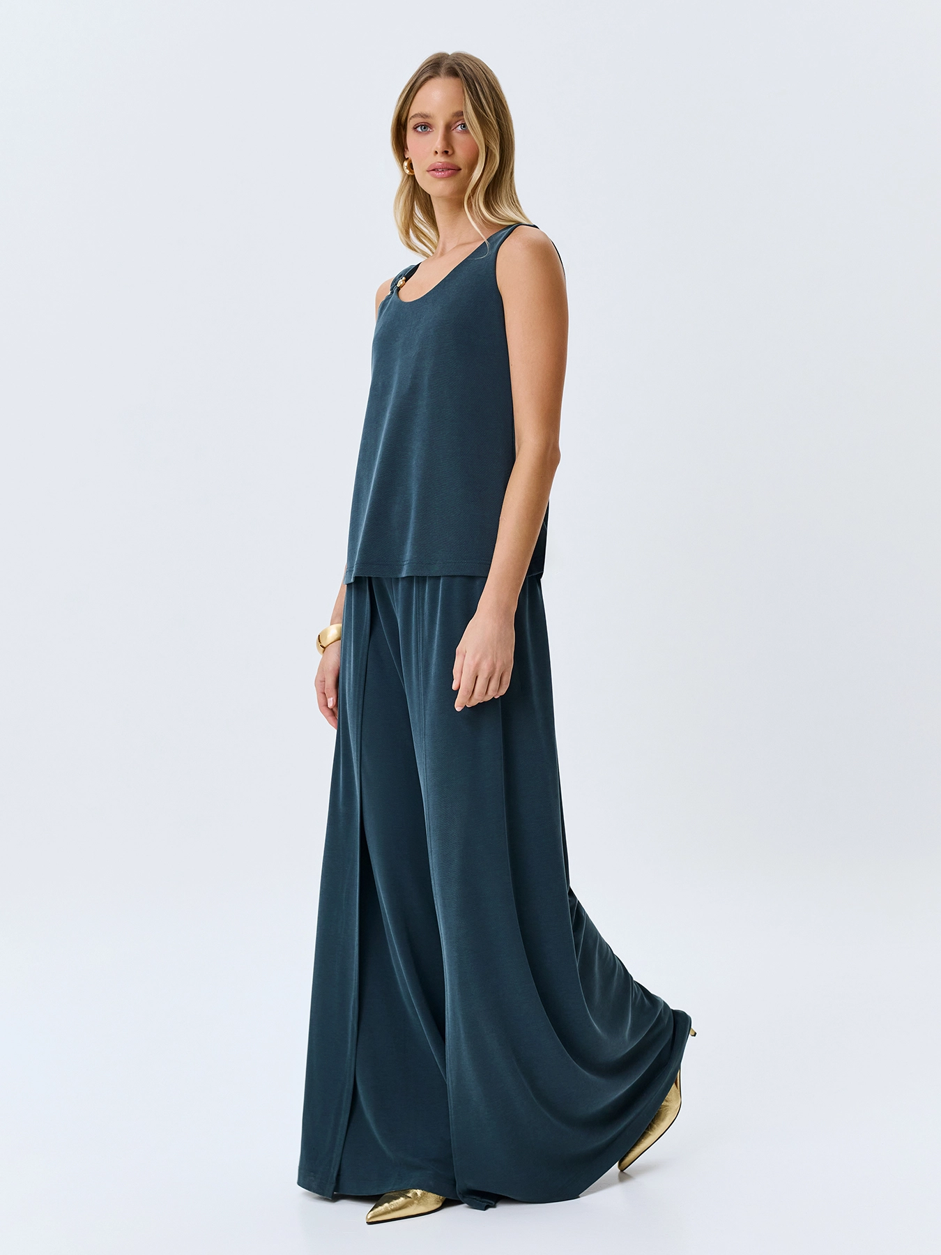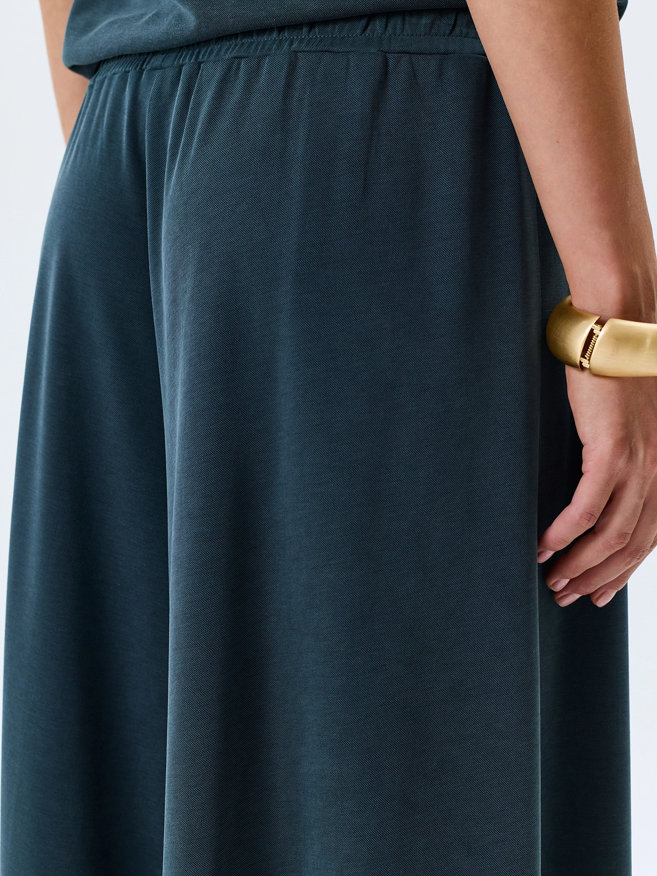 Широкие брюки палаццо из модала. Резинка по линии талии. Дополнены мягкими глубокими складками и высокими разрезами. Комплект с 63853.