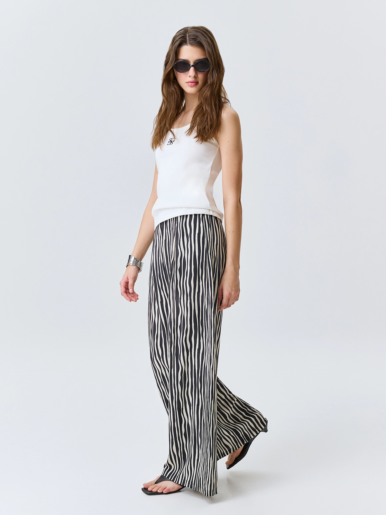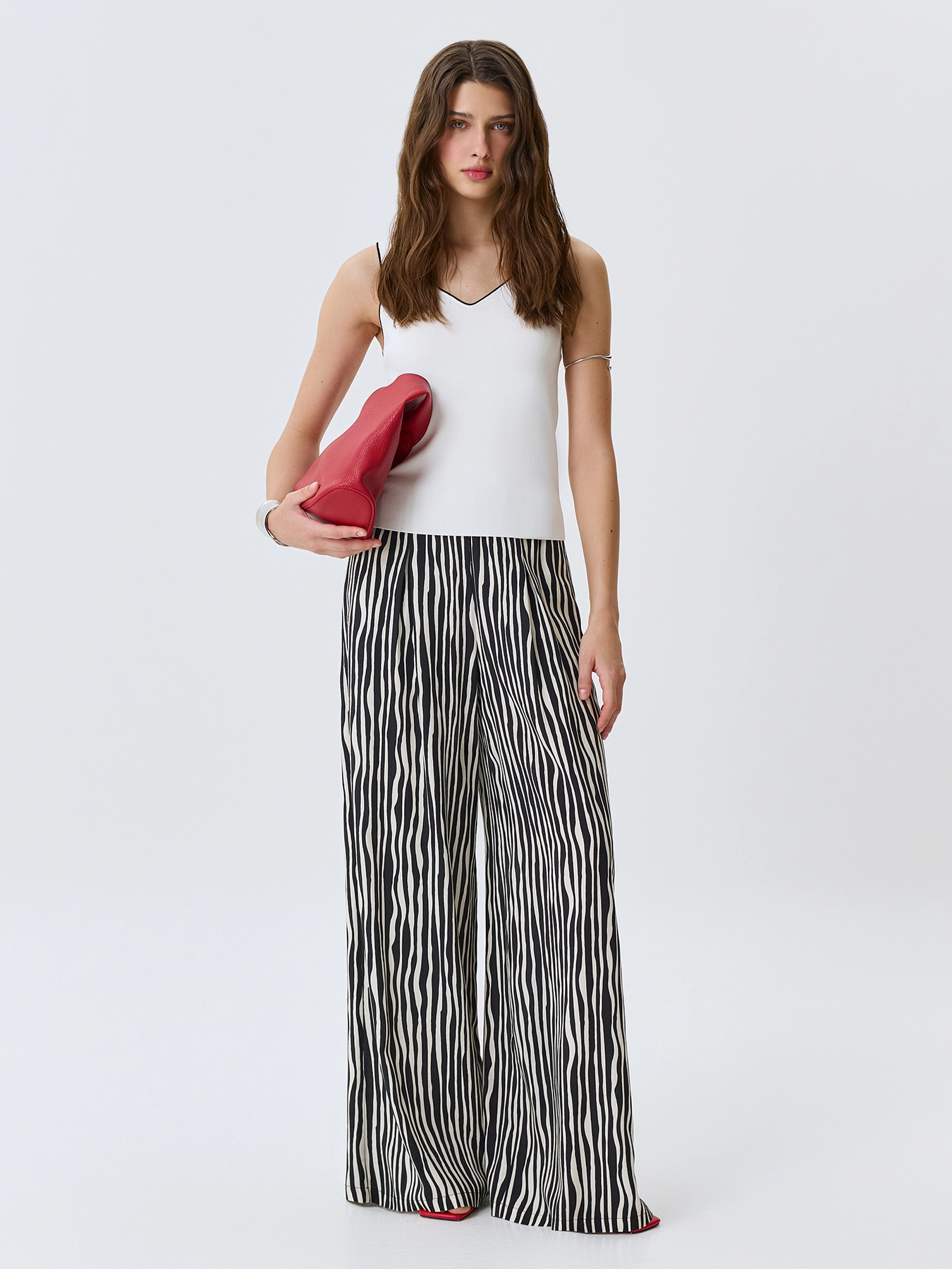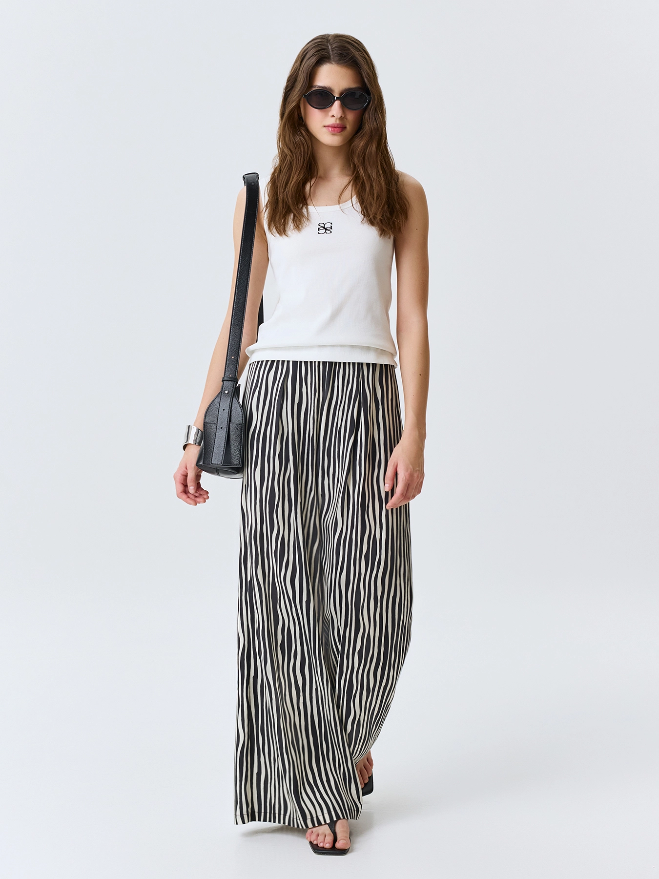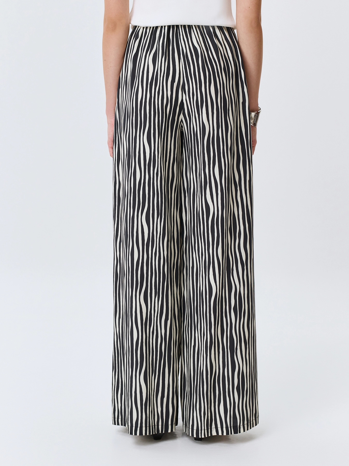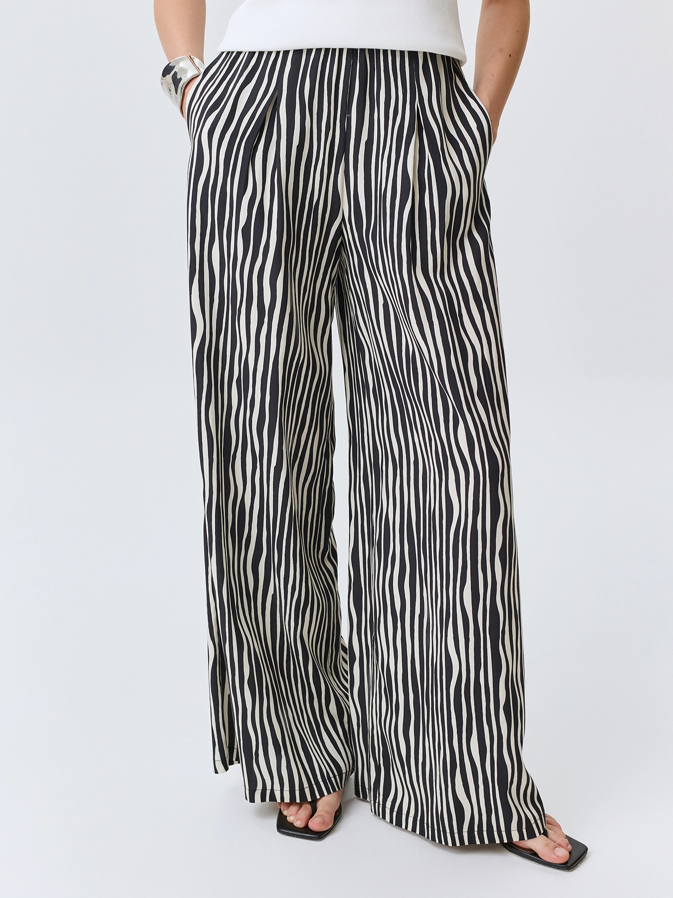 Брюки в тонкую монохромную полоску. Свободный силуэт. Резинка по линии талии. Боковые карманы в швах. В составе район и тенсель.