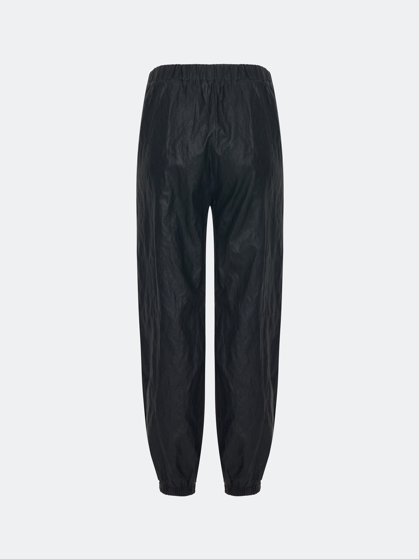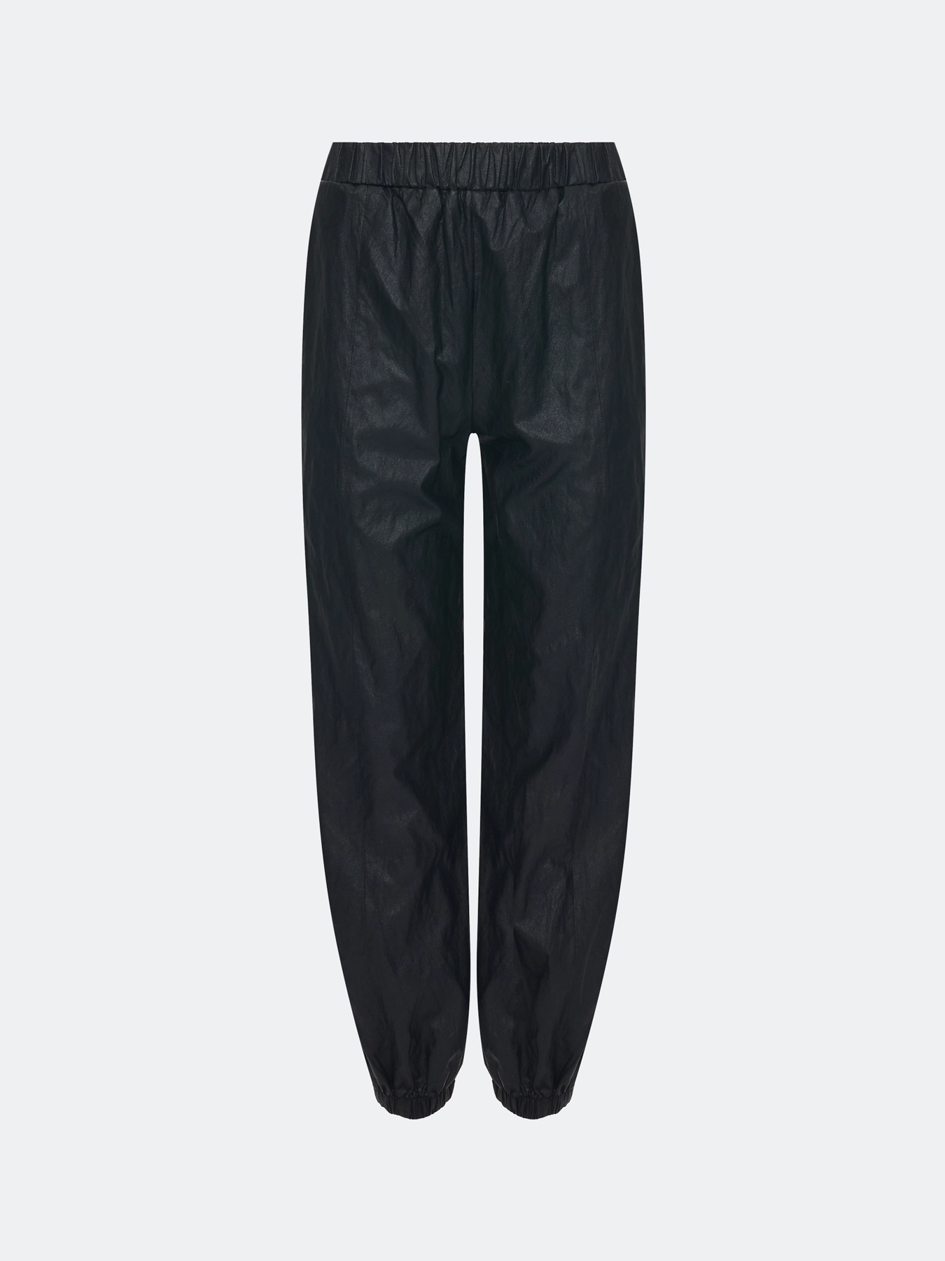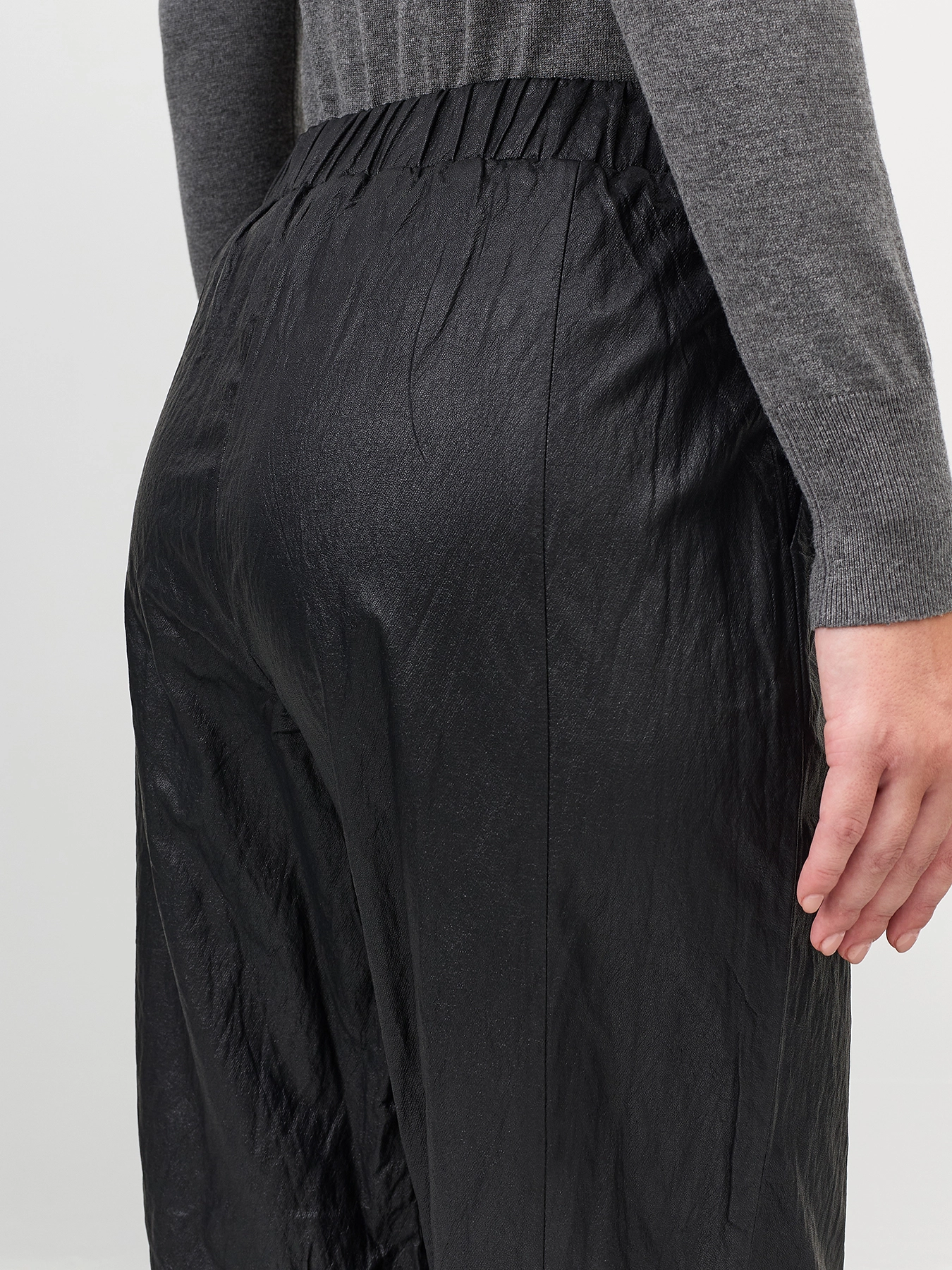 Брюки джоггеры из фактурной вискозы с накатом и крэш эффектом. Прямой силуэт заужен резинками по низу. Резинка по линии талии. Боковые карманы в швах.