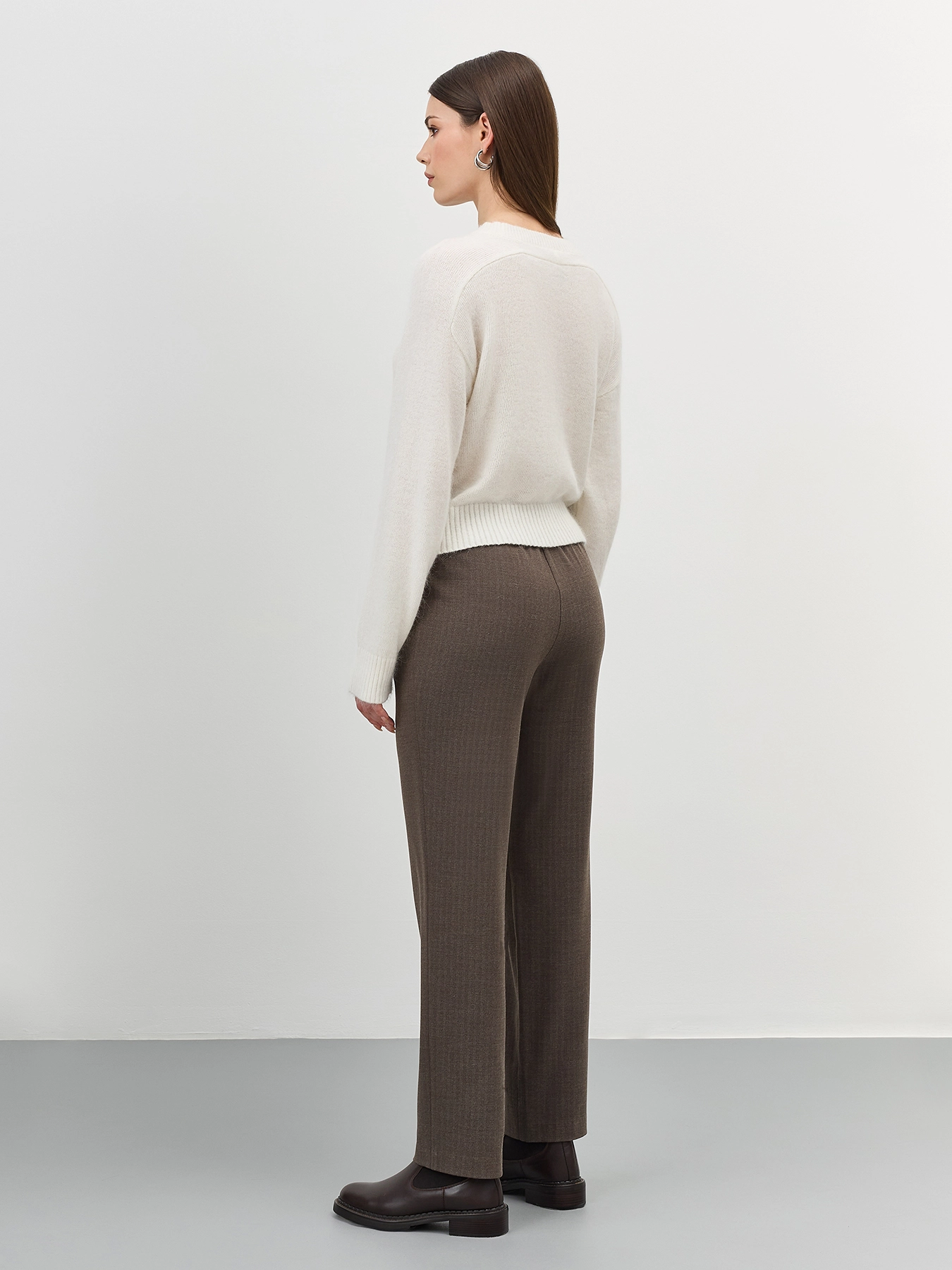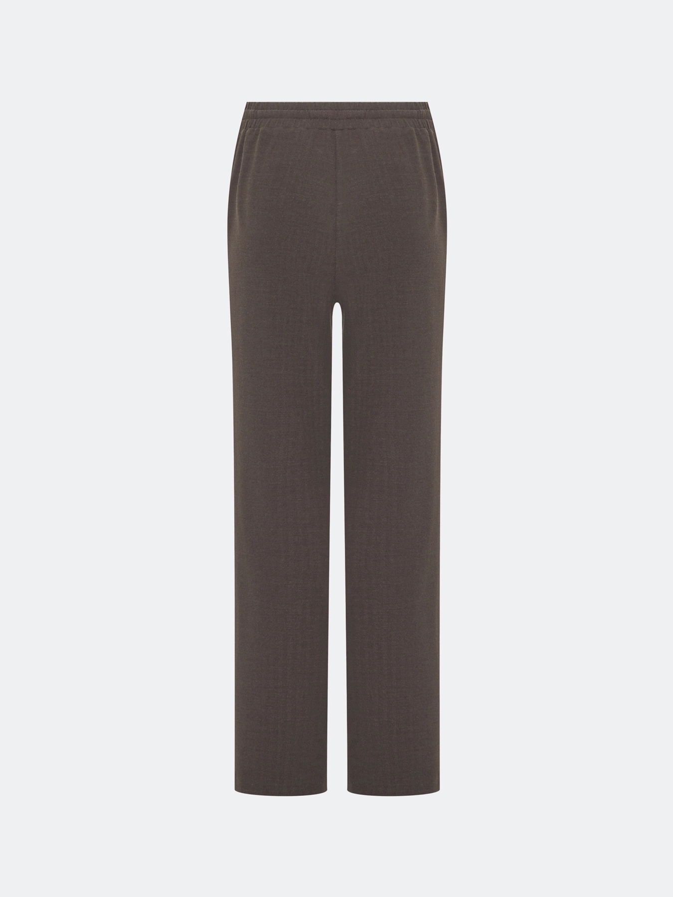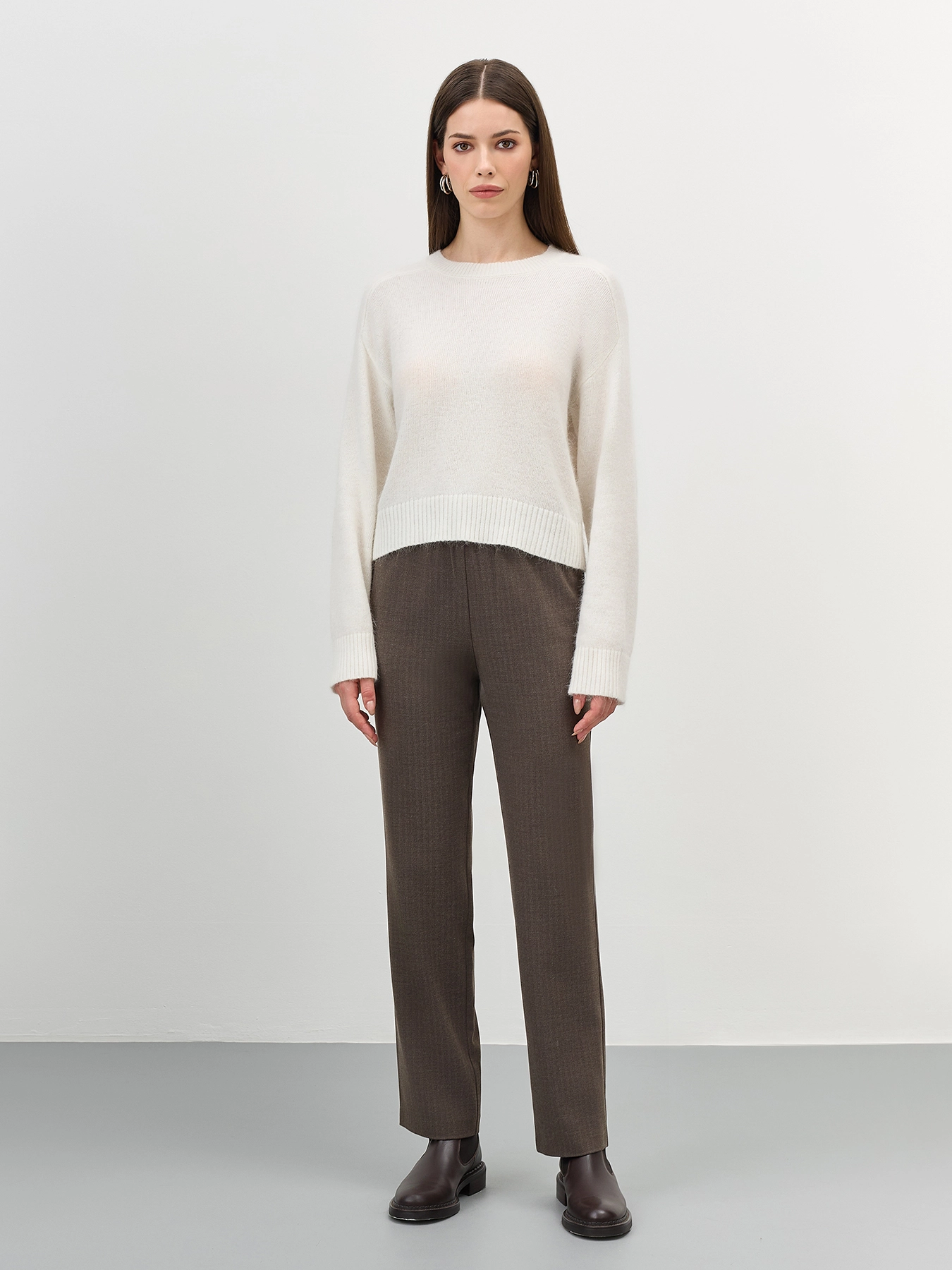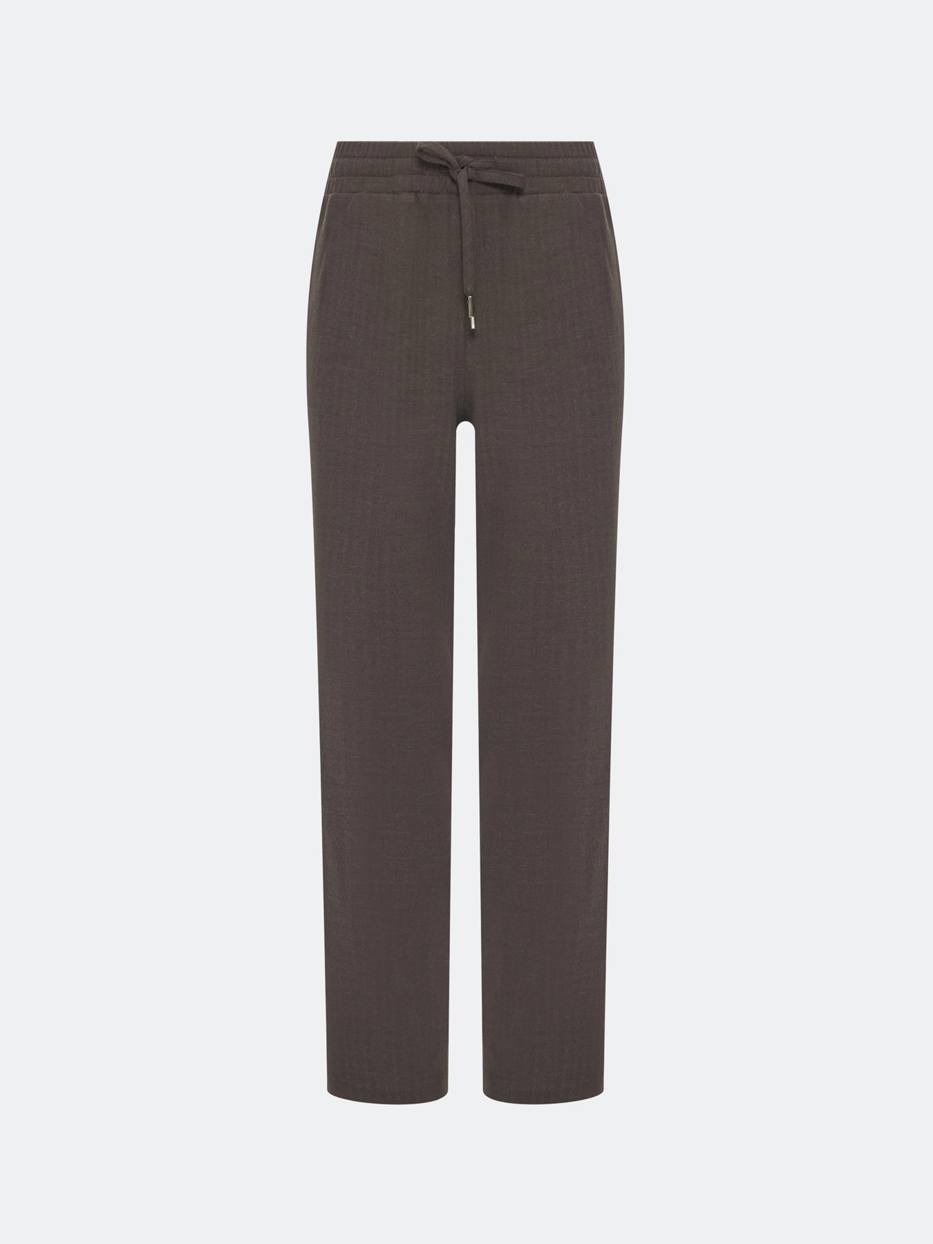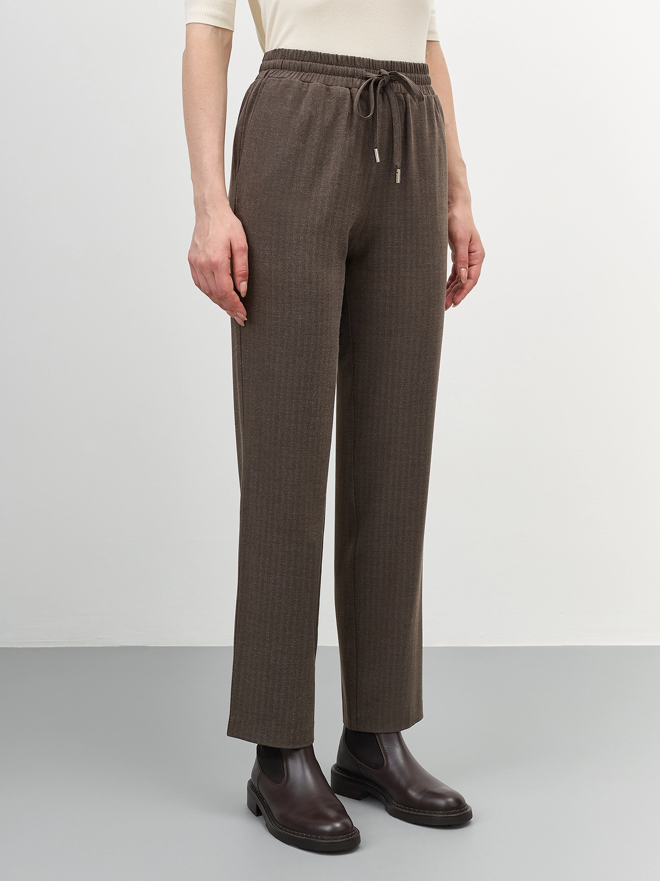 Фактурные свободные брюки из текстильного твида. Прямой силуэт немного заужен к низу. Боковые карманы в швах. Широкий пояс с резинкой и шнурком. В составе вискоза.
