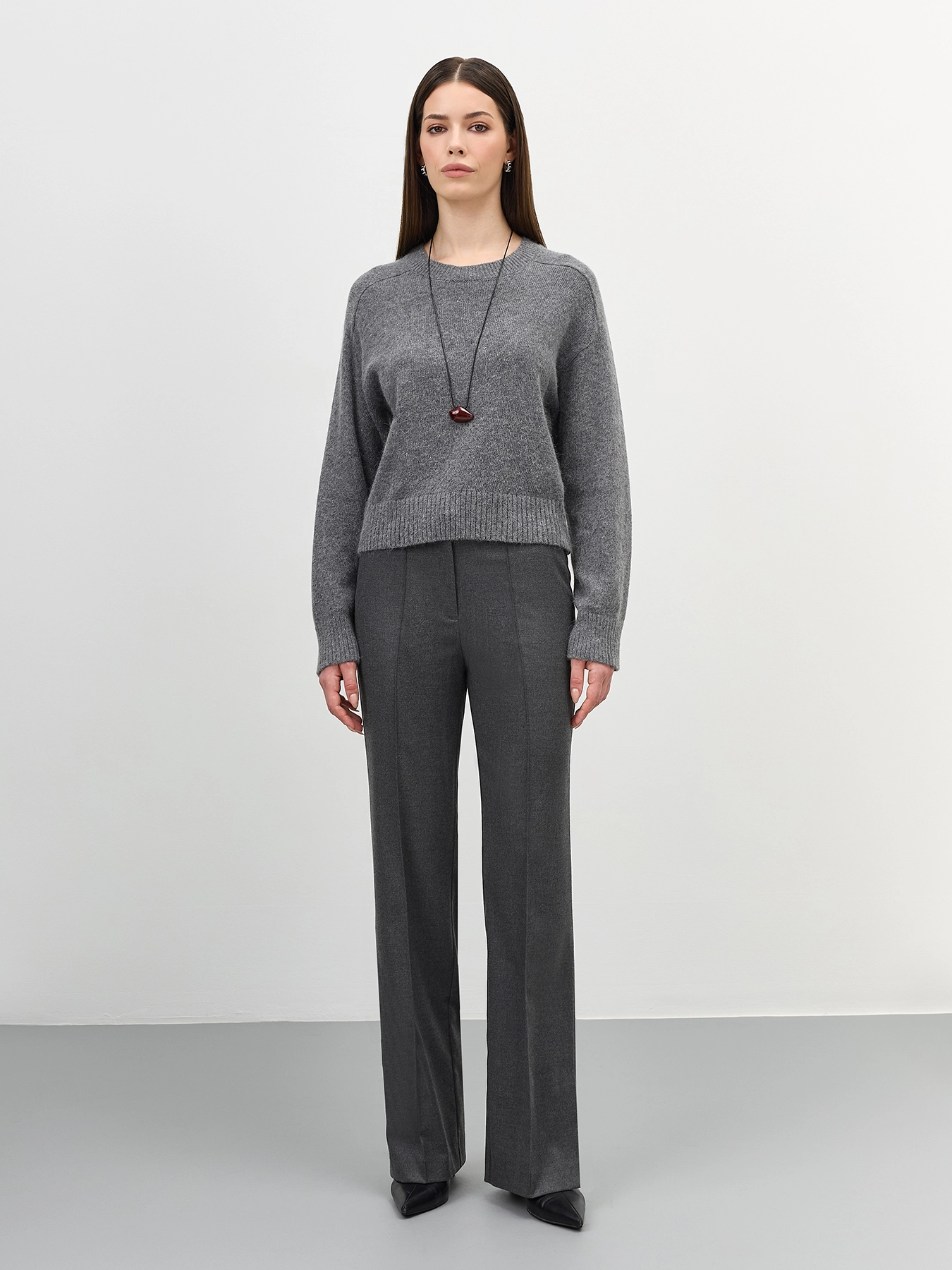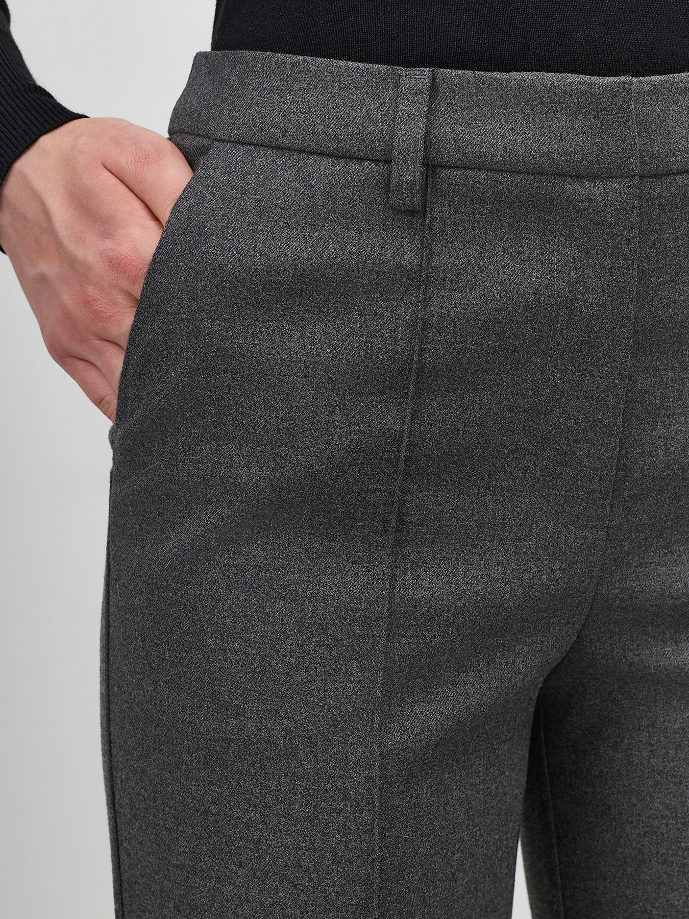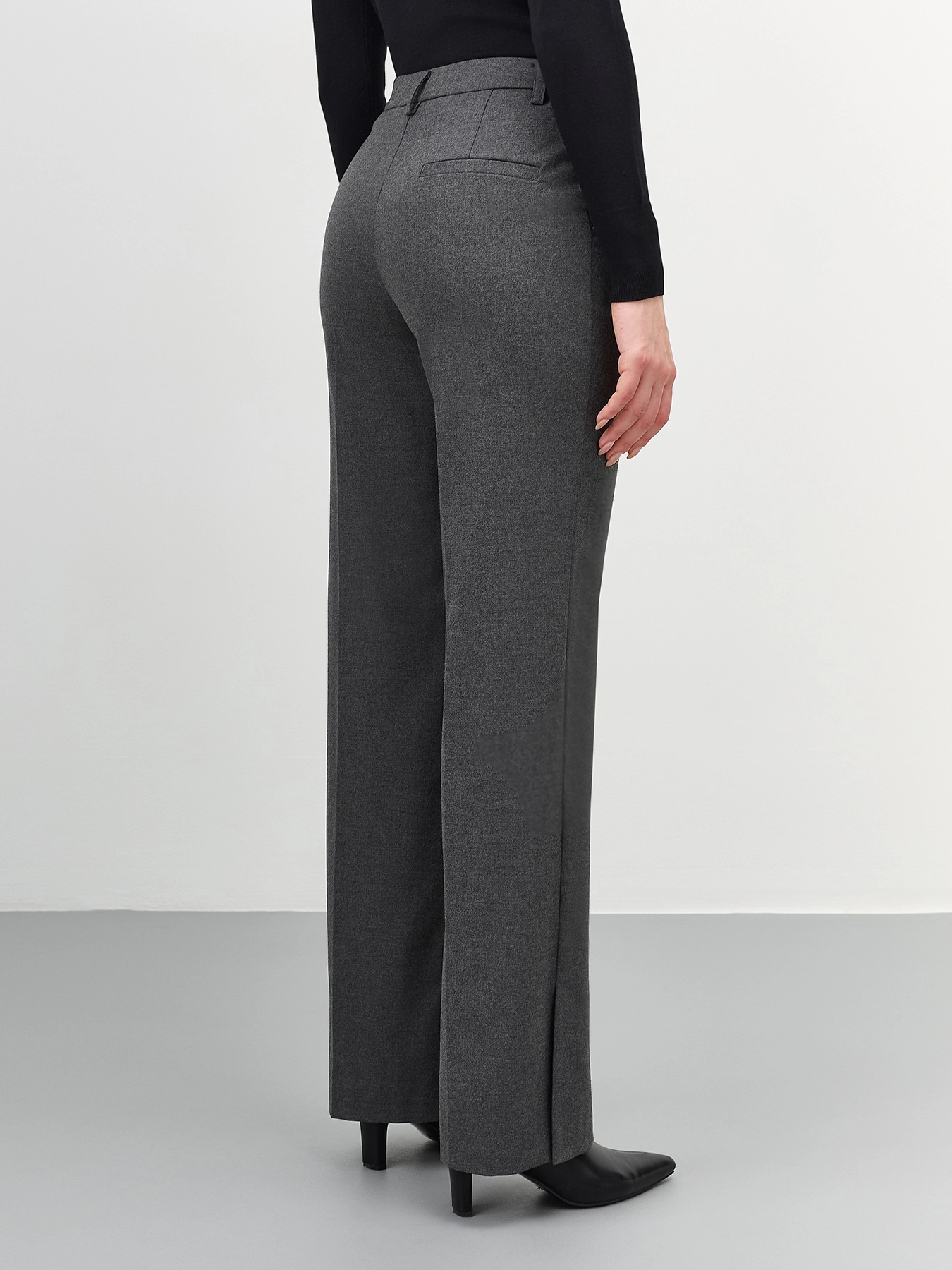 Меланжевые брюки со стрелками. Прямой силуэт расширен к низу. Застежка на молнию и крючок. Боковые карманы в швах. Дополнены разрезами-шлицами по низу. В составе вискоза.