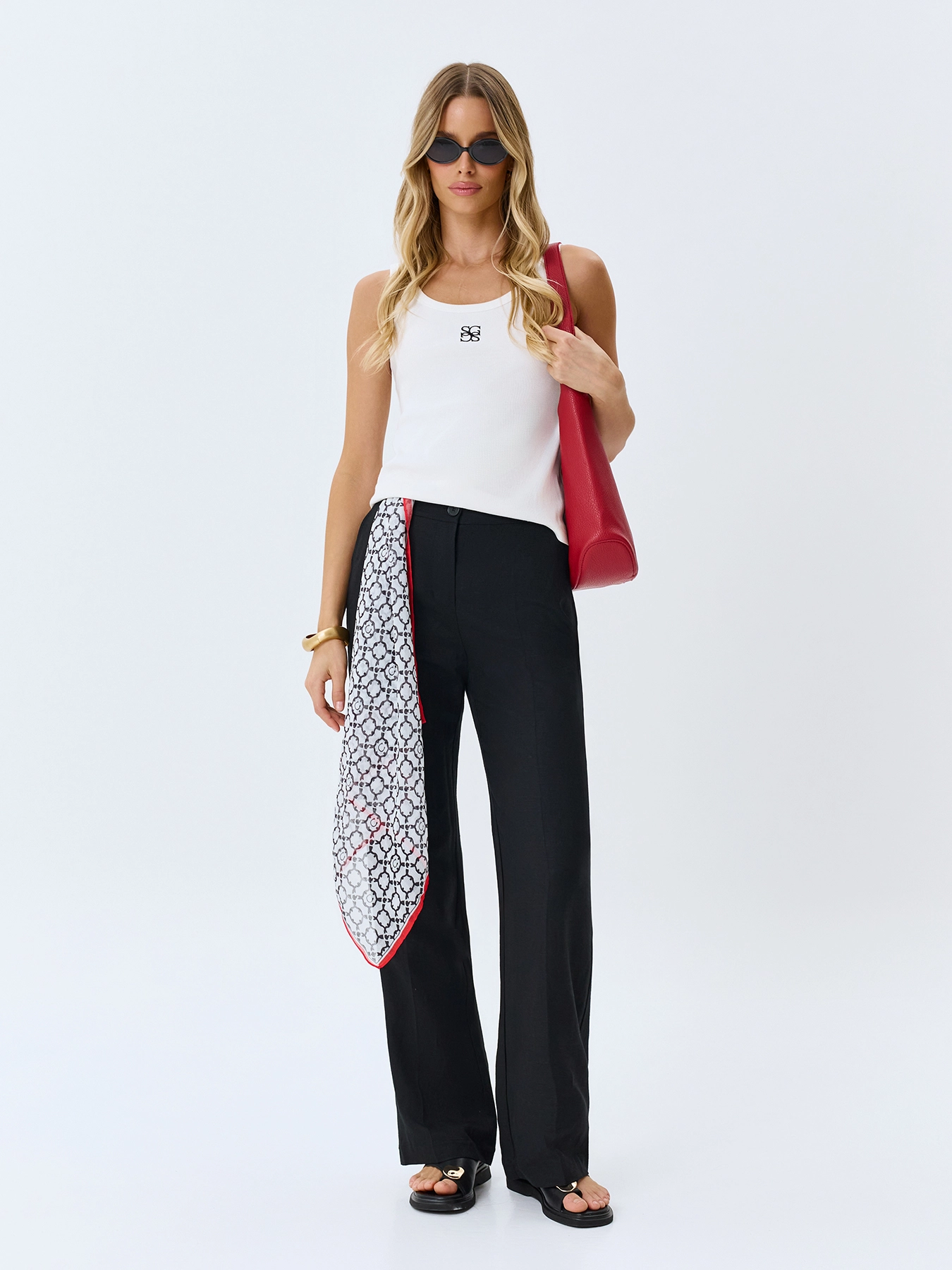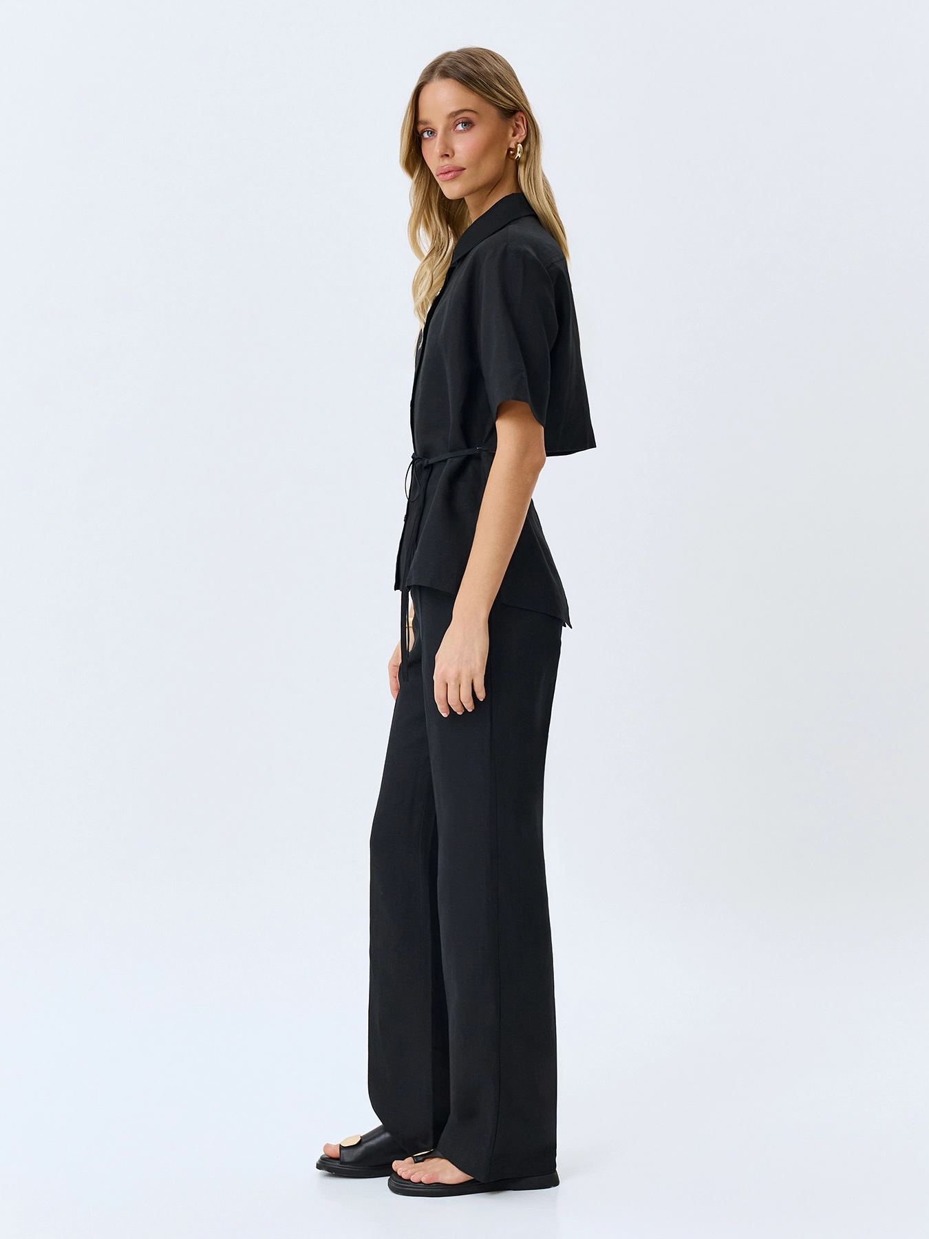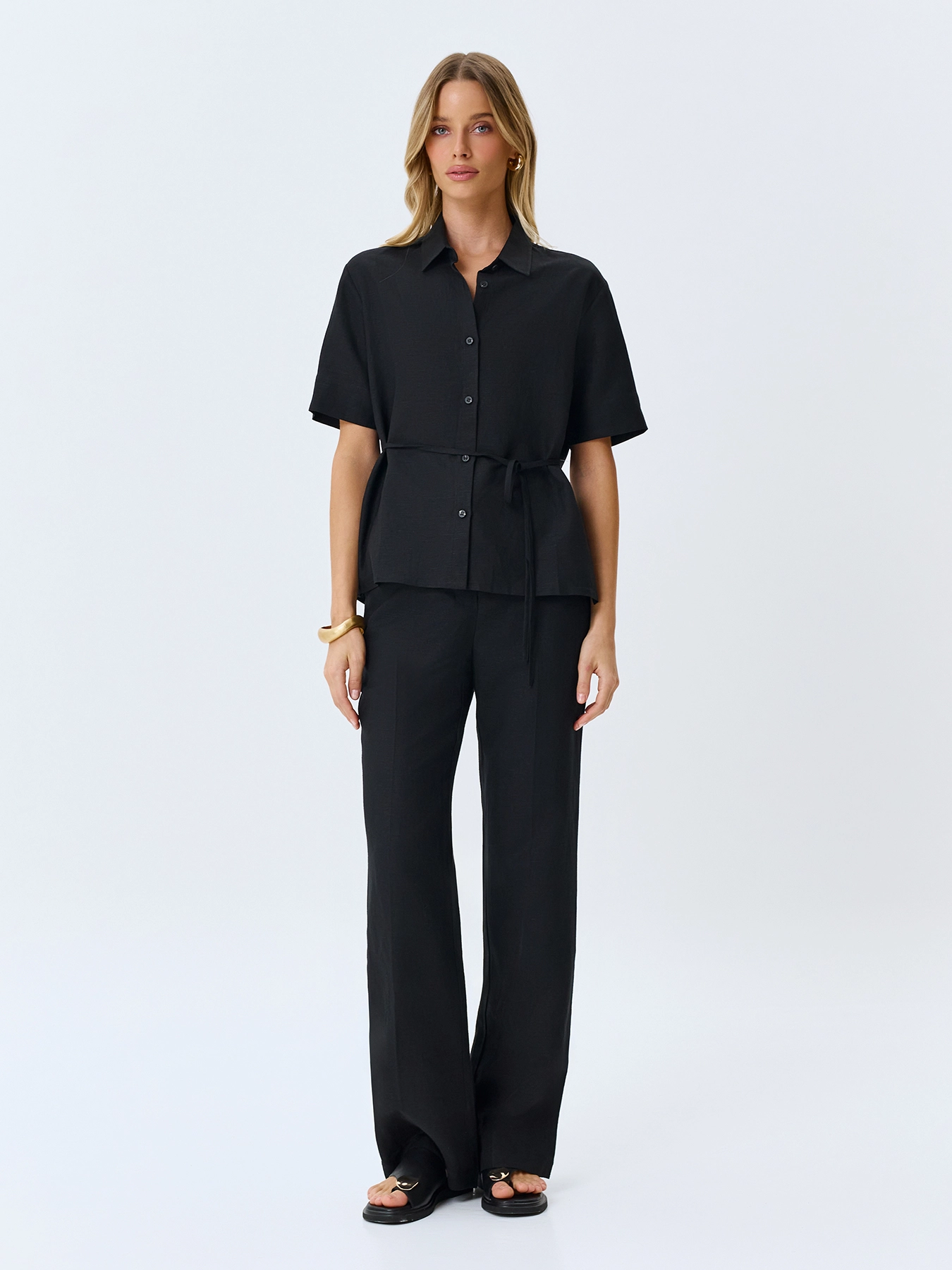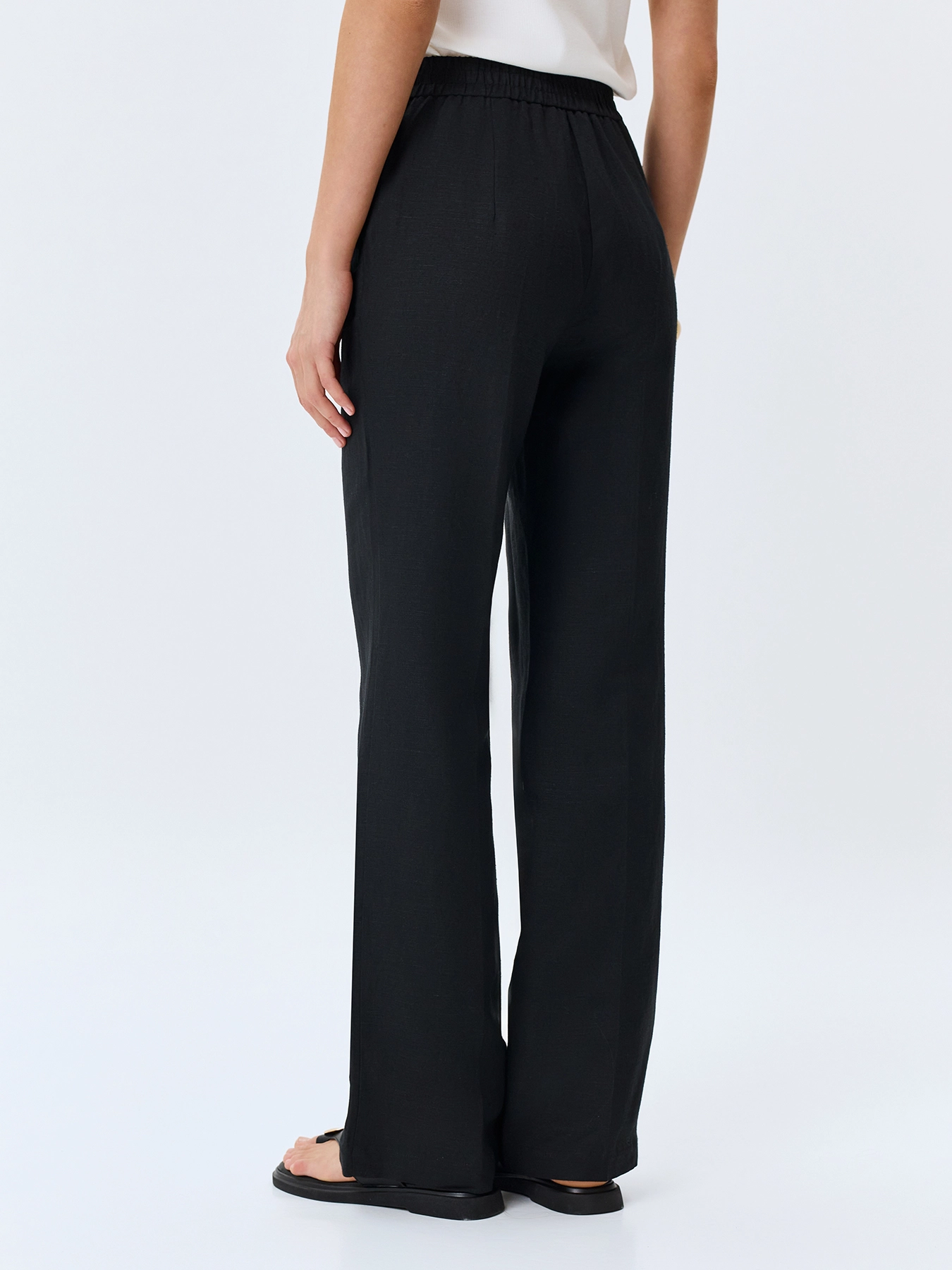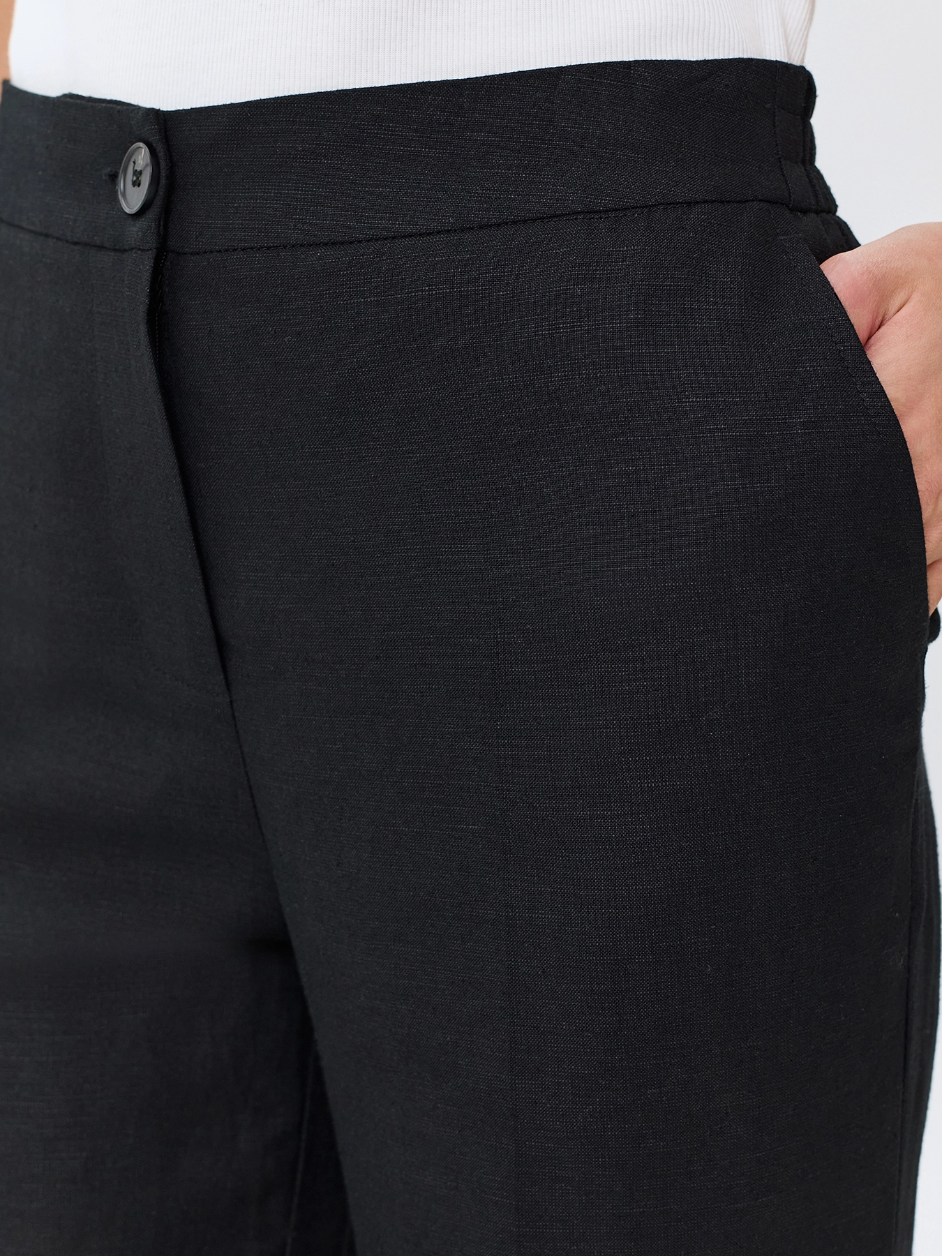 Брюки из смесового льна и вискозы. Прямой силуэт. Застежка на молнию и пуговицу. Боковые карманы в швах. Дополнены мягкими стрелками. Комплект с 63359.