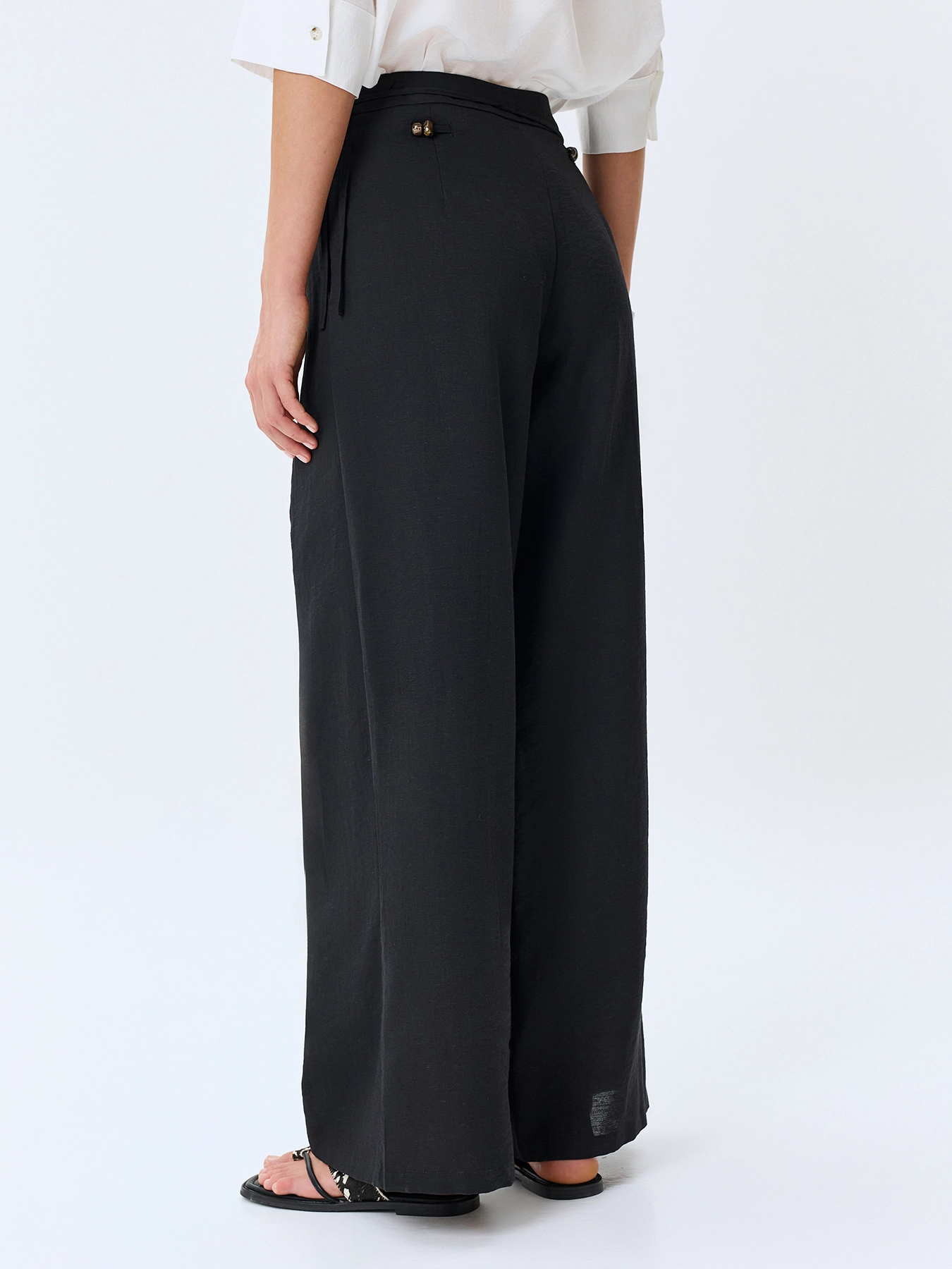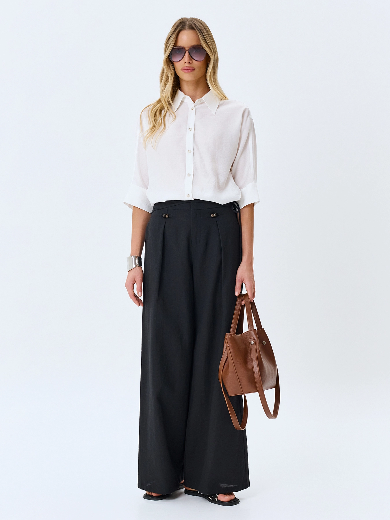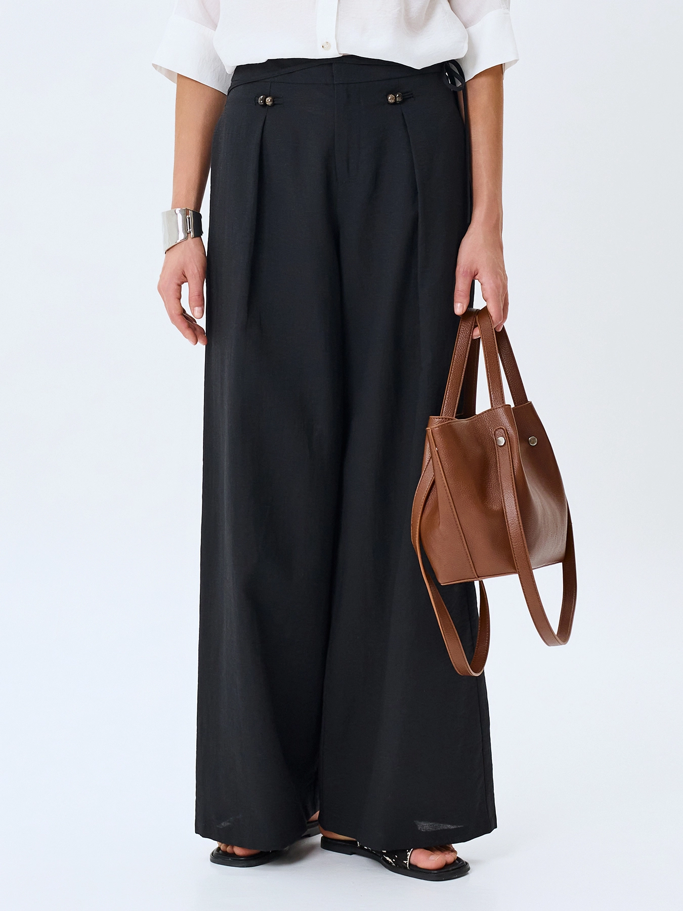 Широкие брюки из смесового района и льна. Свободный силуэт. Дополнены поясом с декоративными бусинами и мягкими складками по линии талии. Боковые карманы в швах. Застежка на молнию. Комплект с 63379.