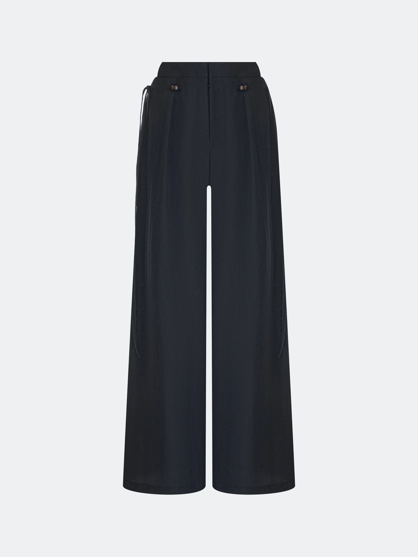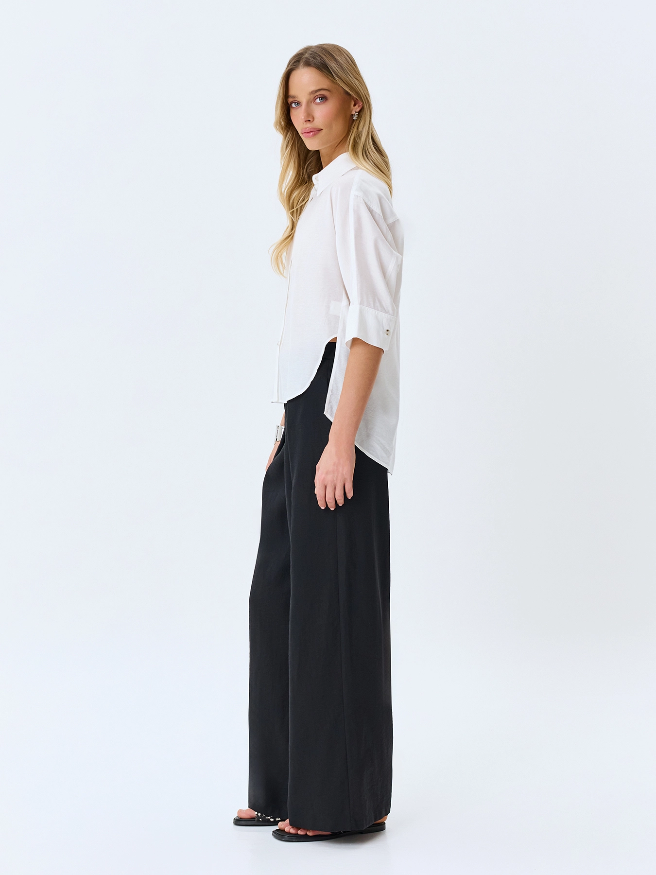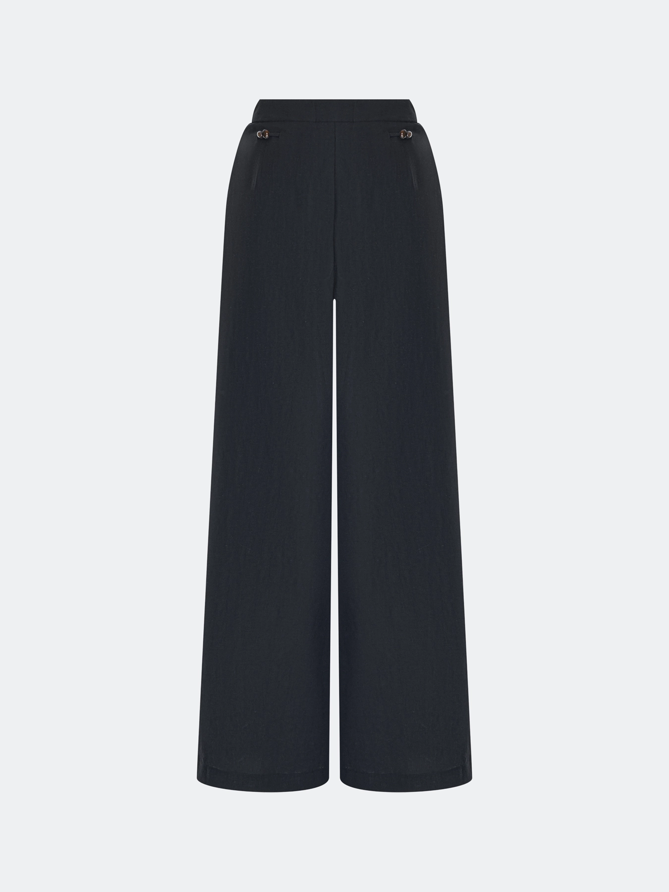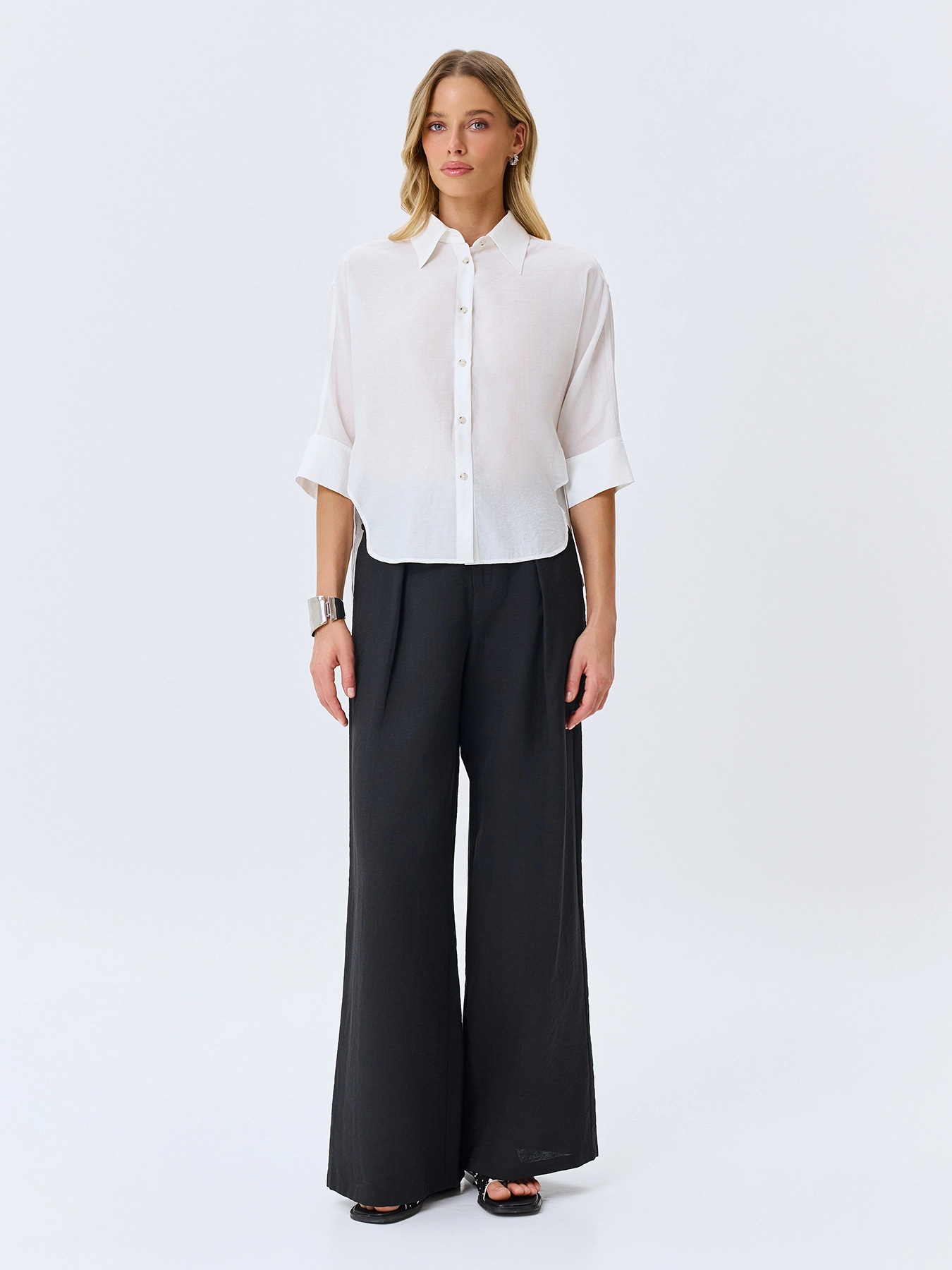 Широкие брюки из смесового района и льна. Свободный силуэт. Дополнены поясом с декоративными бусинами и мягкими складками по линии талии. Боковые карманы в швах. Застежка на молнию. Комплект с 63379.