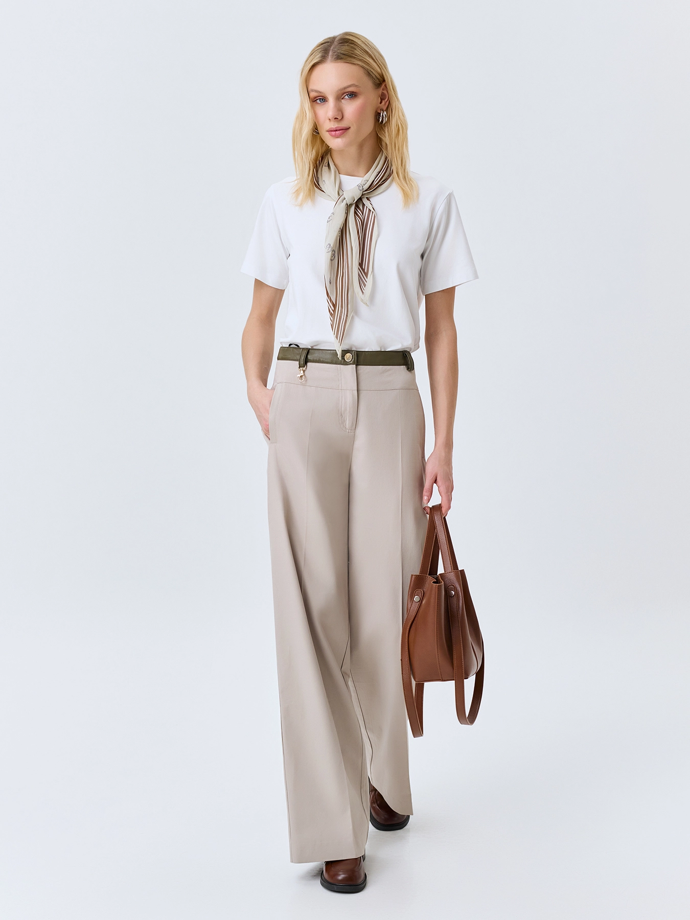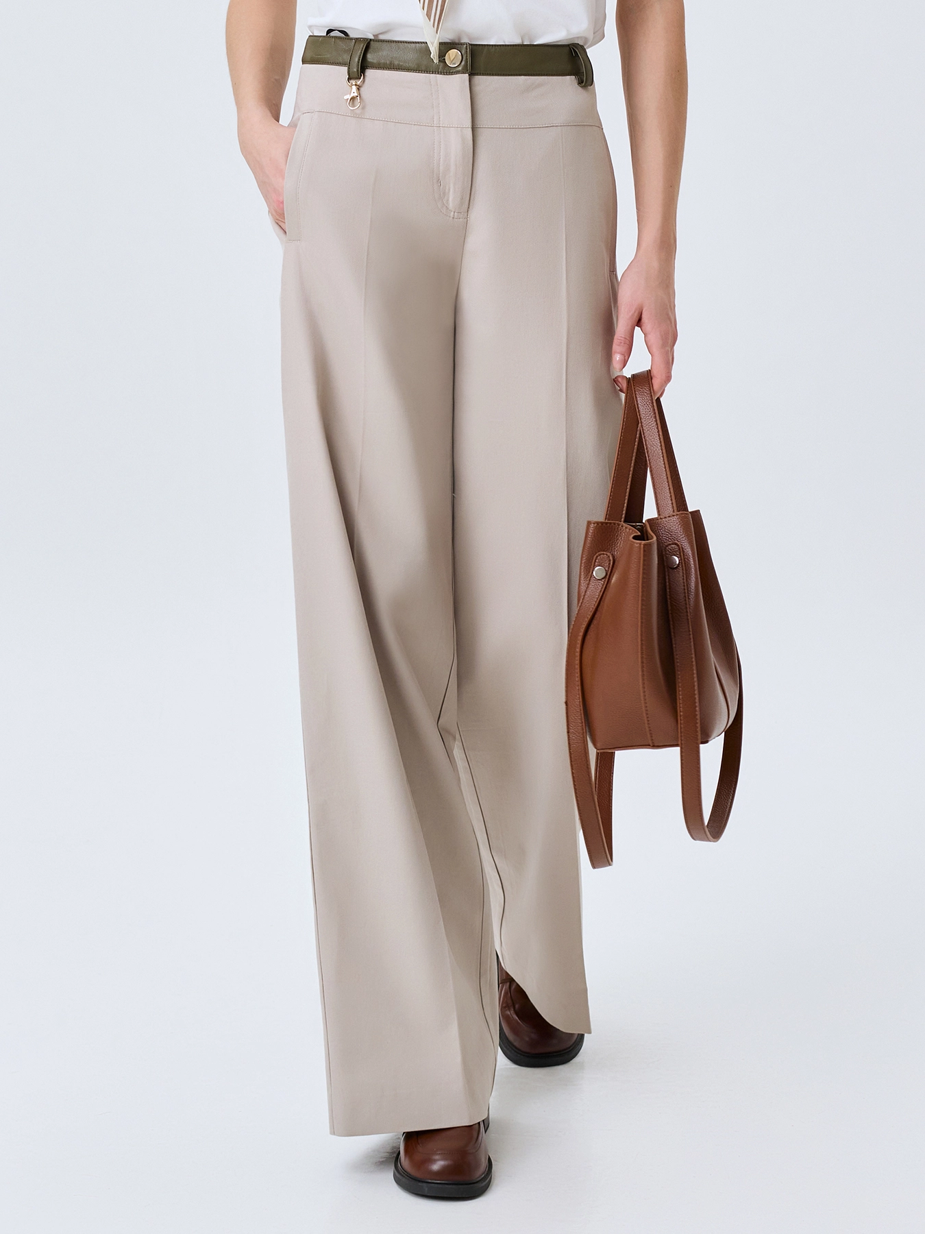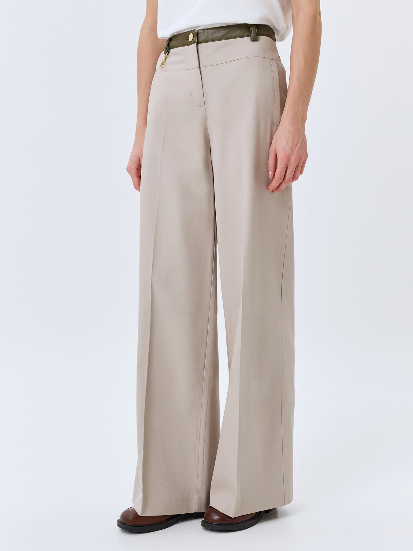 Широкие романтичные брюки с мягкими стрелками. Свободный силуэт. Боковые карманы в швах. Контрастный пояс из эко кожи с металлическим декором. Застежка на молнию и пуговицу. В составе вискоза и хлопок.