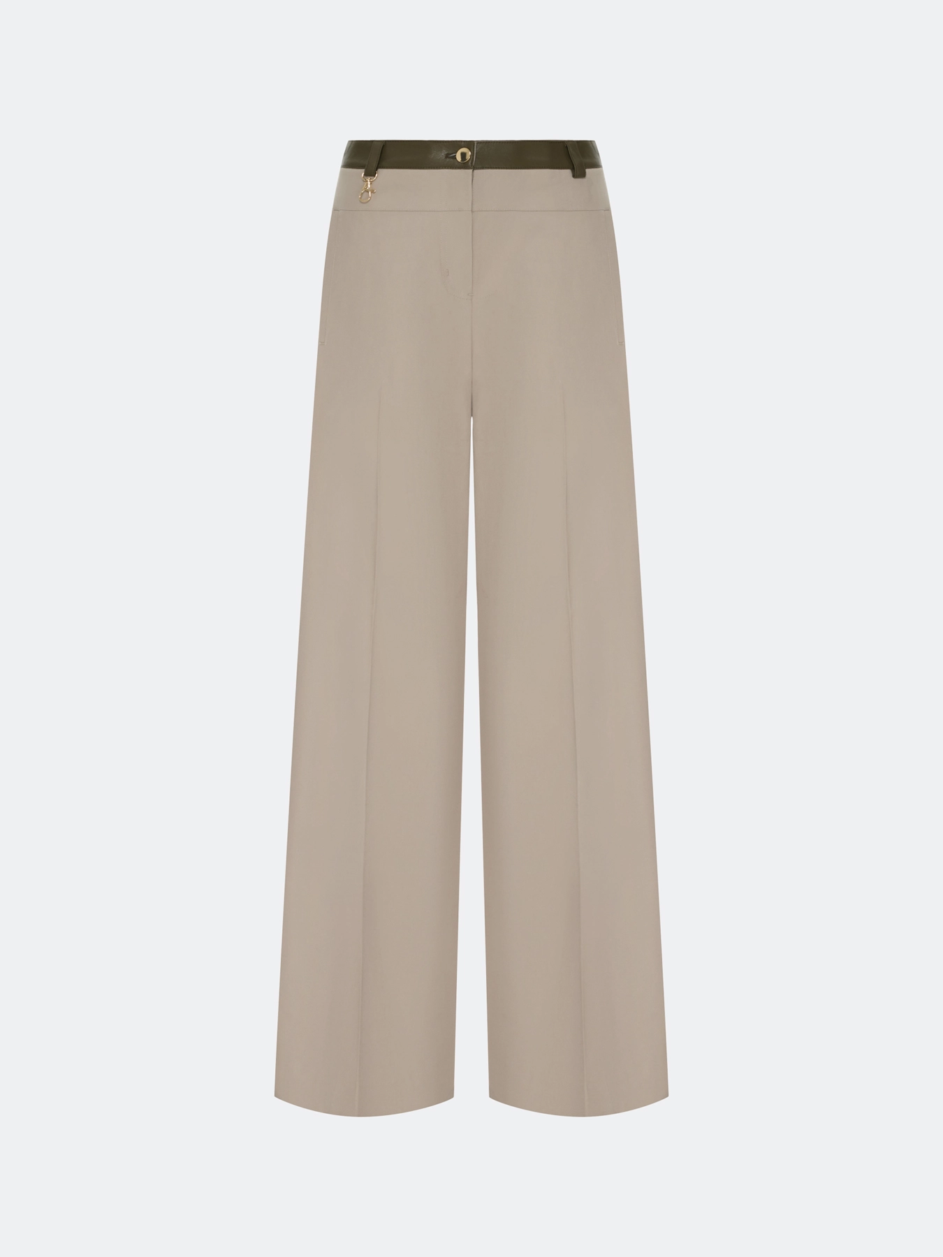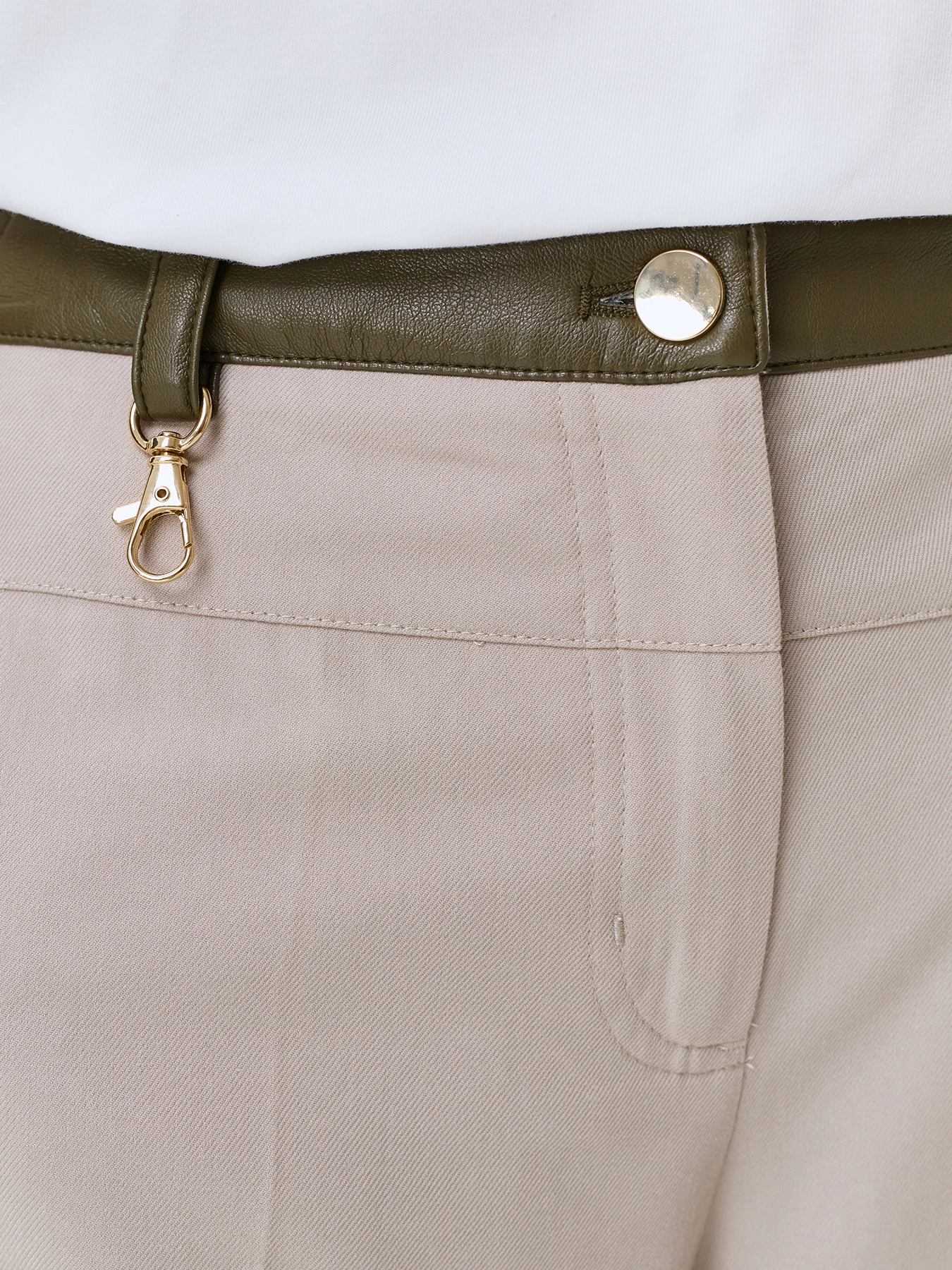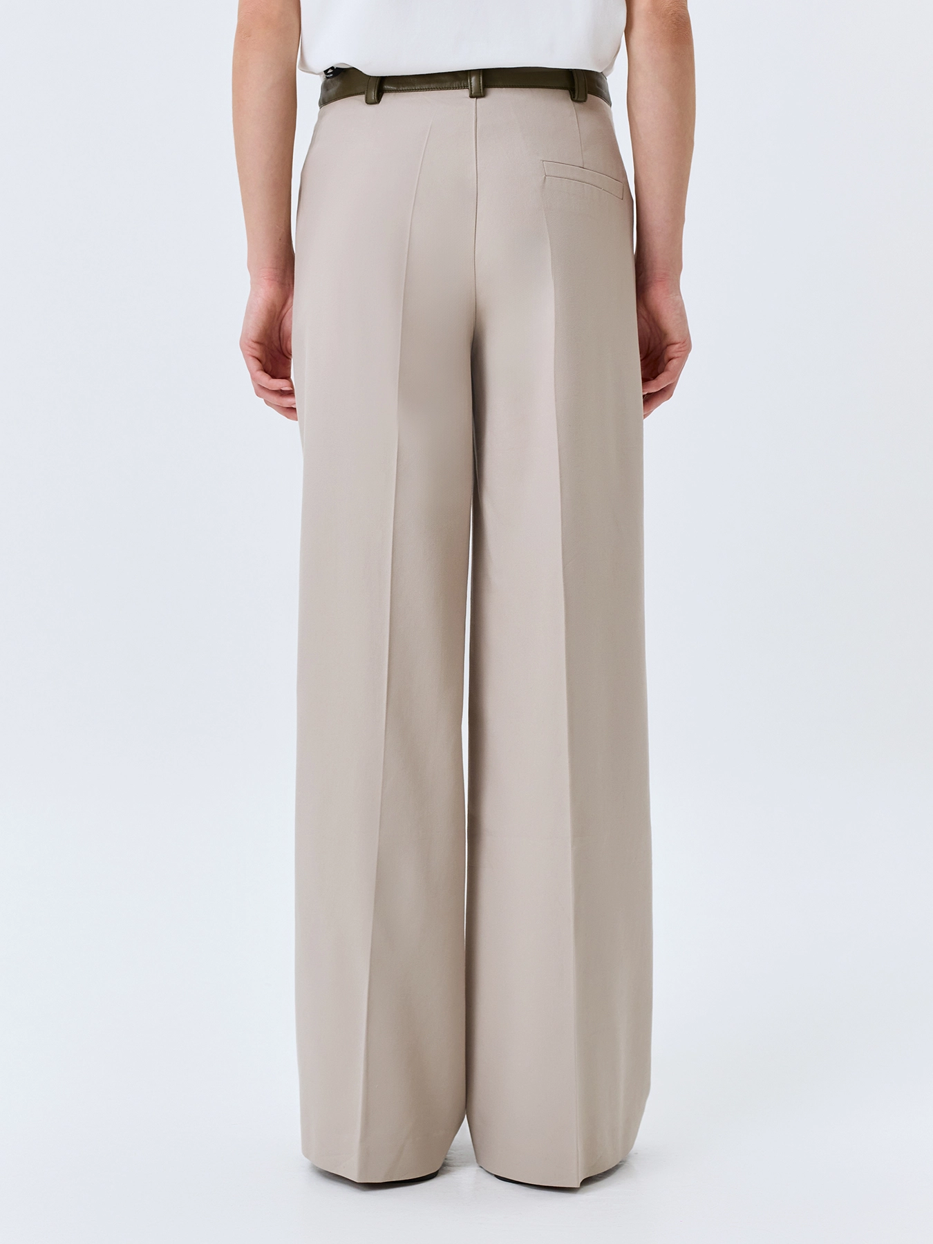 Широкие романтичные брюки с мягкими стрелками. Свободный силуэт. Боковые карманы в швах. Контрастный пояс из эко кожи с металлическим декором. Застежка на молнию и пуговицу. В составе вискоза и хлопок.