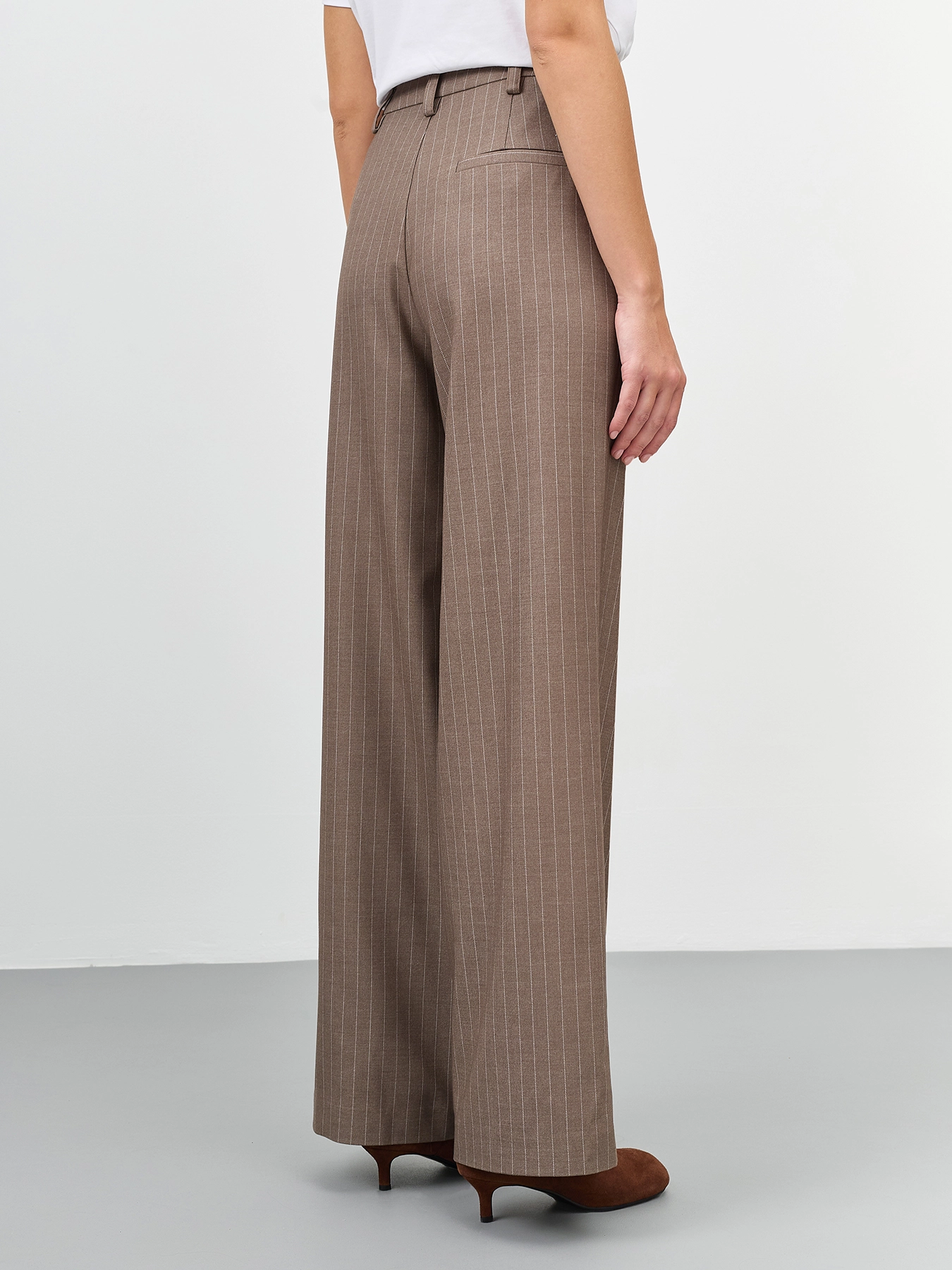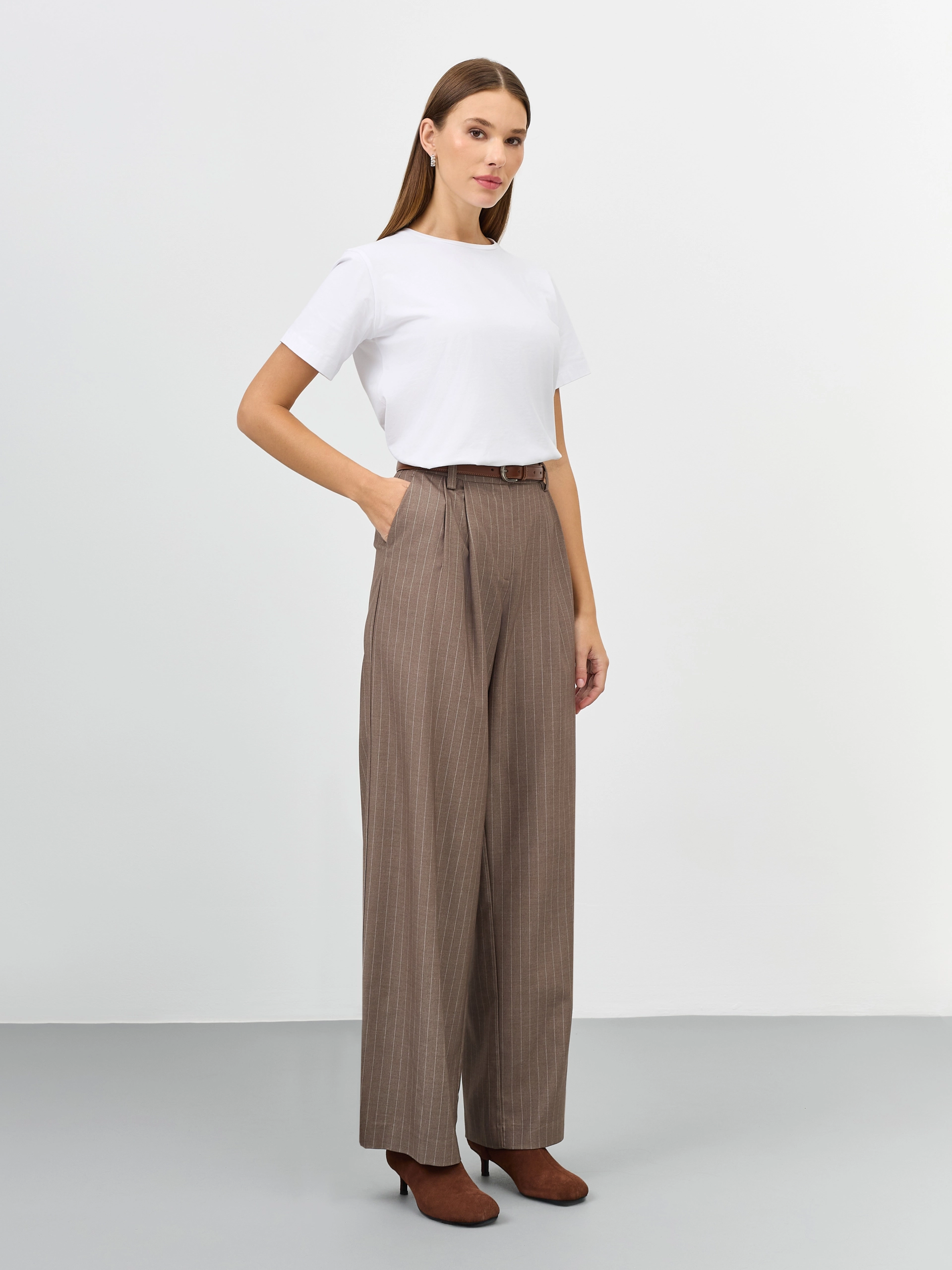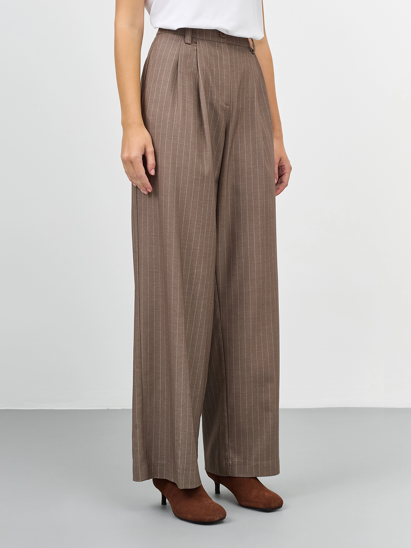 Широкие брюки палаццо в тонкую полоску, с мягкими защипами-складками. Свободный силуэт. Застежка на молнию и пуовицу. Боковые карманы в швах. В составе вискоза.