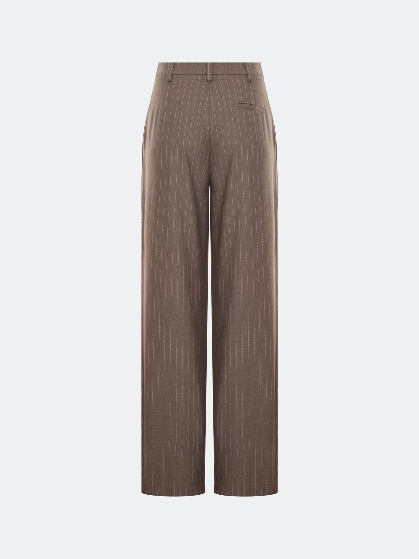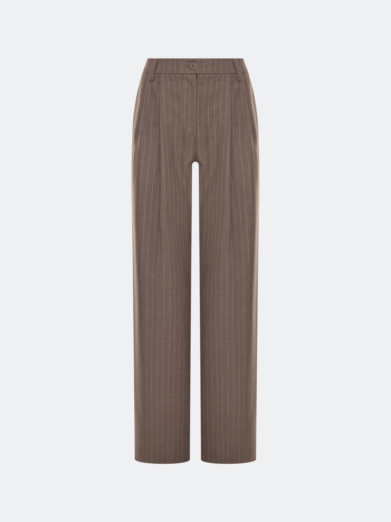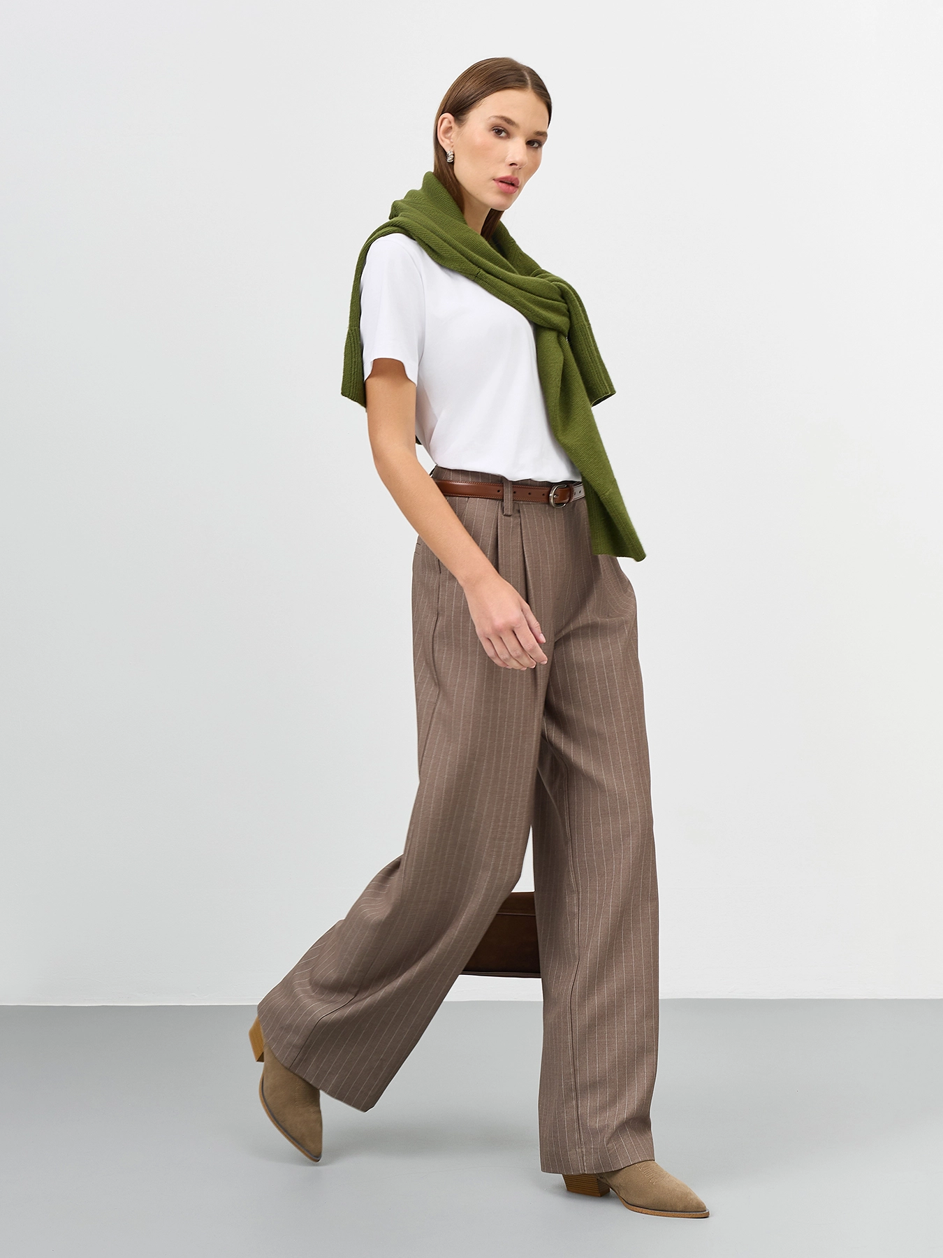 Широкие брюки палаццо в тонкую полоску, с мягкими защипами-складками. Свободный силуэт. Застежка на молнию и пуовицу. Боковые карманы в швах. В составе вискоза.