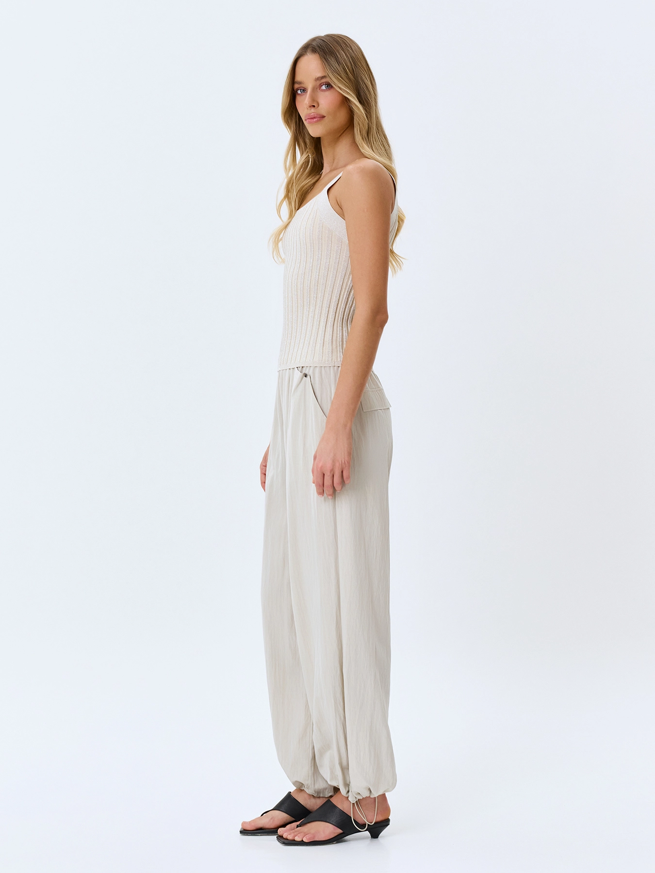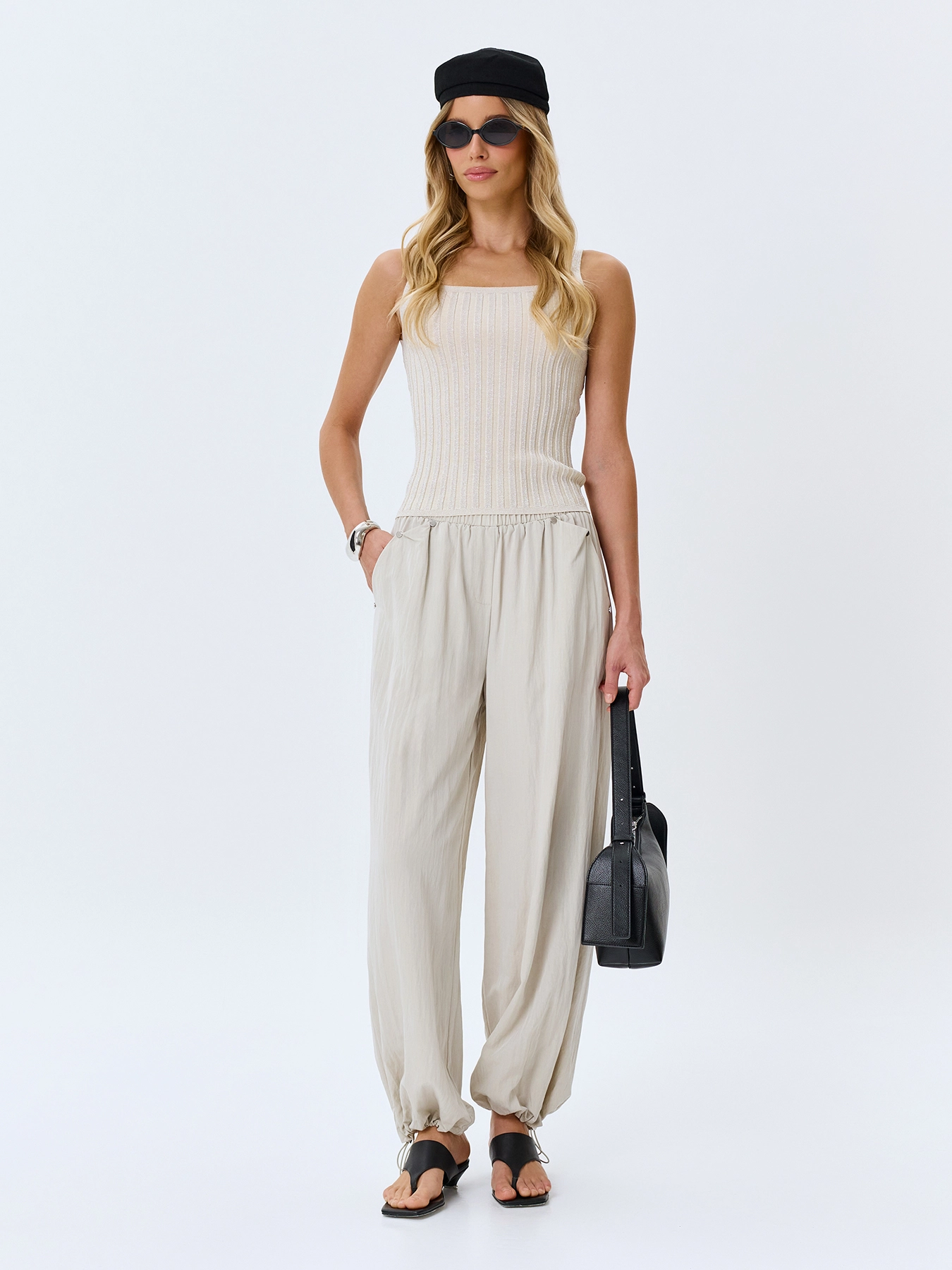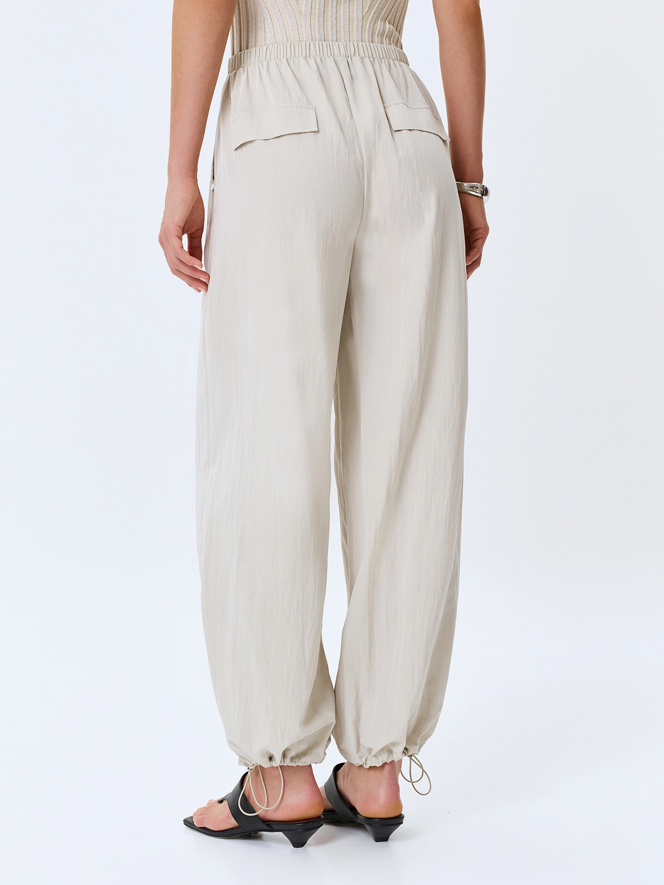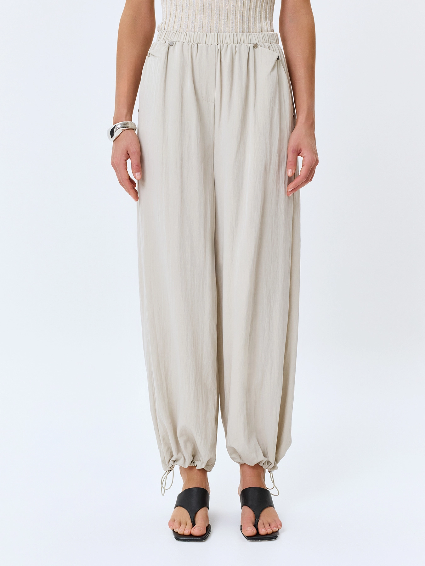 Свободные брюки из смесовой вискозы. Прямой силуэт можно изменить с помощью утяжников по низу. Резинка по линии талии. Боковые карманы в швах. Задние карманы с клапанами. В составе вискоза и нейлон.