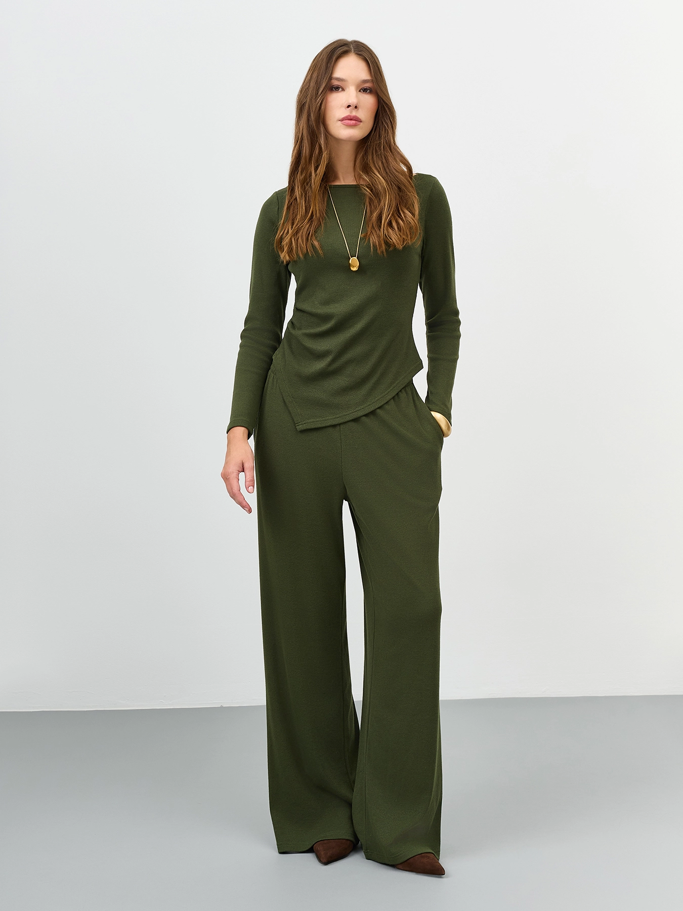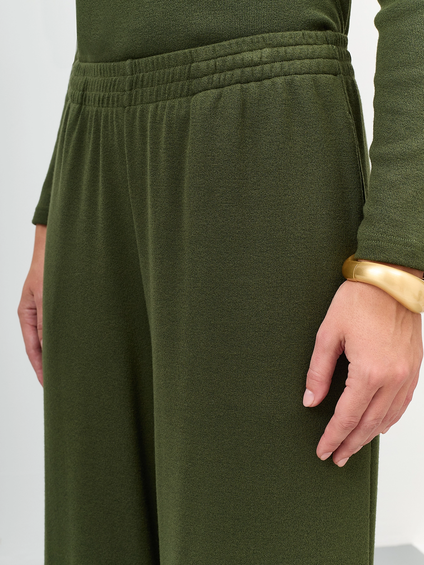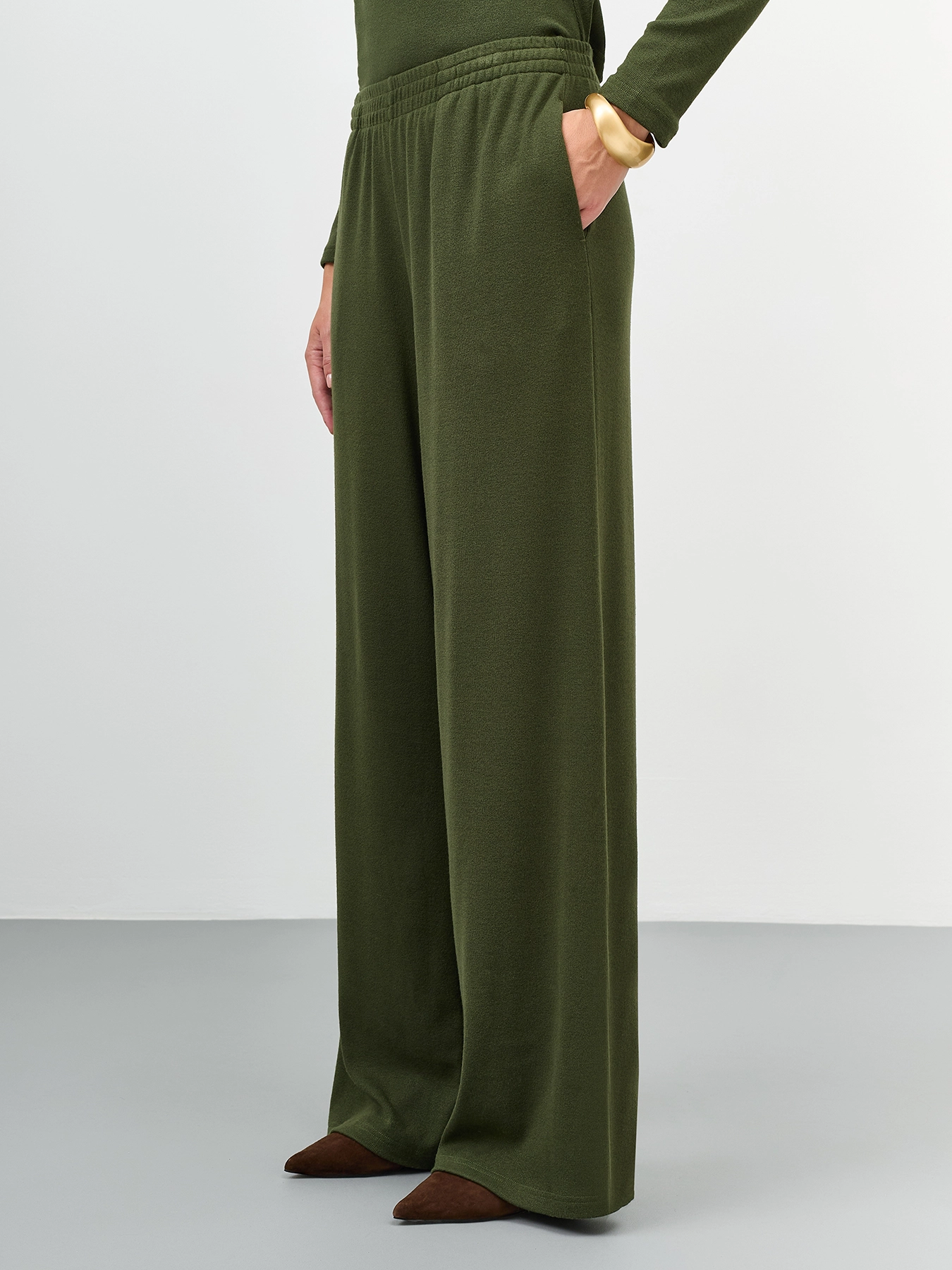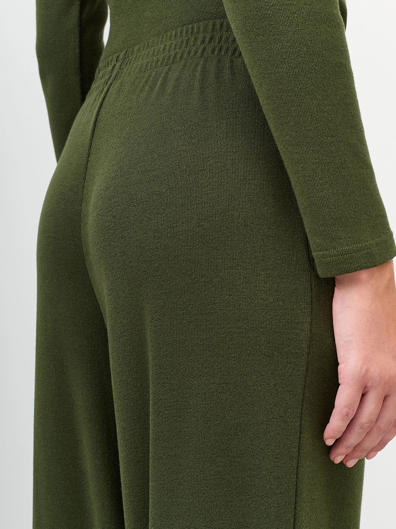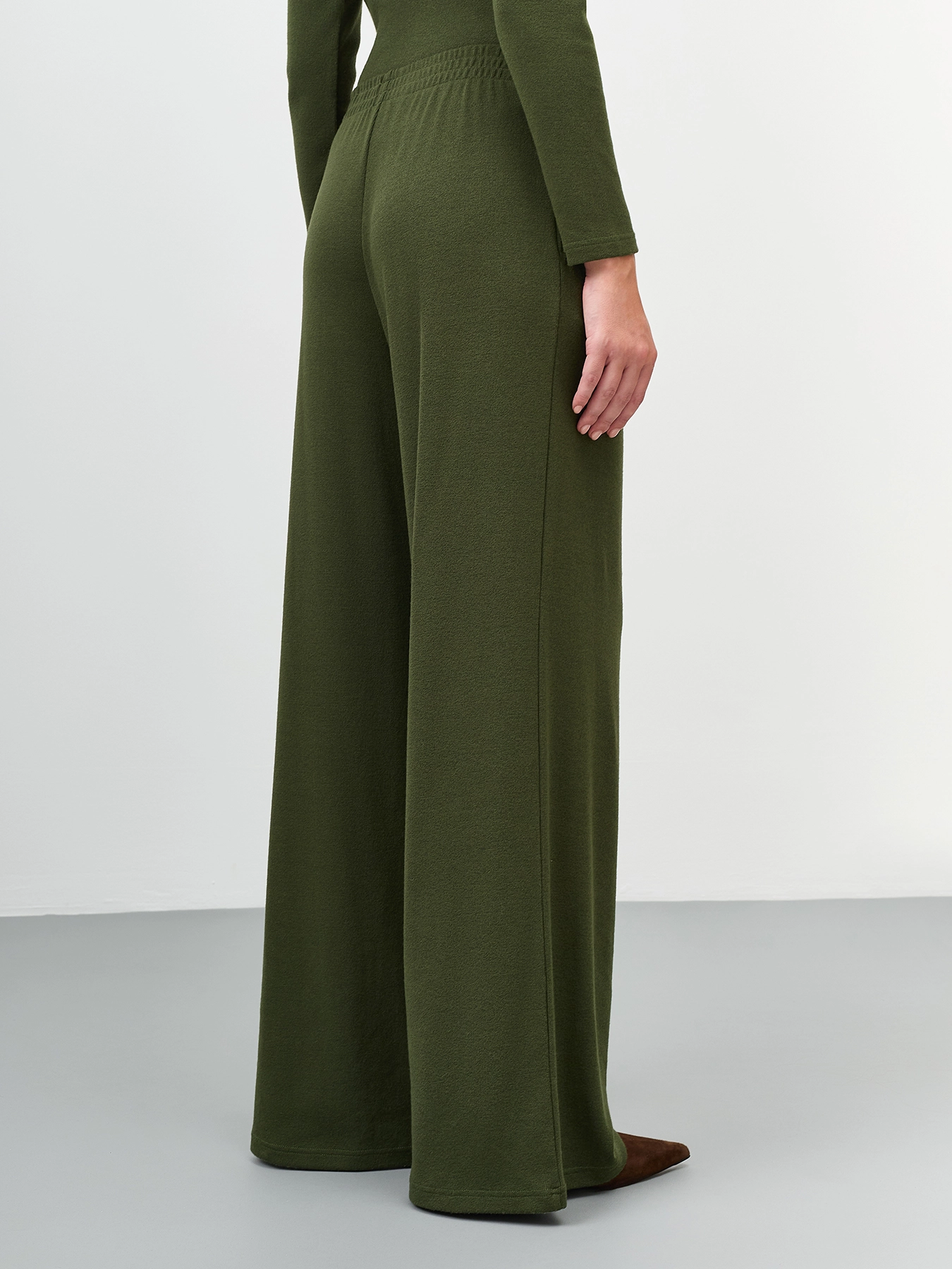 Тонкие трикотажные брюки из смесовой вискозы. Прямой силуэт немного расширен к низу. Резинка по линии талии. Боковые карманы в швах. Комплект с арт. 60855.