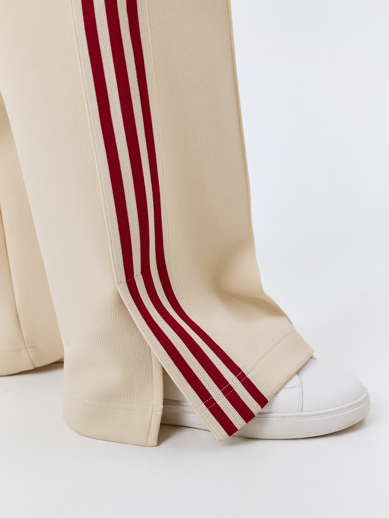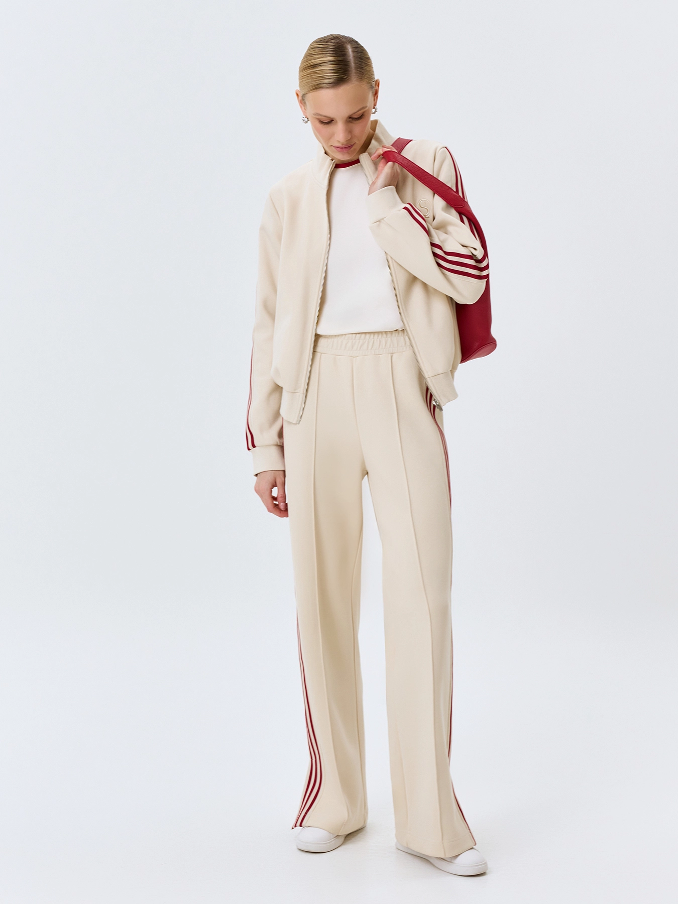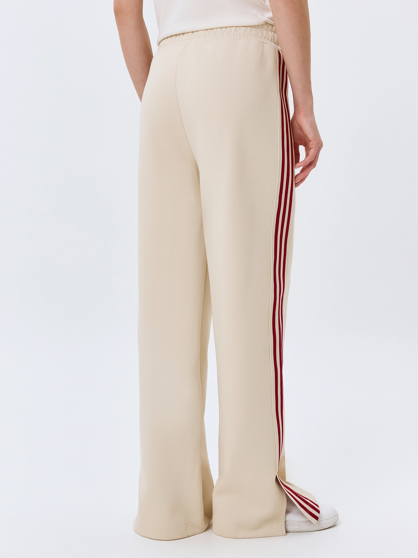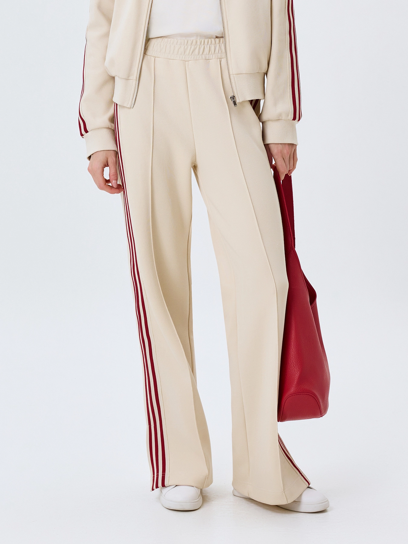 Трикотажные брюки с контрастными лампасами по боковым швам. Прямой силуэт. Дополнены застроченными стрелками. Небольшие разрезы по низу в боковых швах. Комплект с 63817.