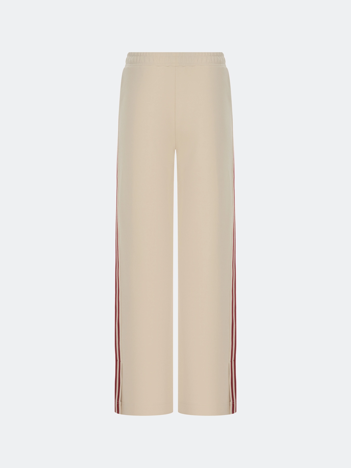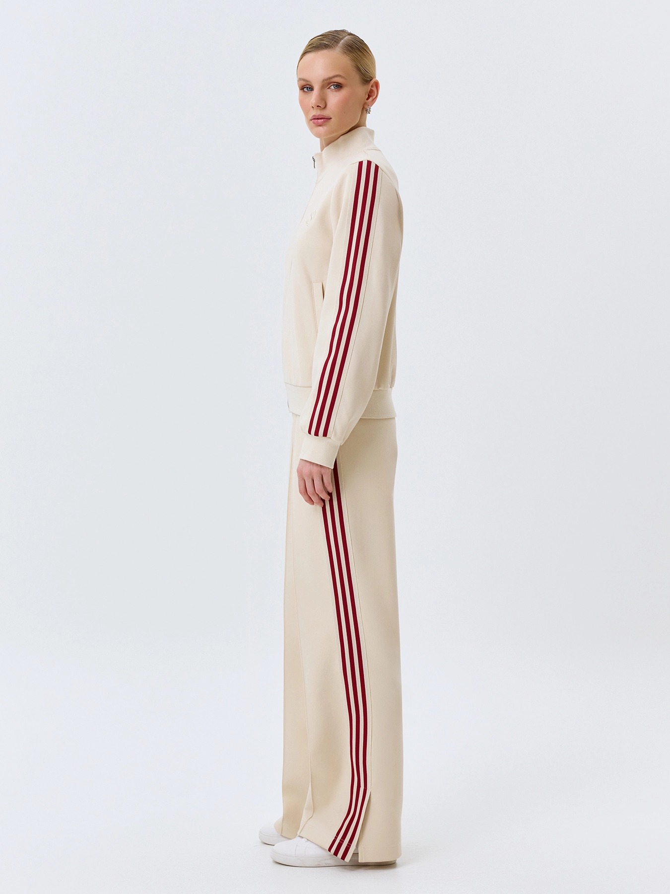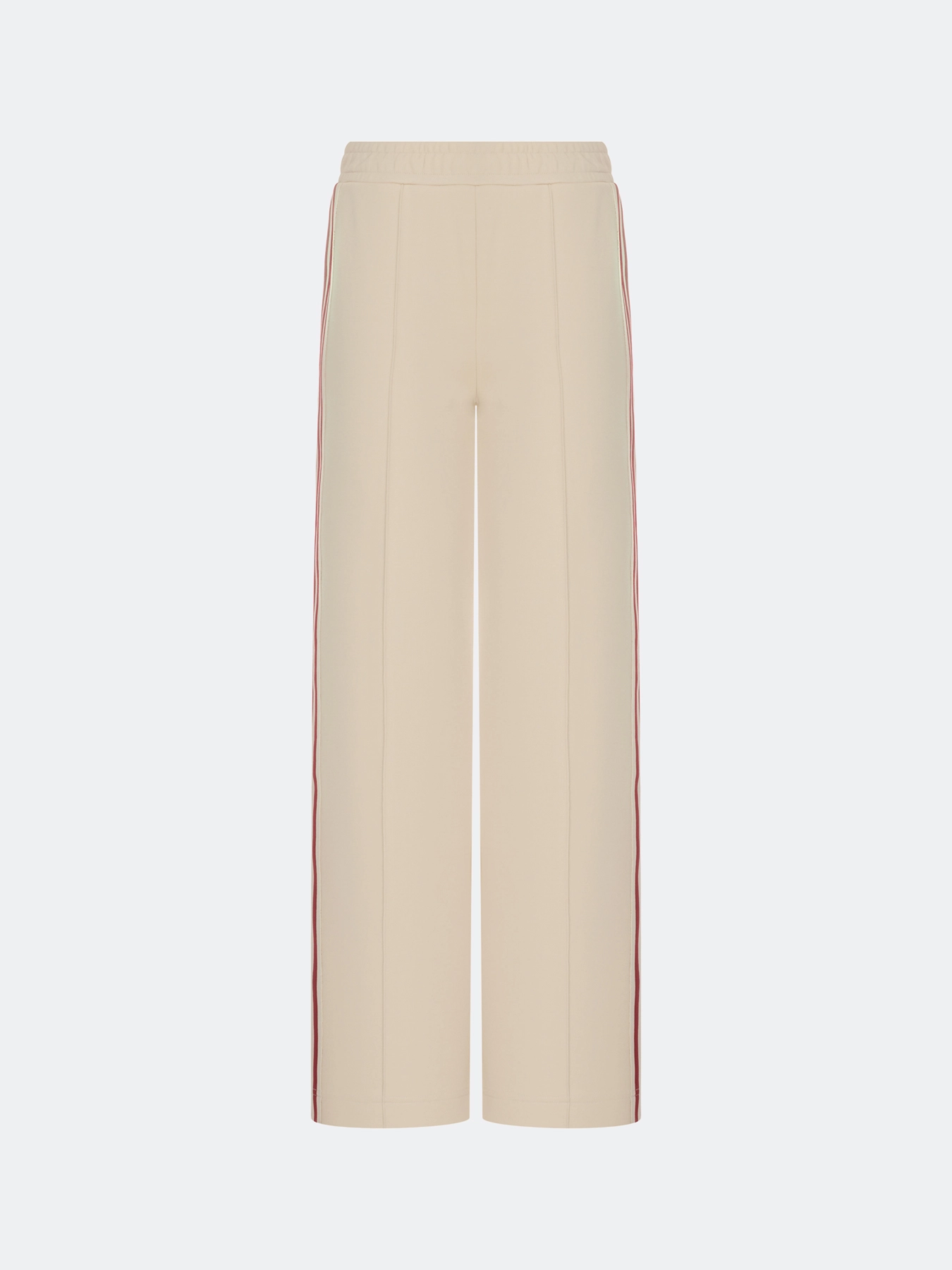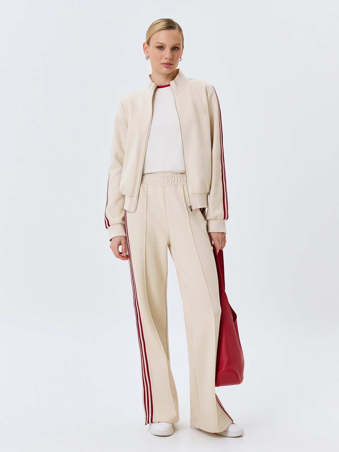 Трикотажные брюки с контрастными лампасами по боковым швам. Прямой силуэт. Дополнены застроченными стрелками. Небольшие разрезы по низу в боковых швах. Комплект с 63817.