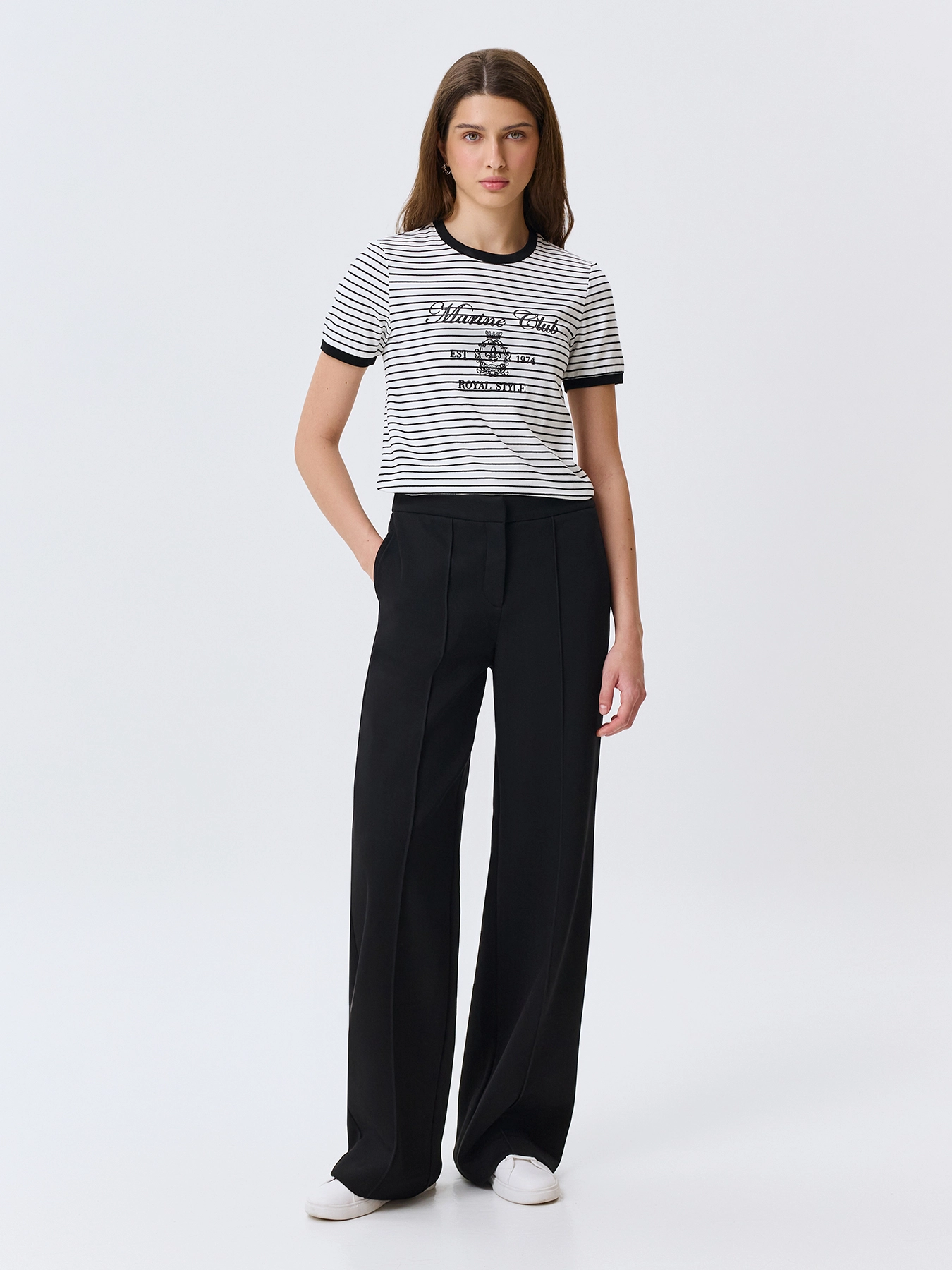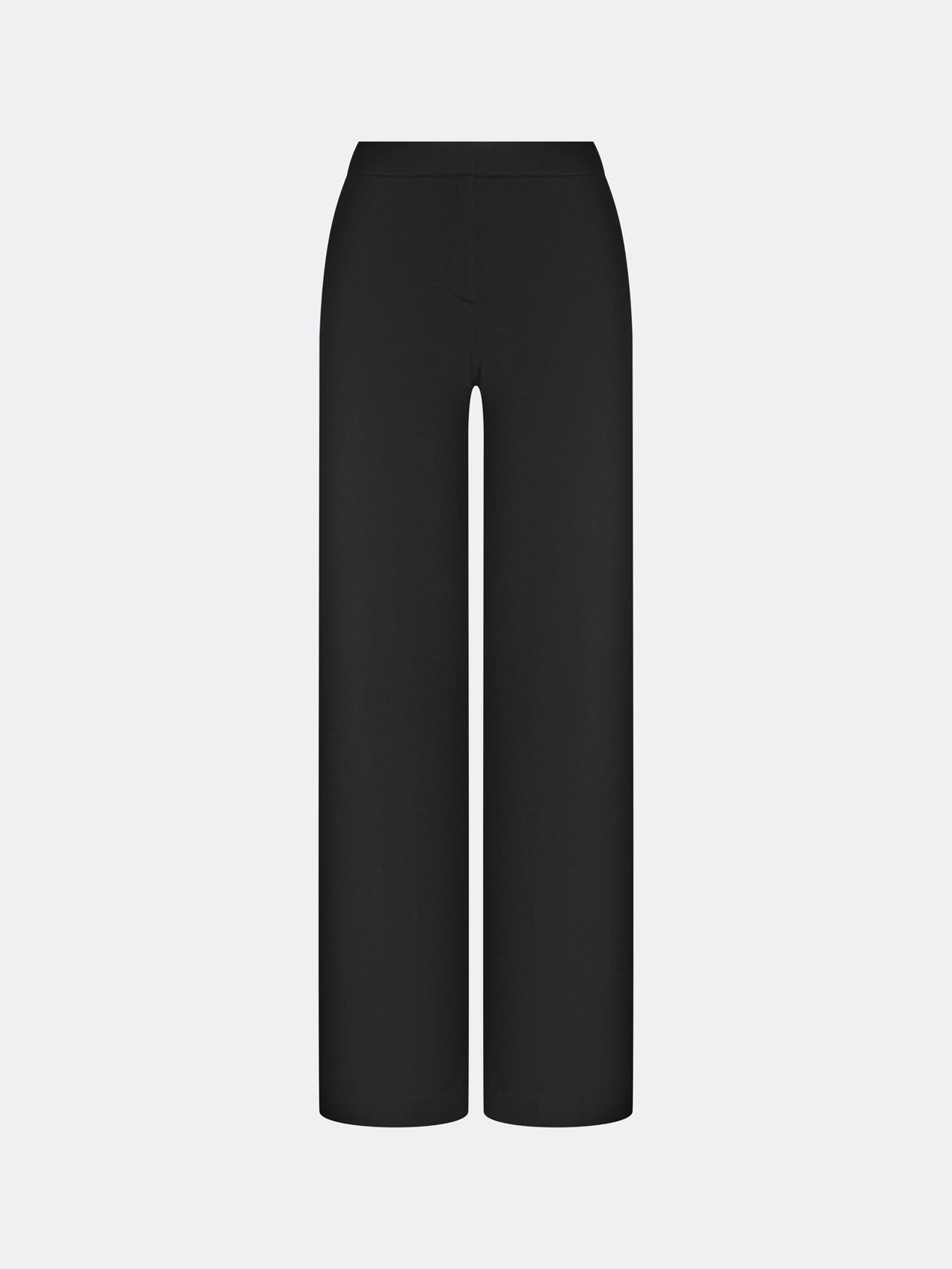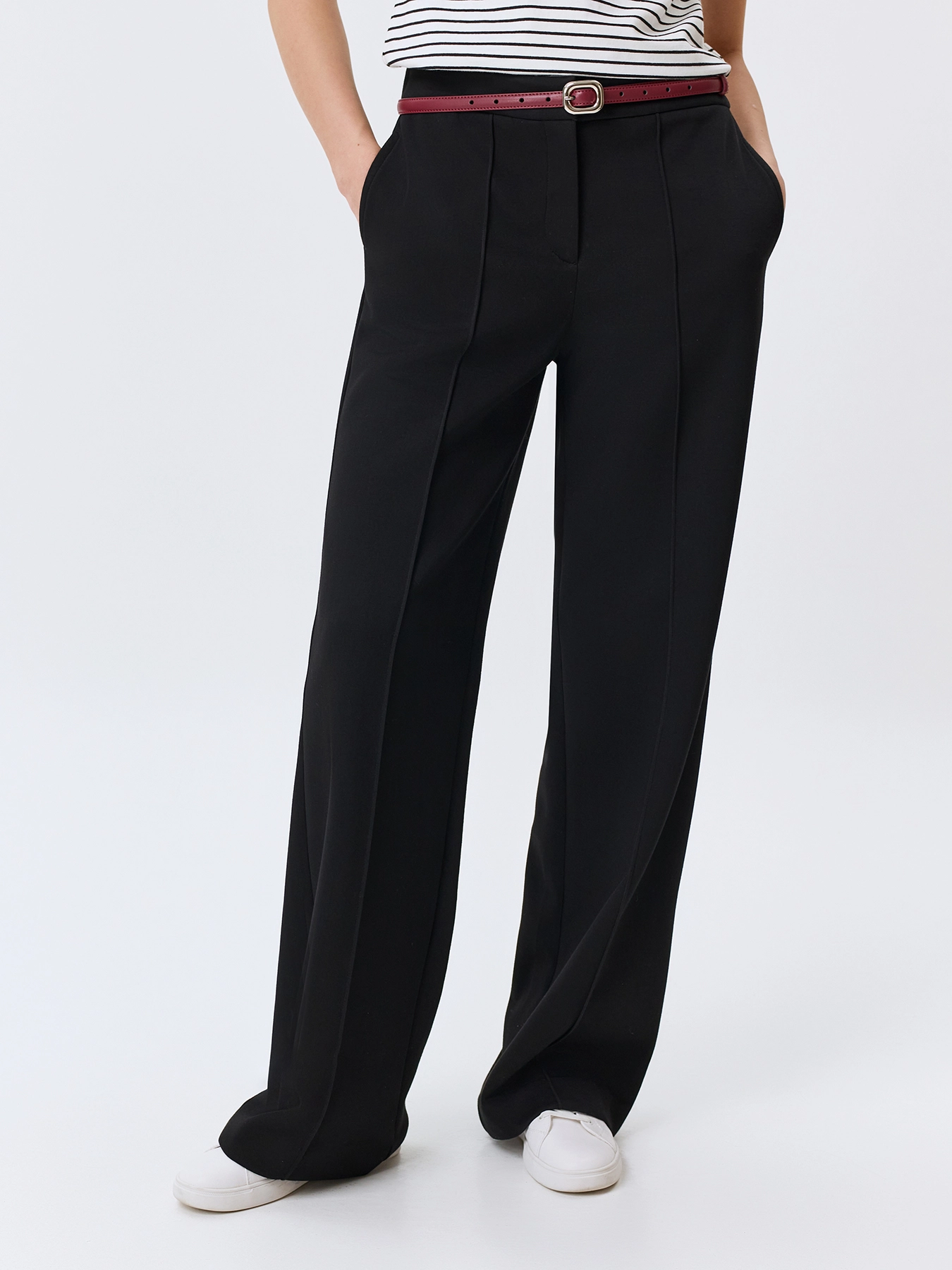 Комфортные брюки из трикотажной вискозы с простроченными стрелками. Прямой силуэт. Боковые карманы в швах. Застежка на молнию и пуговицу.