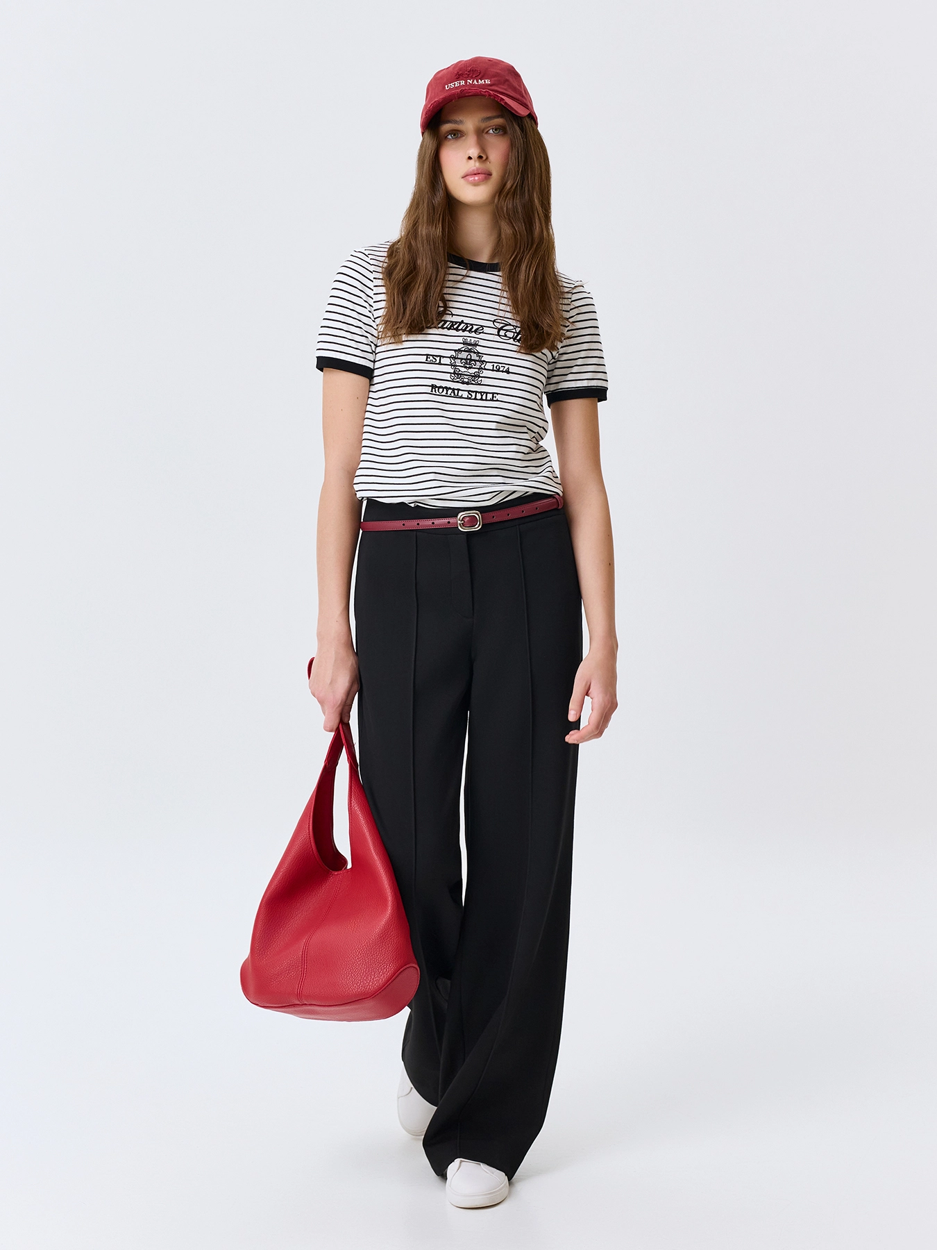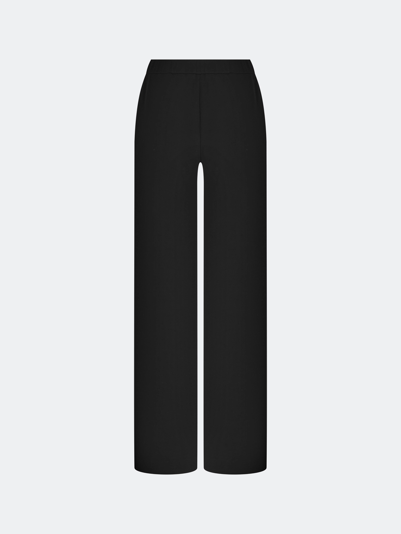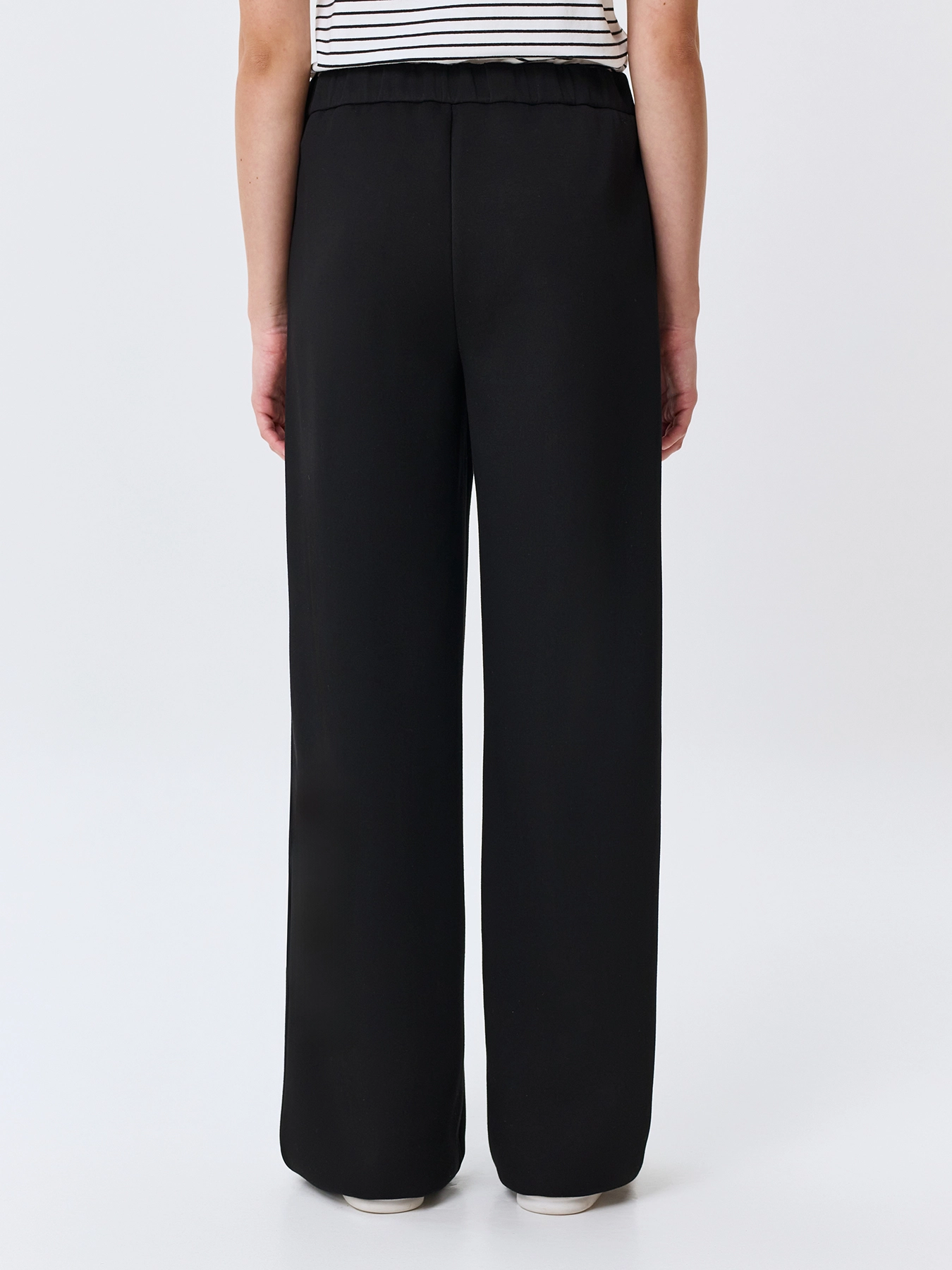 Комфортные брюки из трикотажной вискозы с простроченными стрелками. Прямой силуэт. Боковые карманы в швах. Застежка на молнию и пуговицу.