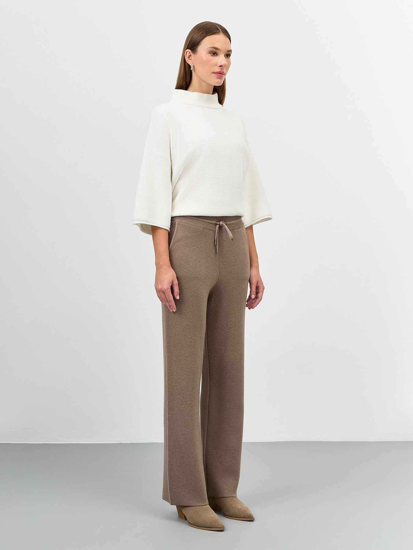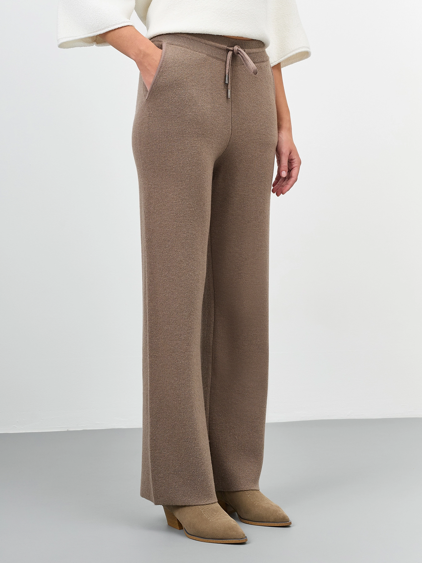 Свободные вязаные брюки с шерстью в составе прямого силуэта. Резинка и шнурок по линии талии. Боковые карманы в швах. Комплект с арт. 60907.
