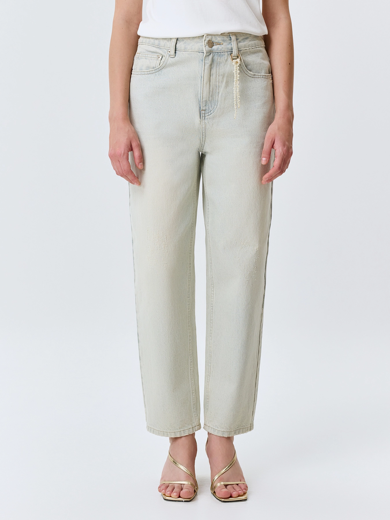 Джинсы бананы с ярким брелоком. Свободный силуэт немного заужен к низу. Застежка на молнию и металлическую пуговицу. Пять карманов. Дополнены деликатными потертостями.