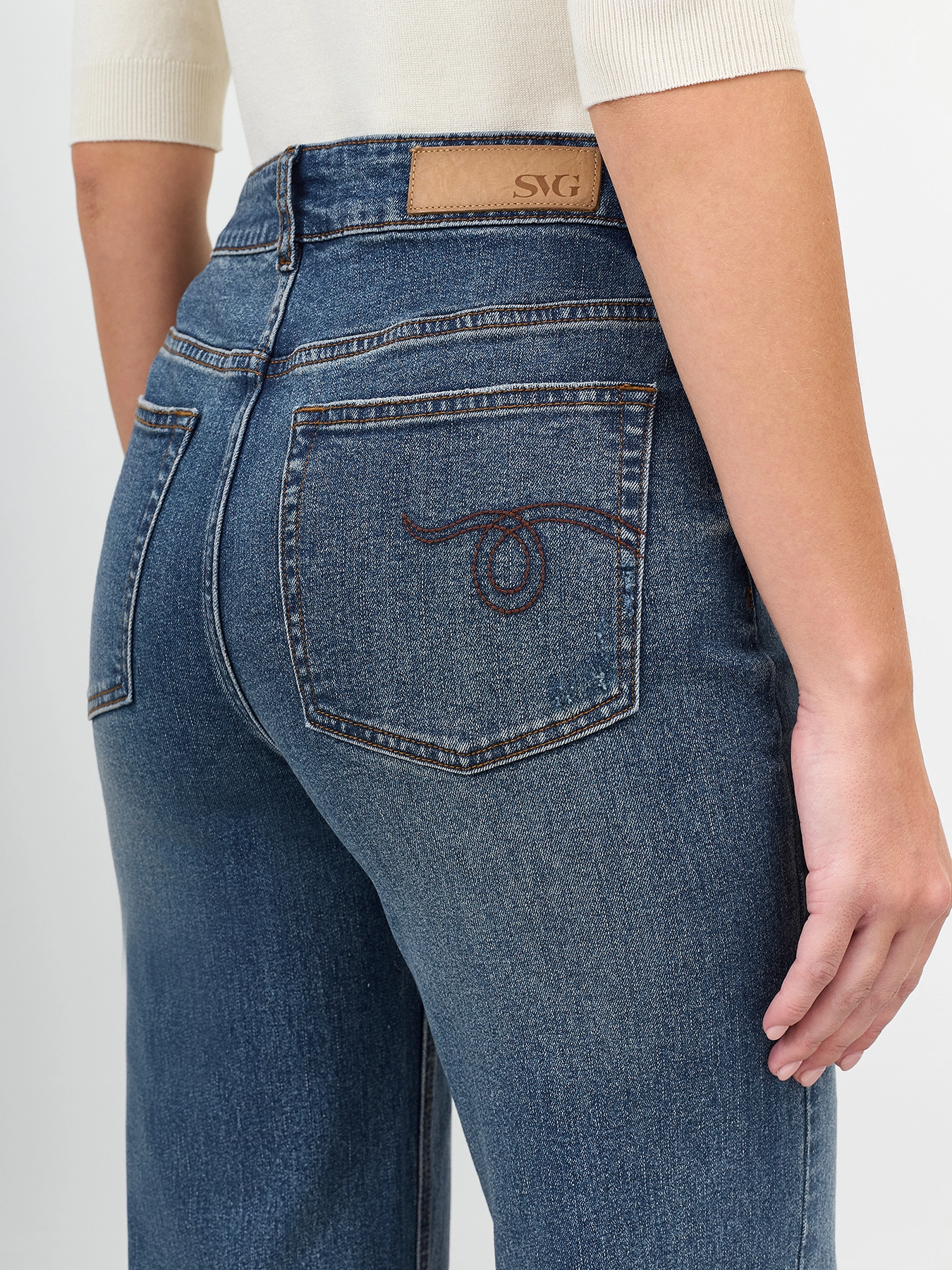 Джинсы Bootcut с деликатной варкой. Прямой силуэт расширен к низу. Застежка на молнию и металлическую пуговицу. Пять карманов. Минималистичная вышивка на заднем кармане. В составе спандекс.