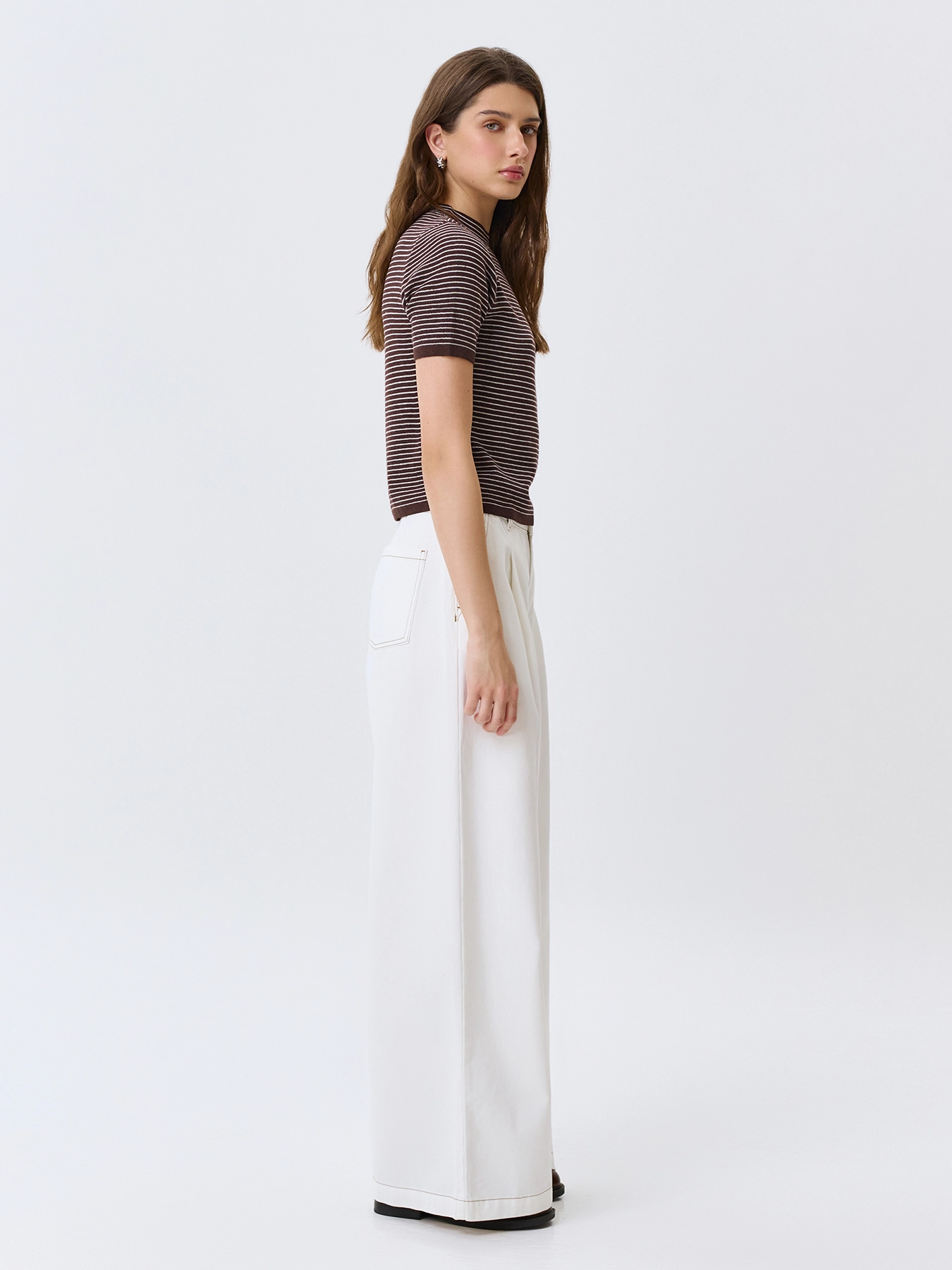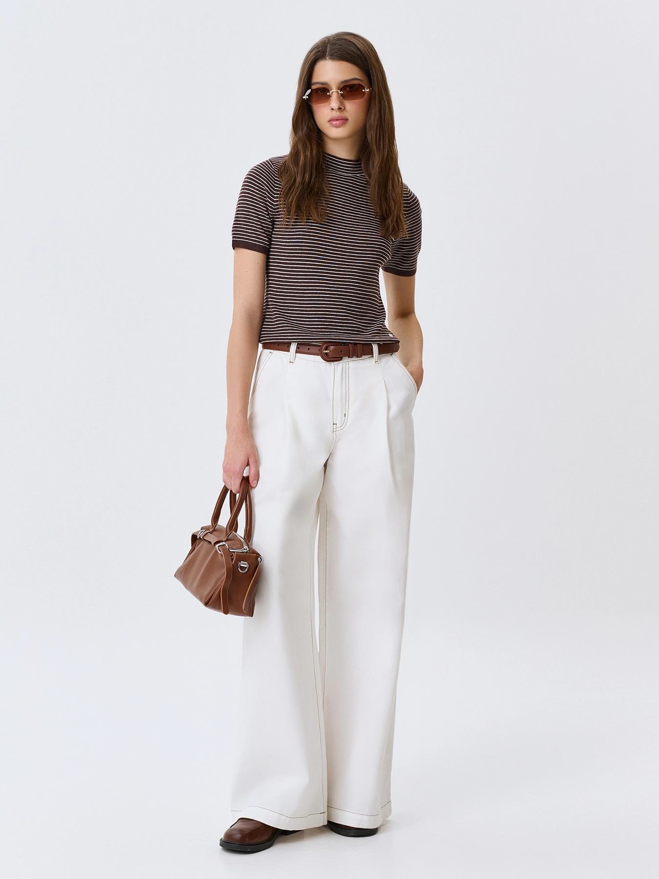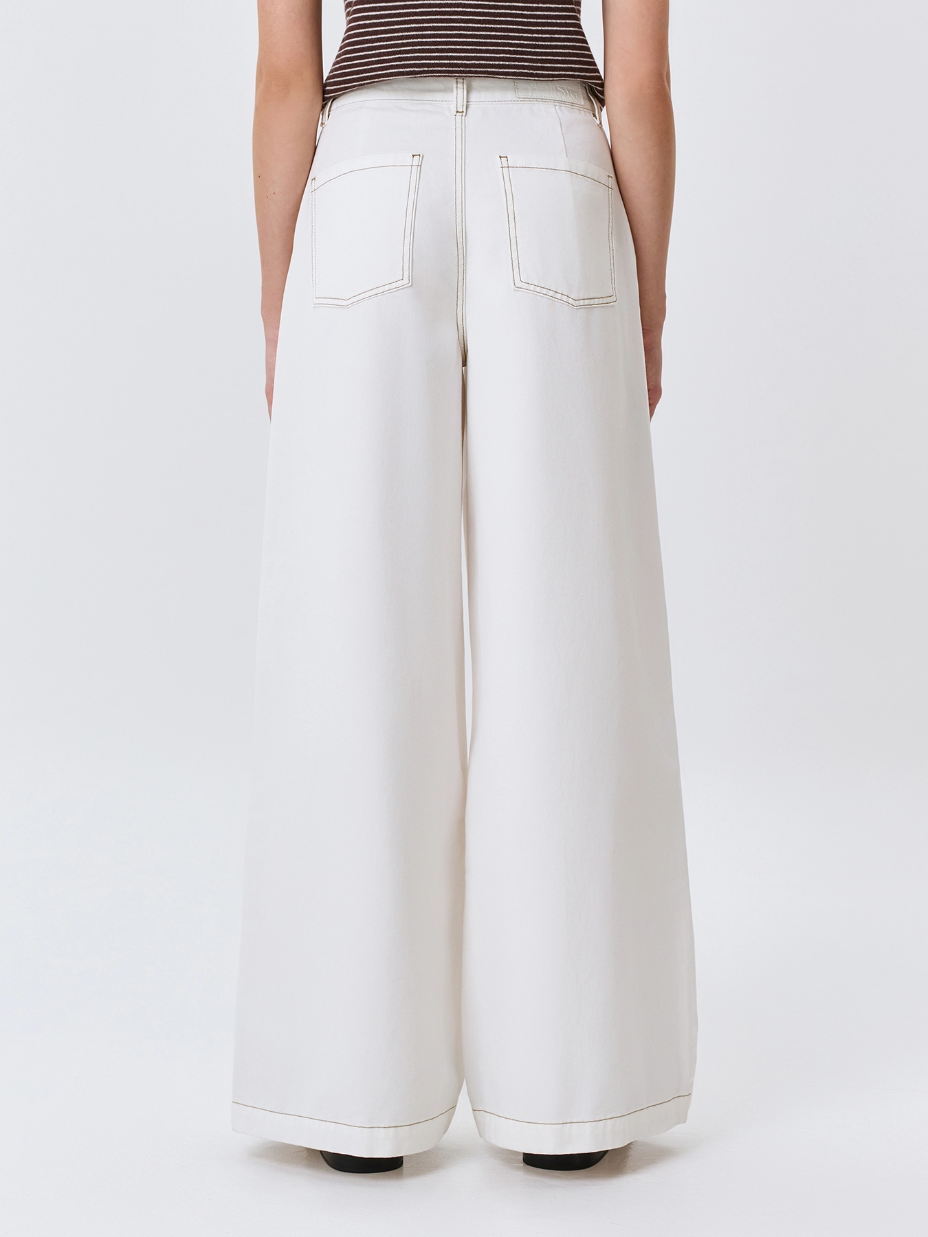 Тонкие широкие джинсы палаццо с акцентными складками. Свободный силуэт. Застежка на молнию и металлическую пуговицу. Пять карманов. Дополнены контрастной строчкой. В составе 100% хлопок.