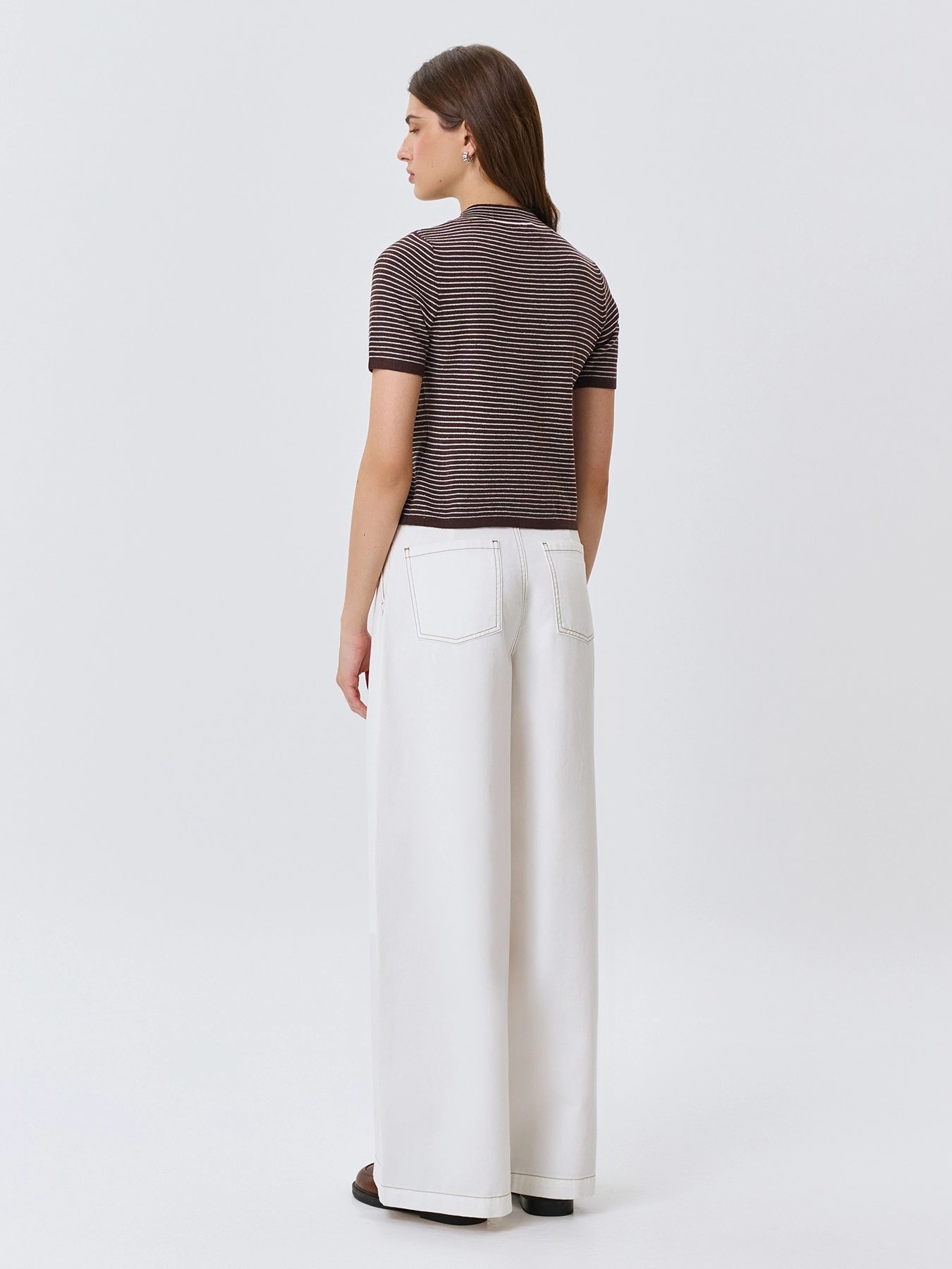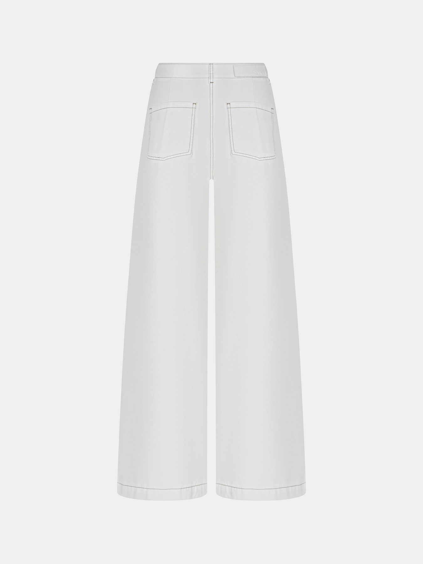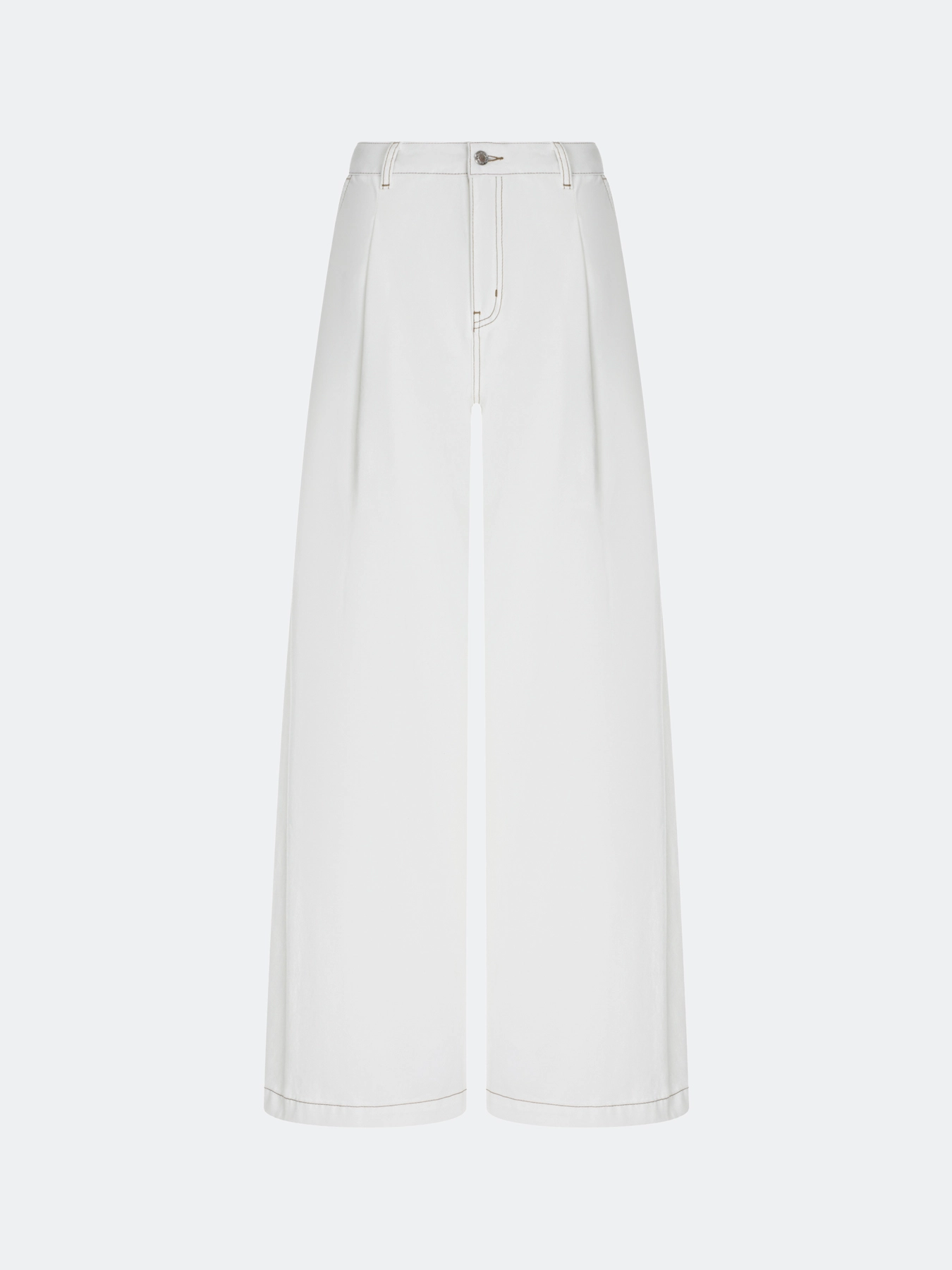 Тонкие широкие джинсы палаццо с акцентными складками. Свободный силуэт. Застежка на молнию и металлическую пуговицу. Пять карманов. Дополнены контрастной строчкой. В составе 100% хлопок.