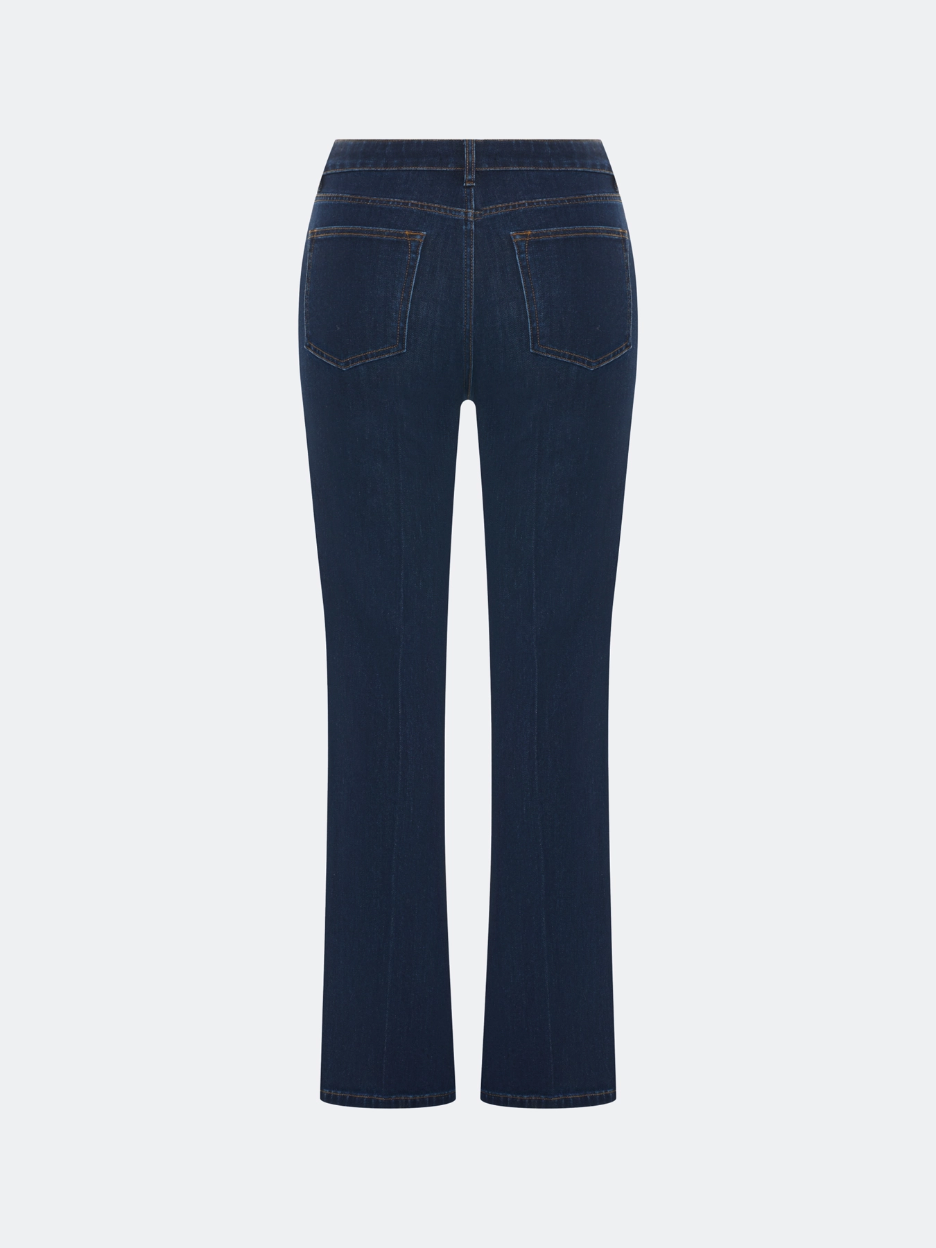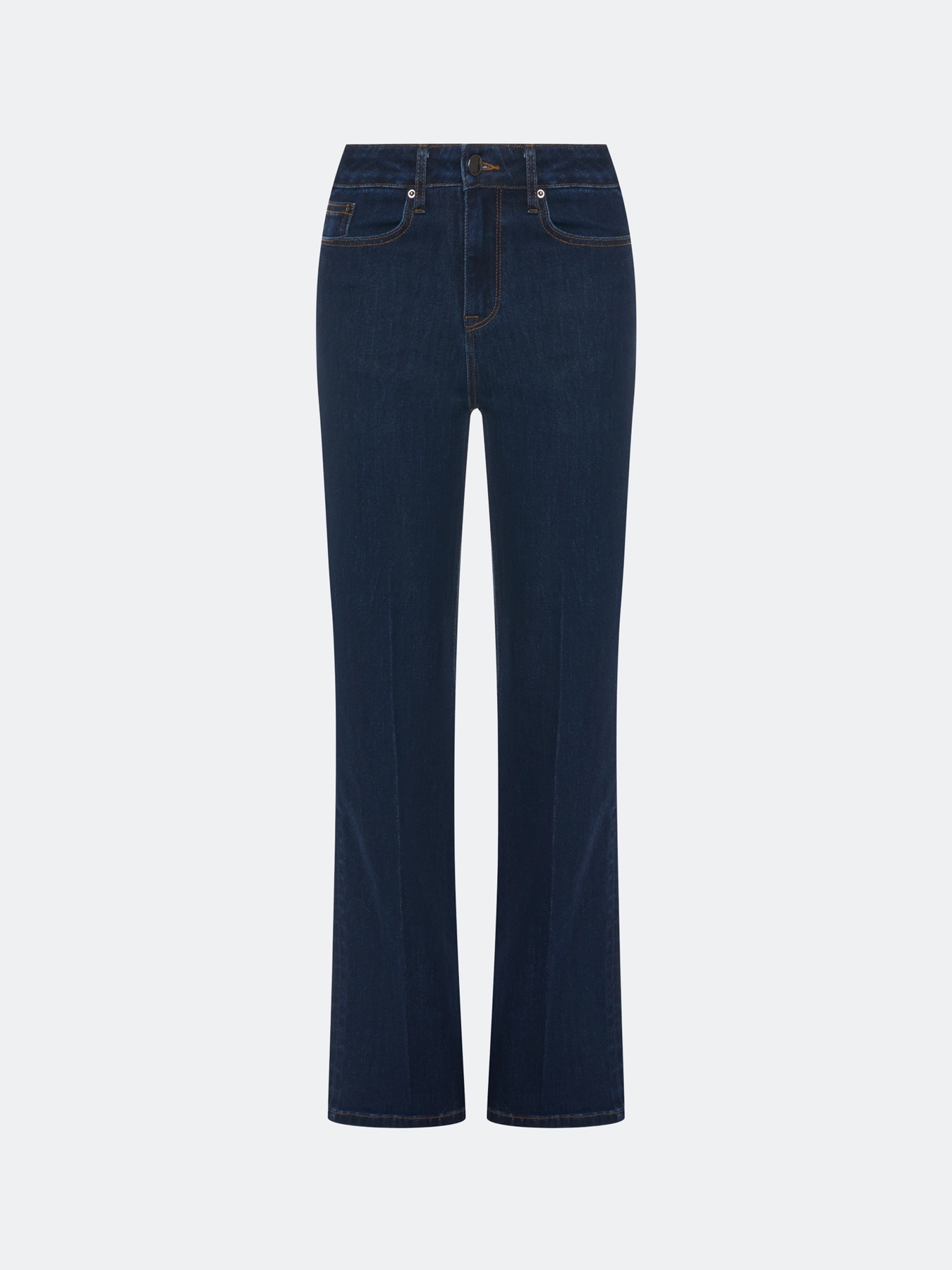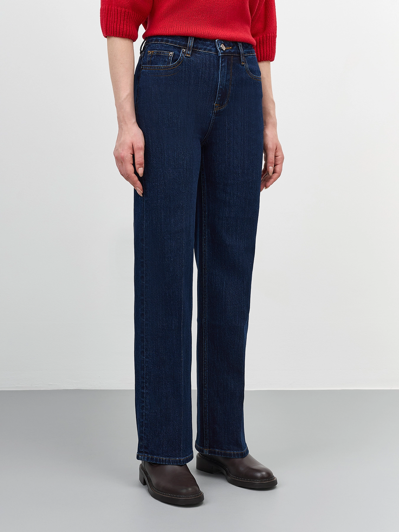 Джинсы из классического синего денима прямого силуэта со стрелками. Застежка на молнию и пуговицу. Пять карманов. В составе эластан.
